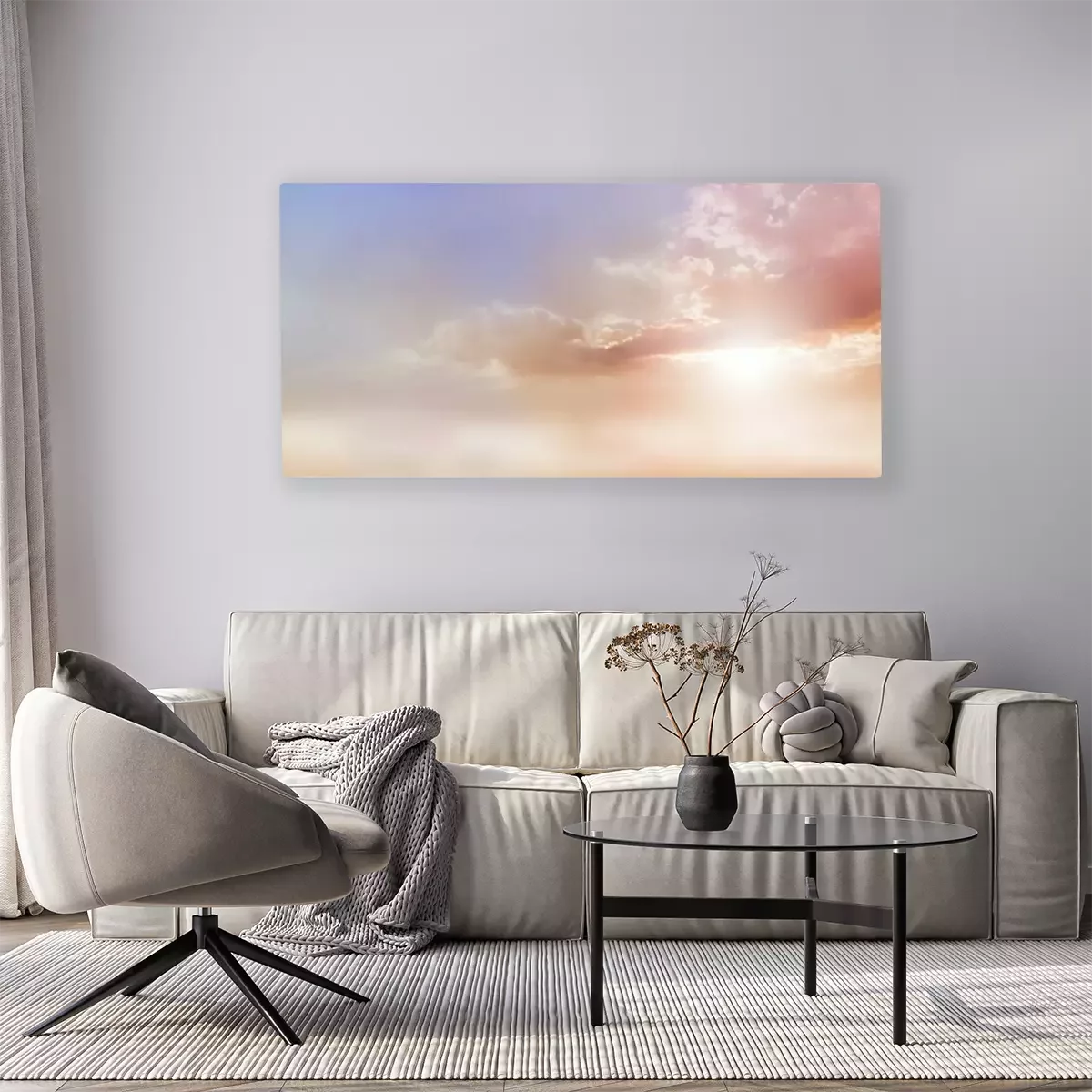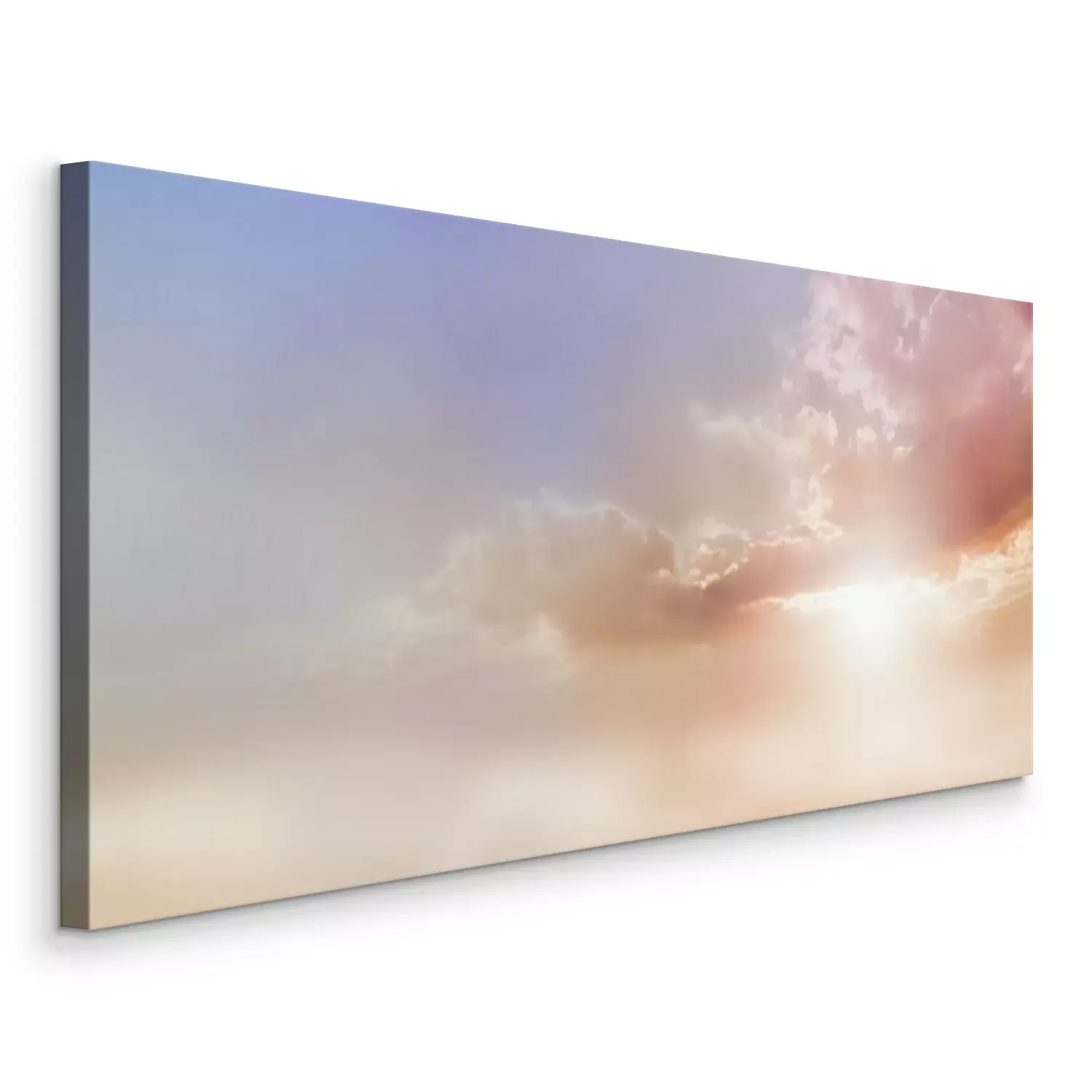 Canvas: Dromerige Romantische lucht scape - mooie brede perzik en schemerige lichtblauwe hemel en cloud scape met een uitbarsting van de zon die uit onder de wolk basis met voldoende ruimte kopie