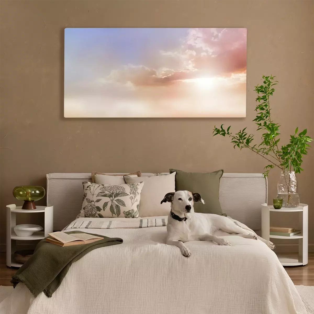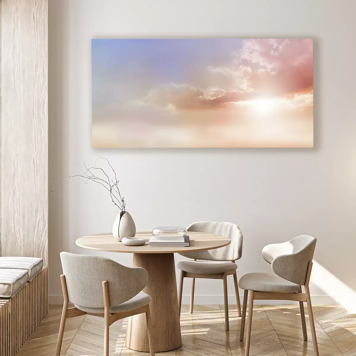 Canvas Dromerige Romantische lucht scape - mooie brede perzik en schemerige lichtblauwe hemel en cloud scape met een uitbarsting van de zon die uit onder de wolk basis met voldoende ruimte kopie