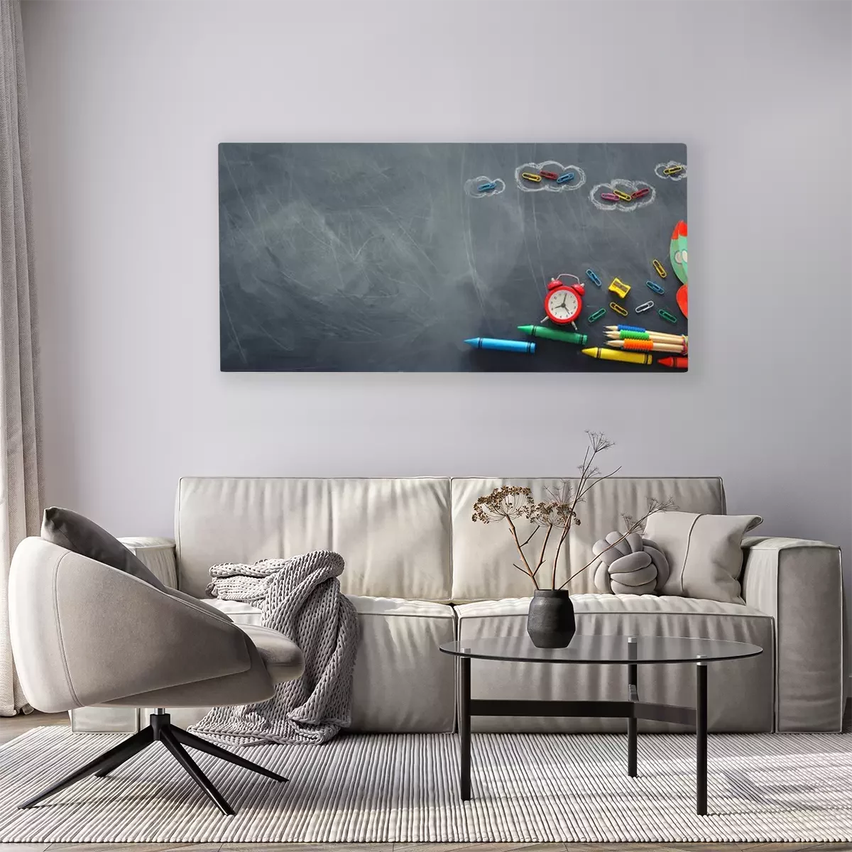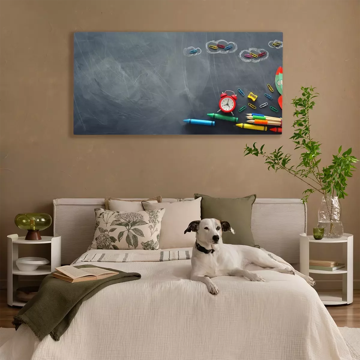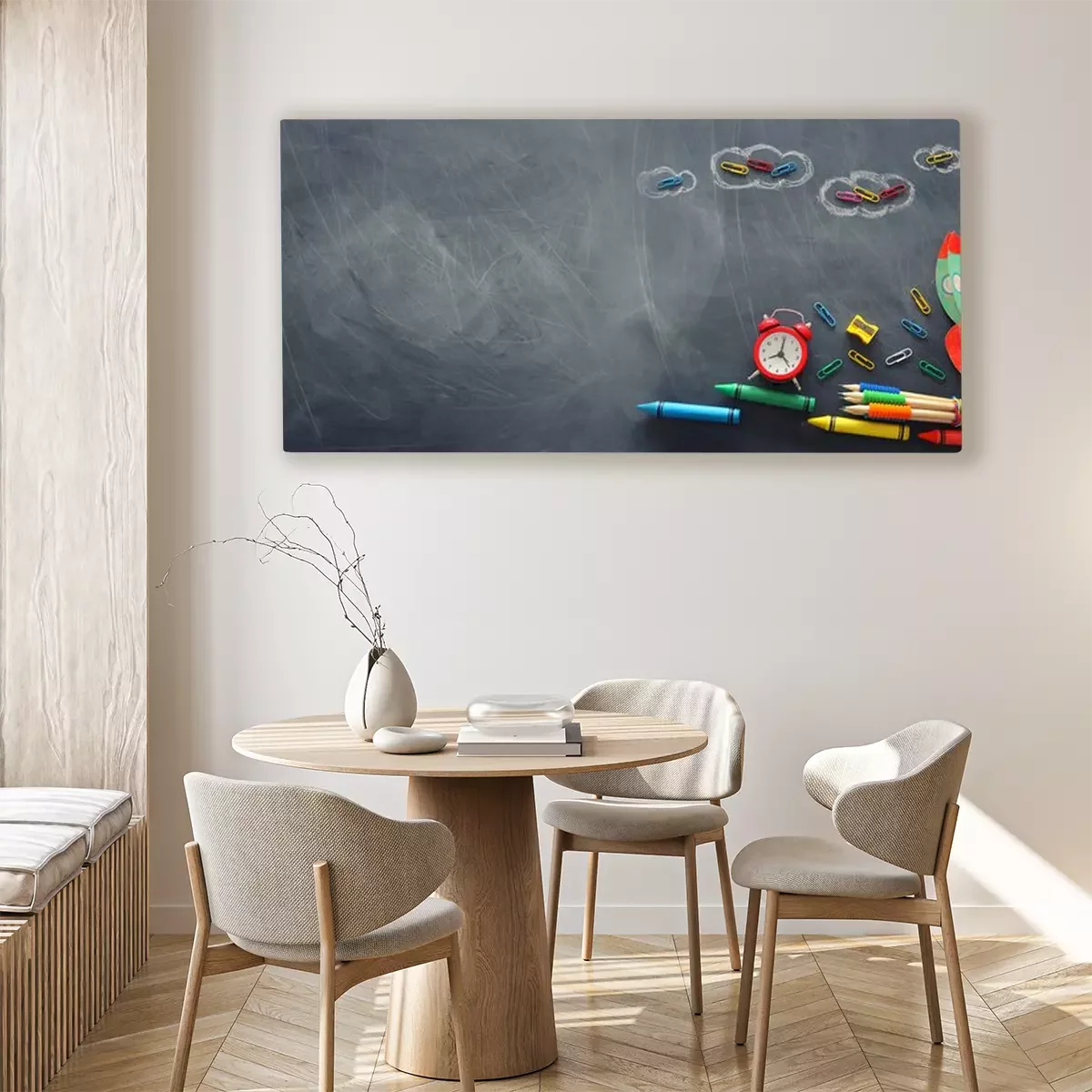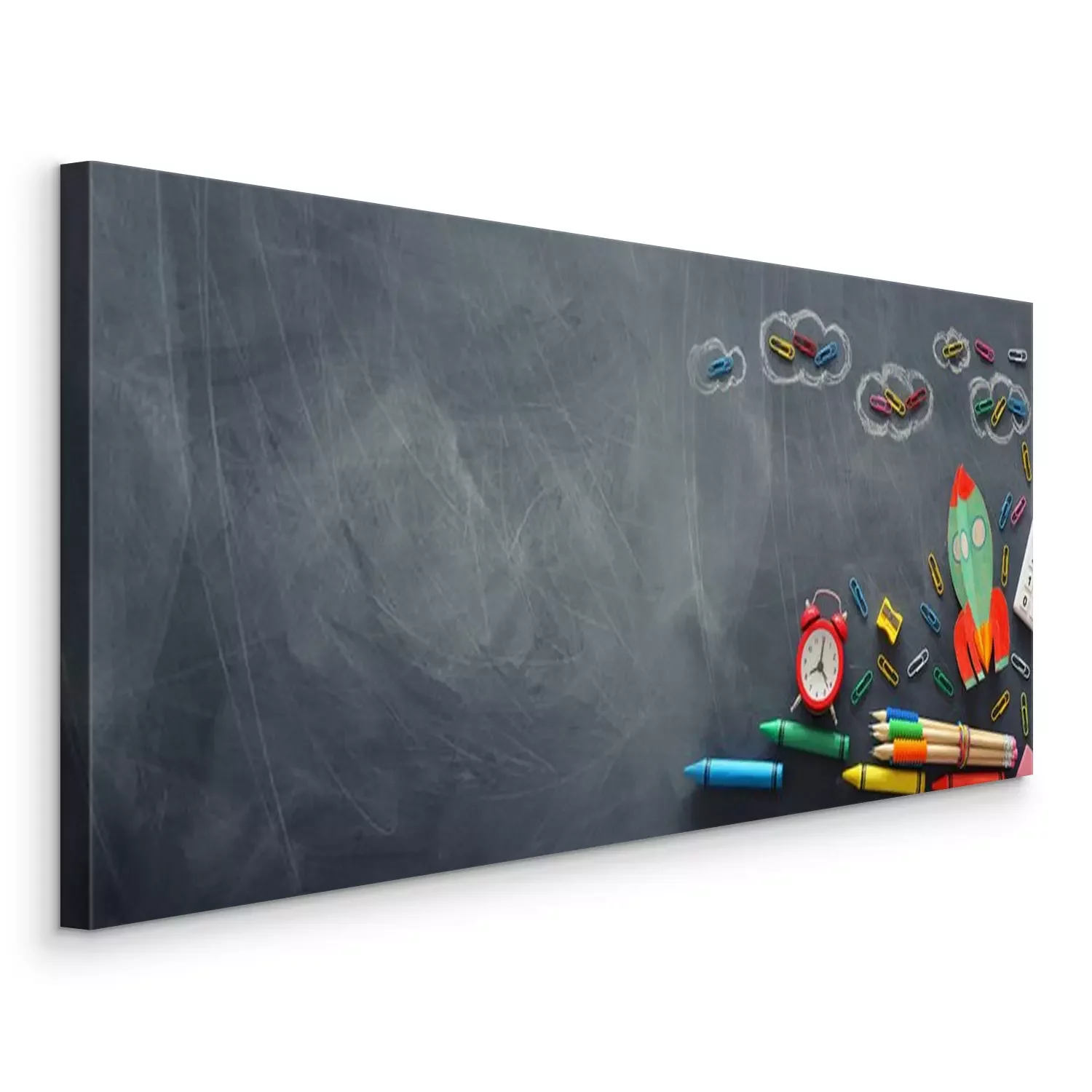 Canvas education. Back to school concept. rocket cut from paper and painted over blackboard background. top view, flat lay. banner