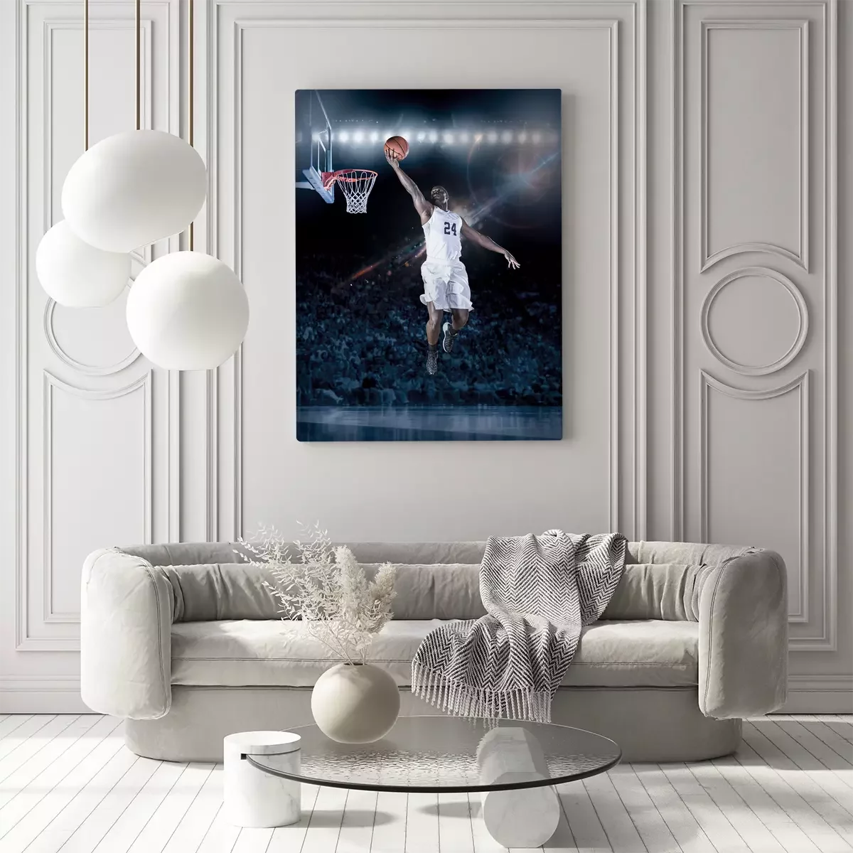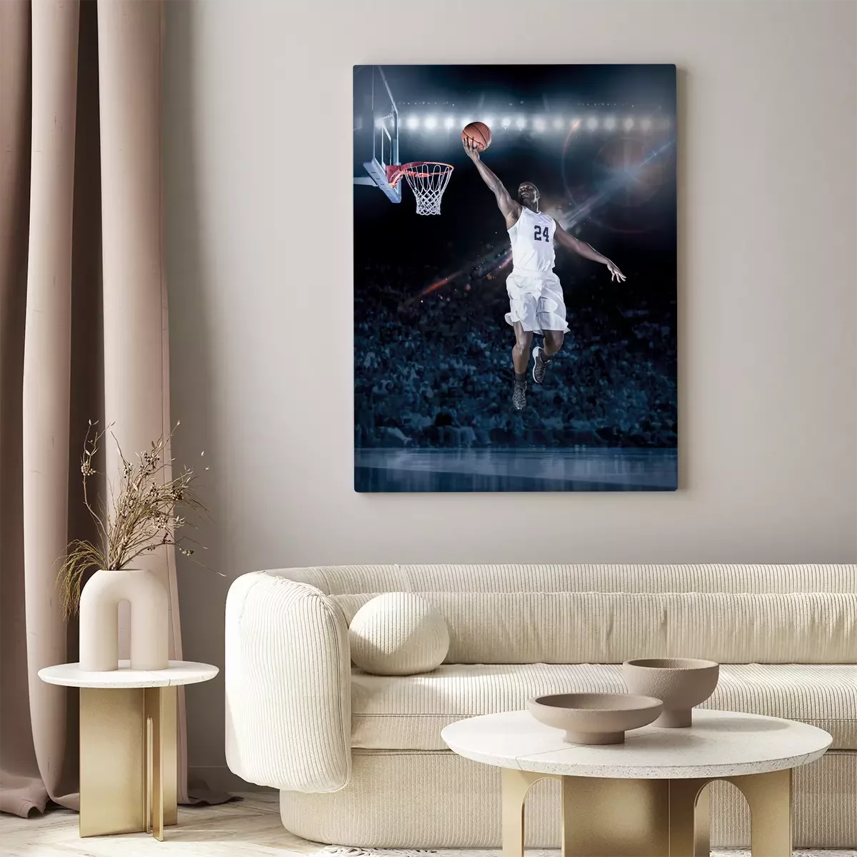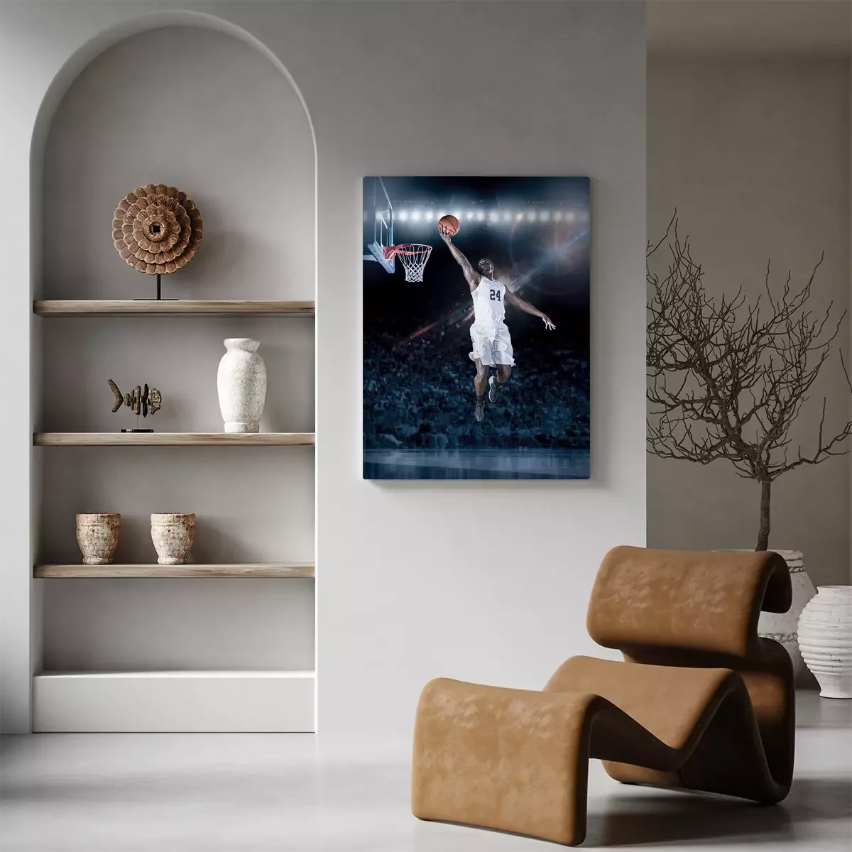 Een basketballer in een jump shot onder de basket