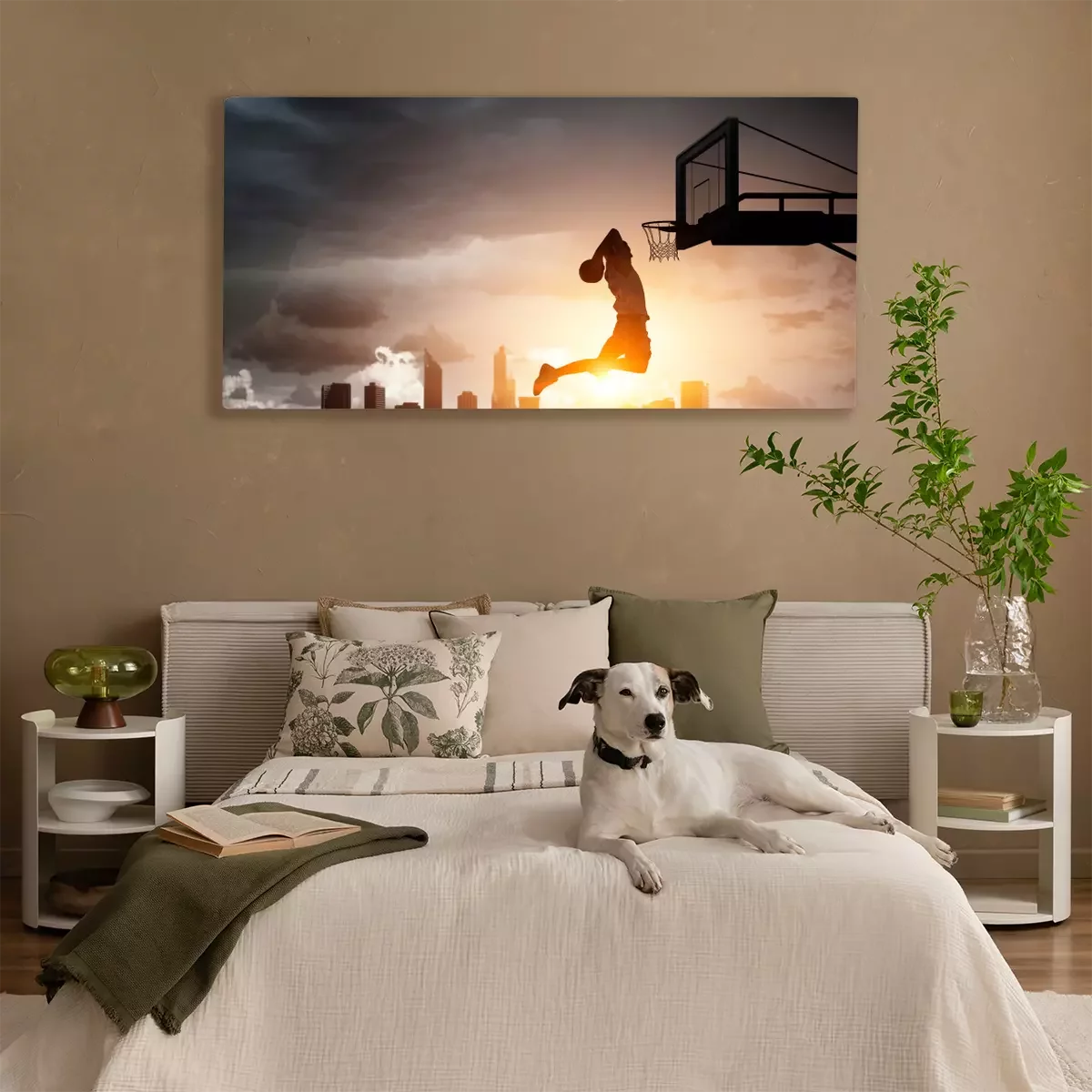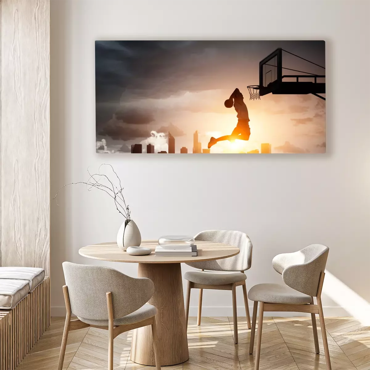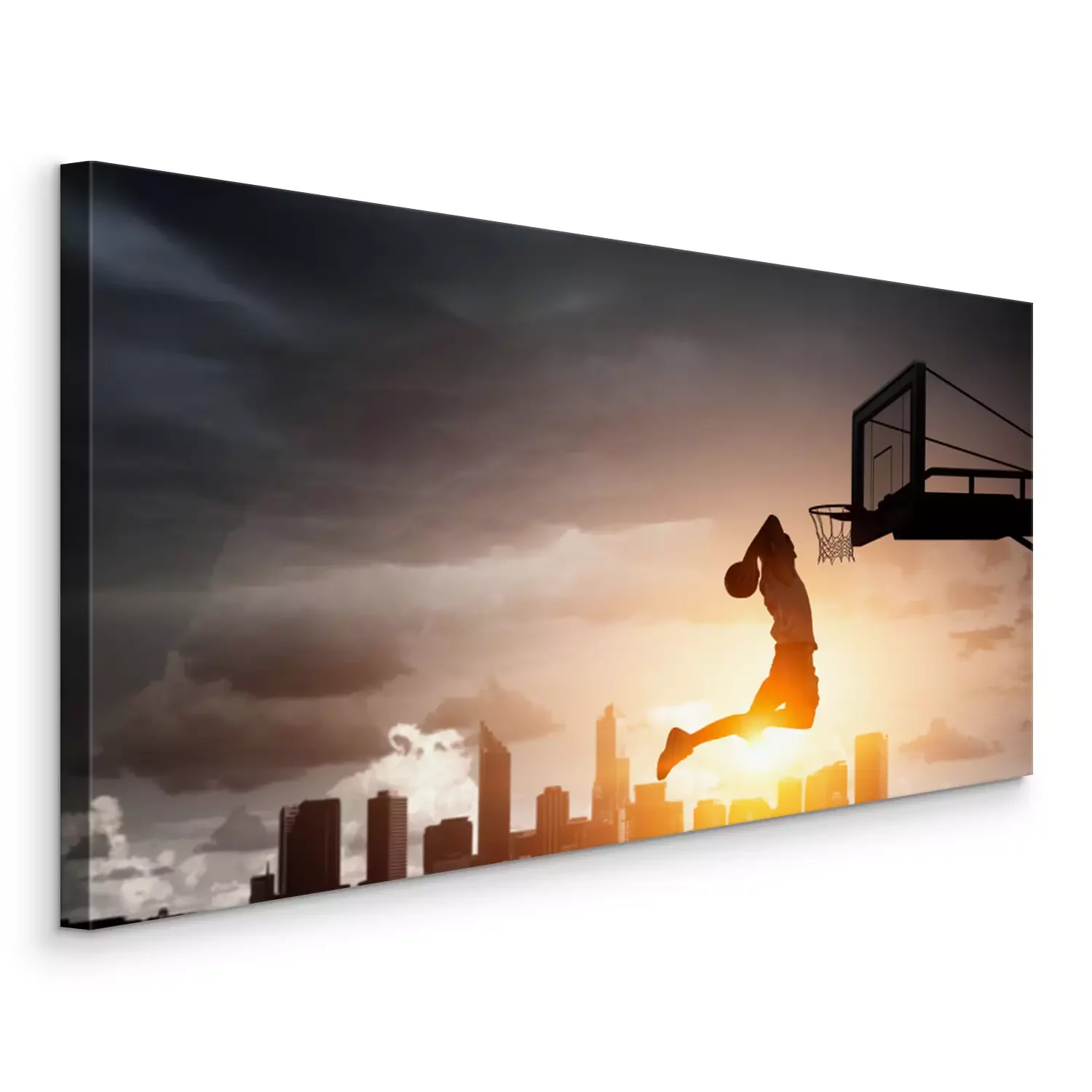 Canvas: Een basketballer met een bal in de basket tegen de achtergrond van de zonsondergang