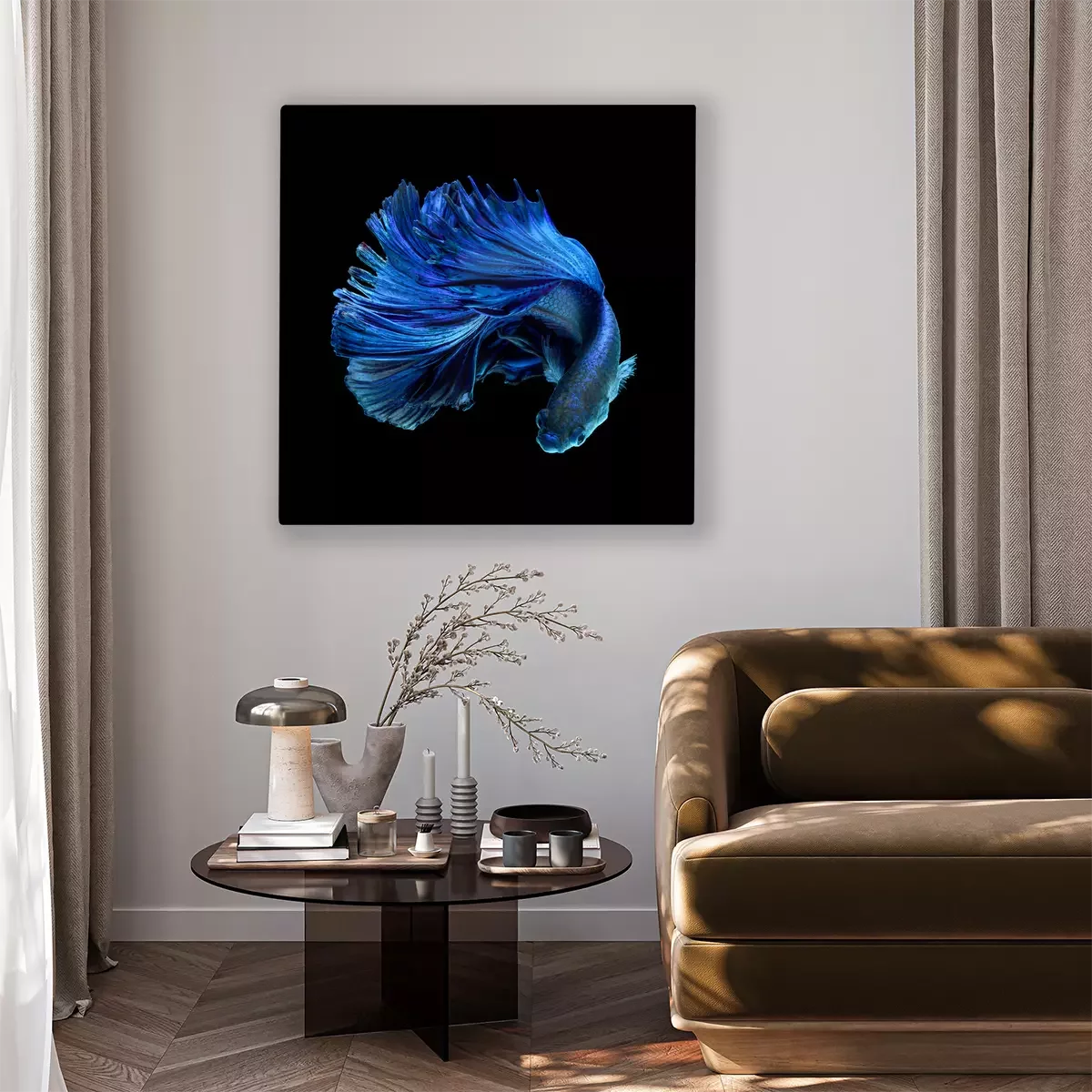Canvas: Een blauwe vis met een weelderige staart