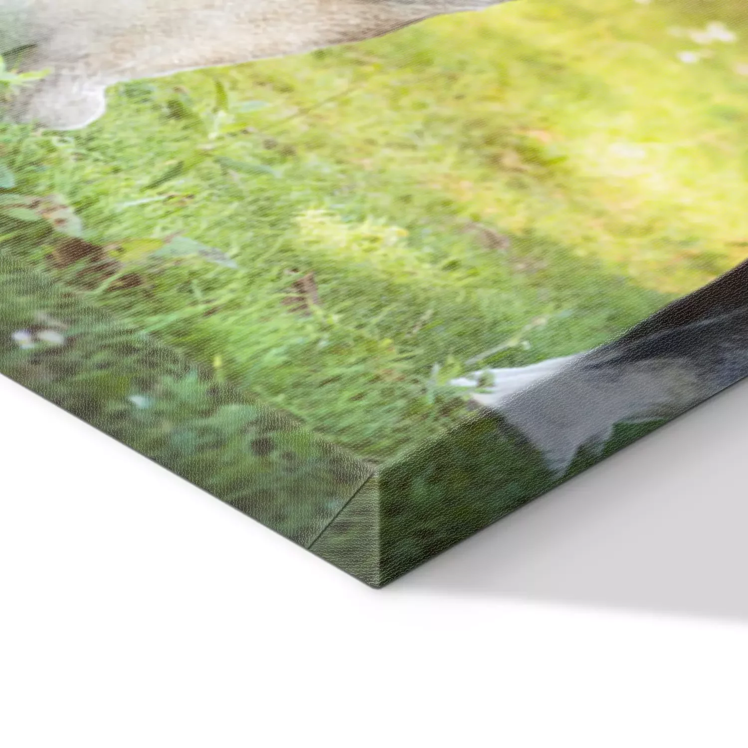 De print wordt aangebracht op hoogwaardig canvas dat op een schildersweefgetouw (spieraam) wordt gespannen. Omdat de print de zijranden bedekt, hoeft het ontwerp niet met een extra kader te worden omlijst. Wij raden ook composities aan die uit meerdere foto's bestaan en zo een coherente compositie vormen.
