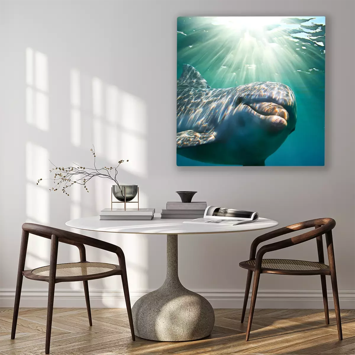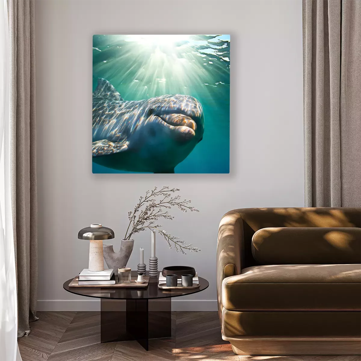 Canvas: Een dolfijn onderwater met zonnestralen. Close-up portret