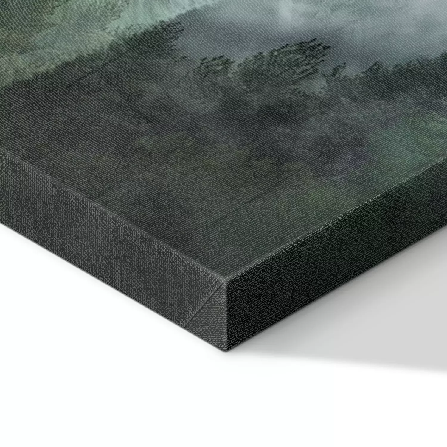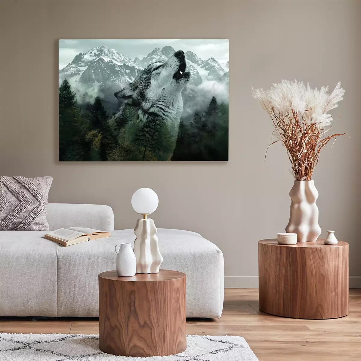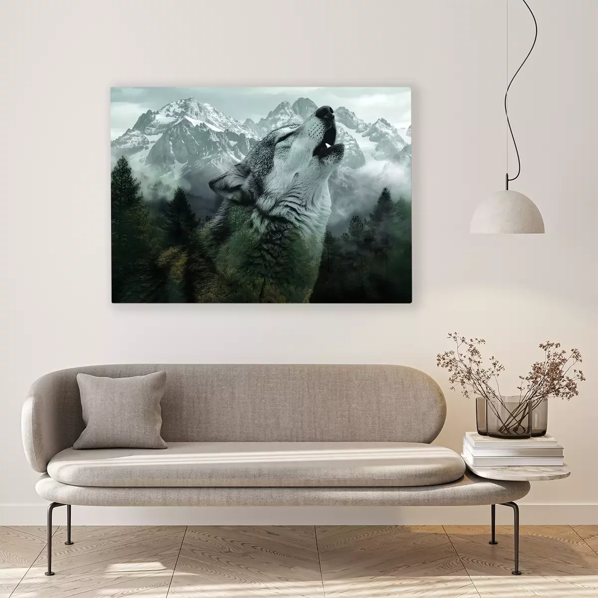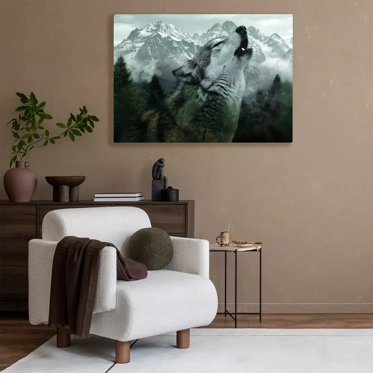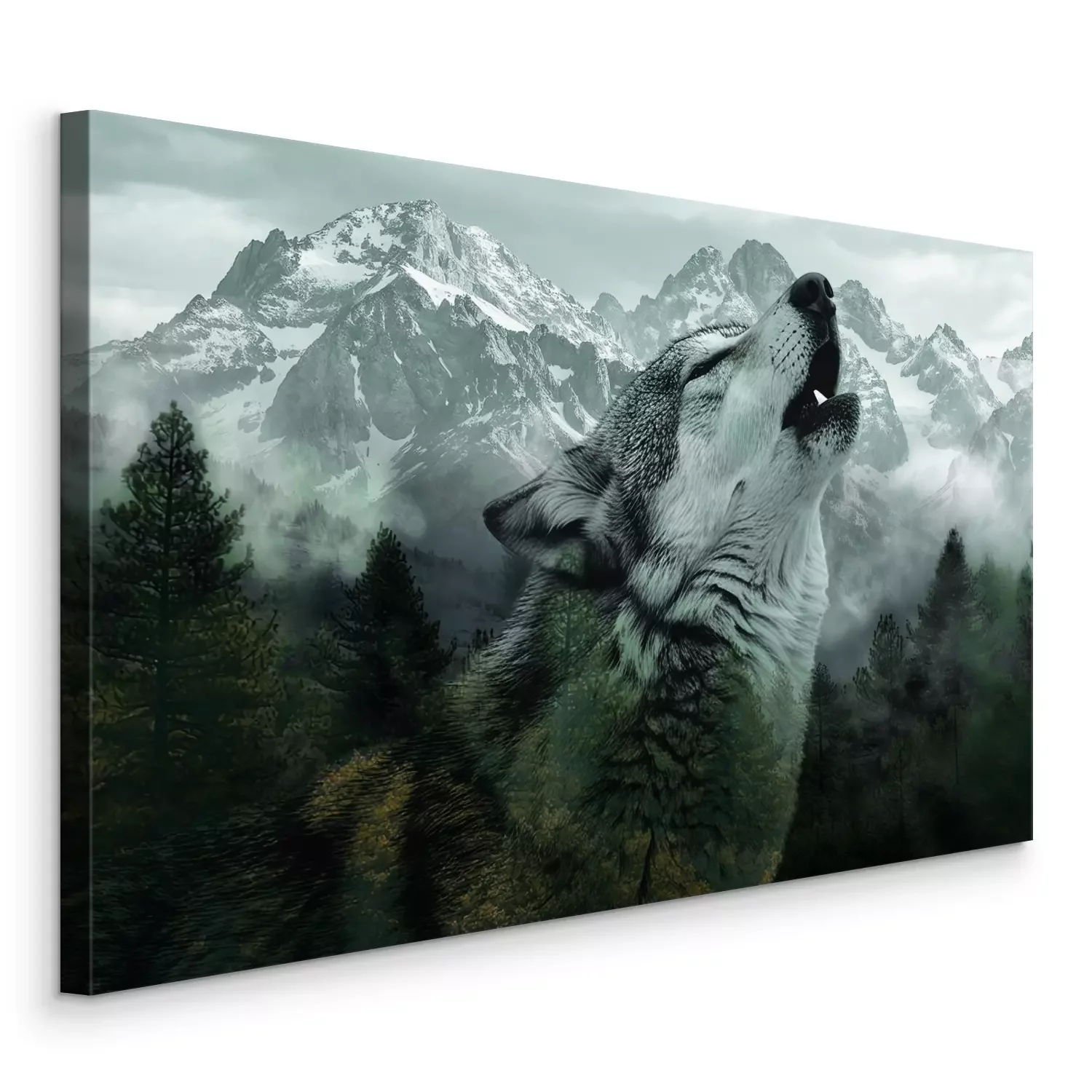 Een eenzame wolf tegen de achtergrond van bergen en dichte sparrenbomen