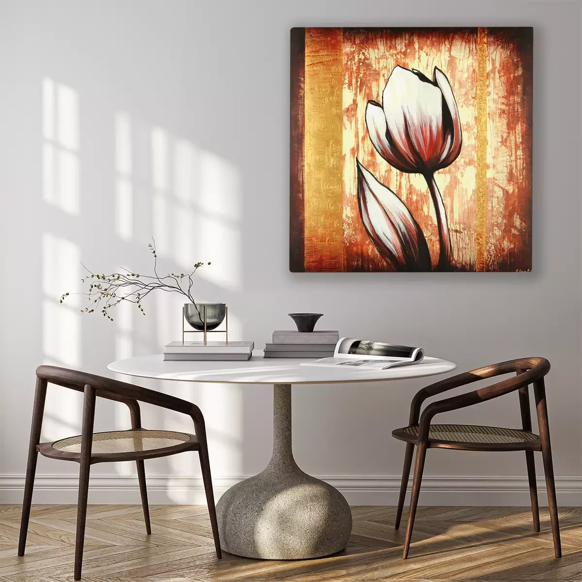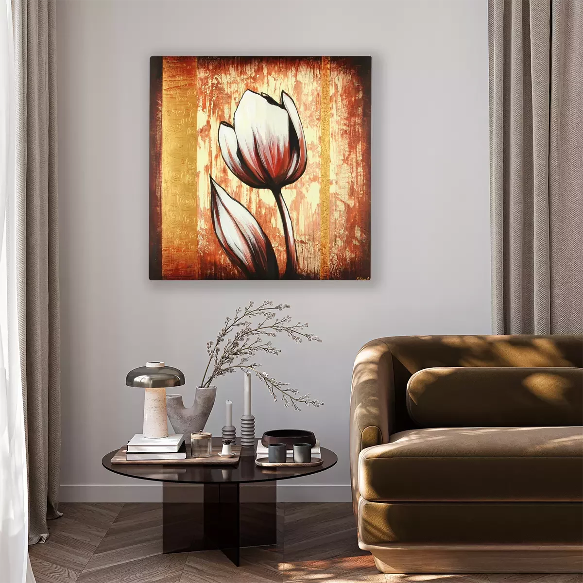 Een enkele tulp op een achtergrond met een decoratief gouden patroon