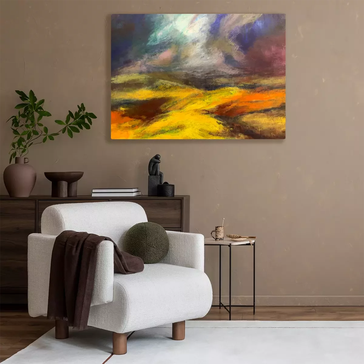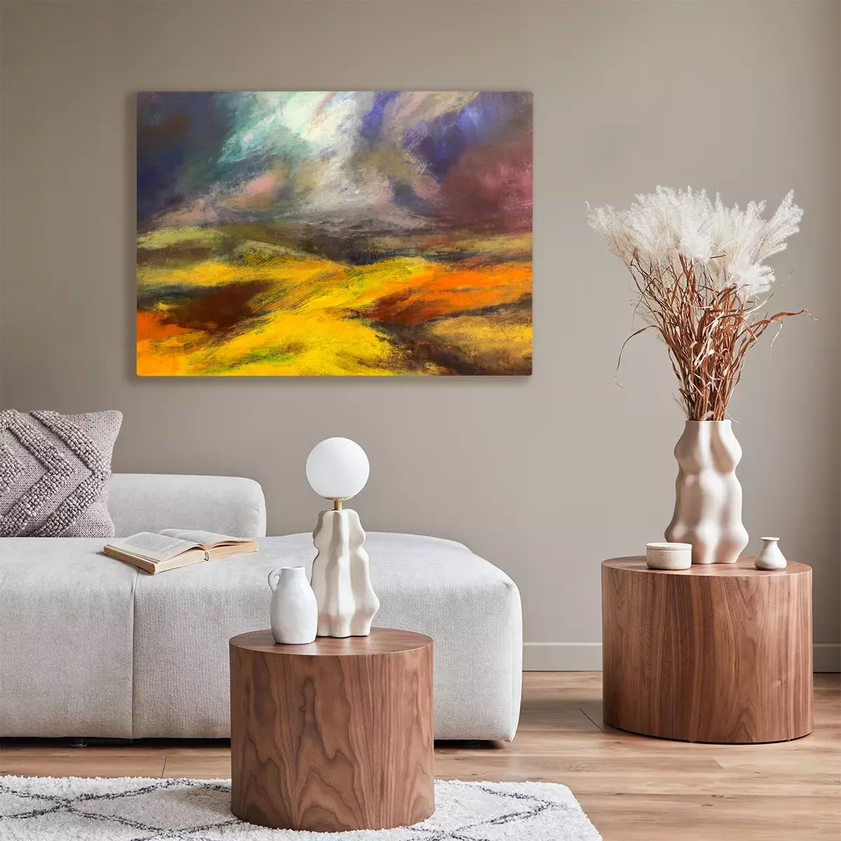 Een expressief landschap met een veld onder een bewolkte hemel.