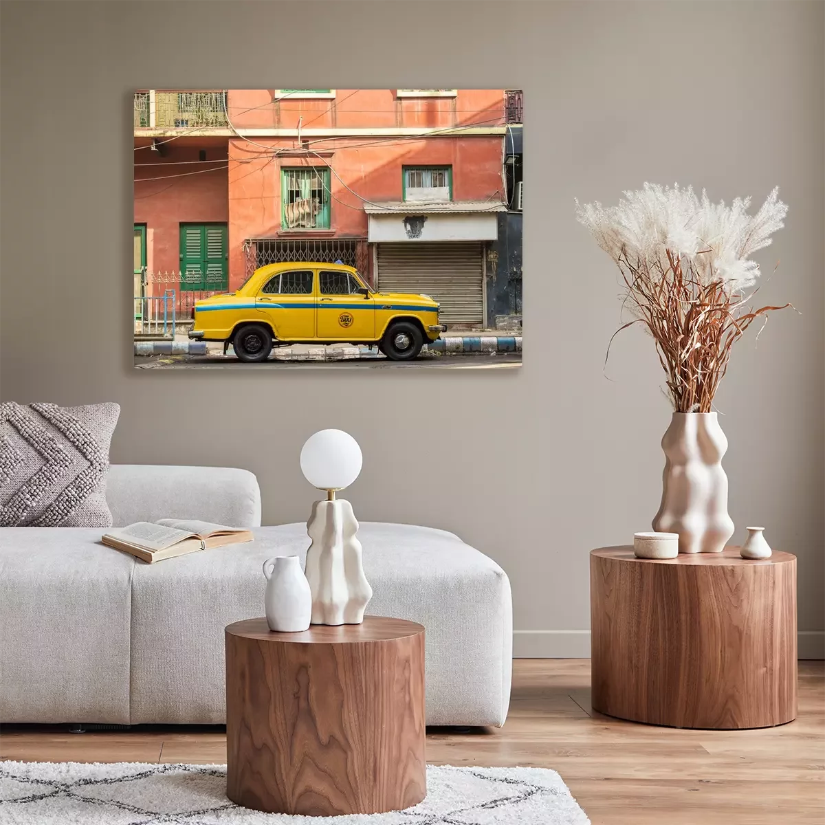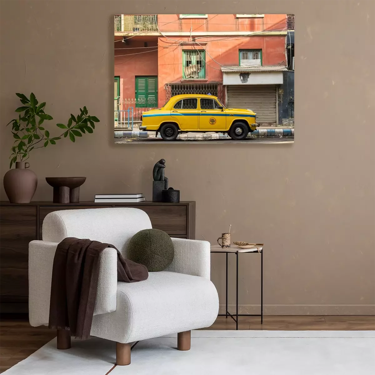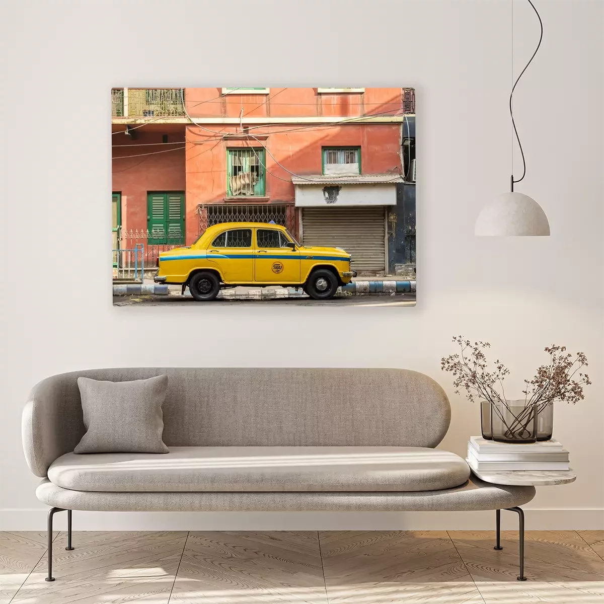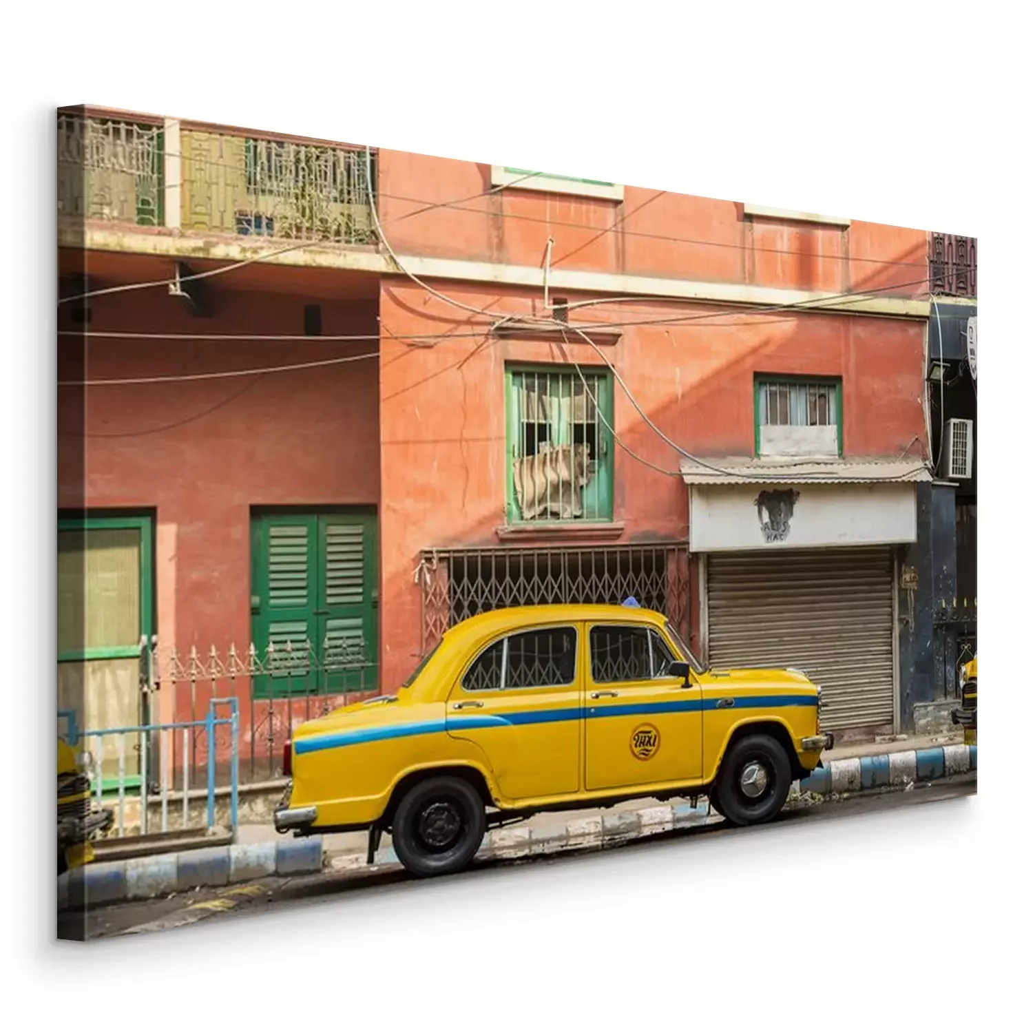 Canvas Een gele taxi van de ambassadeur staat geparkeerd op straat onder een roodgekleurd huis in Kolcata, India