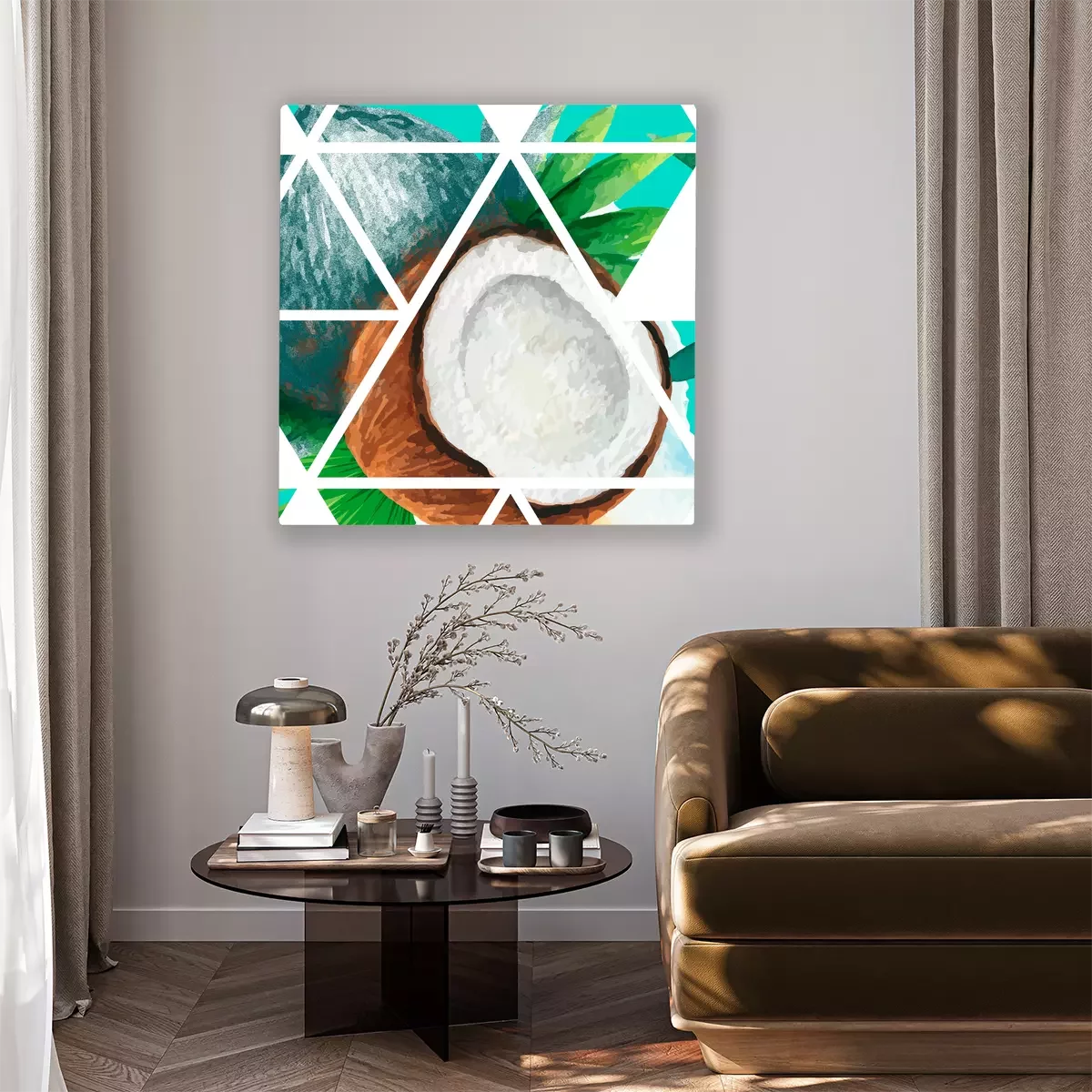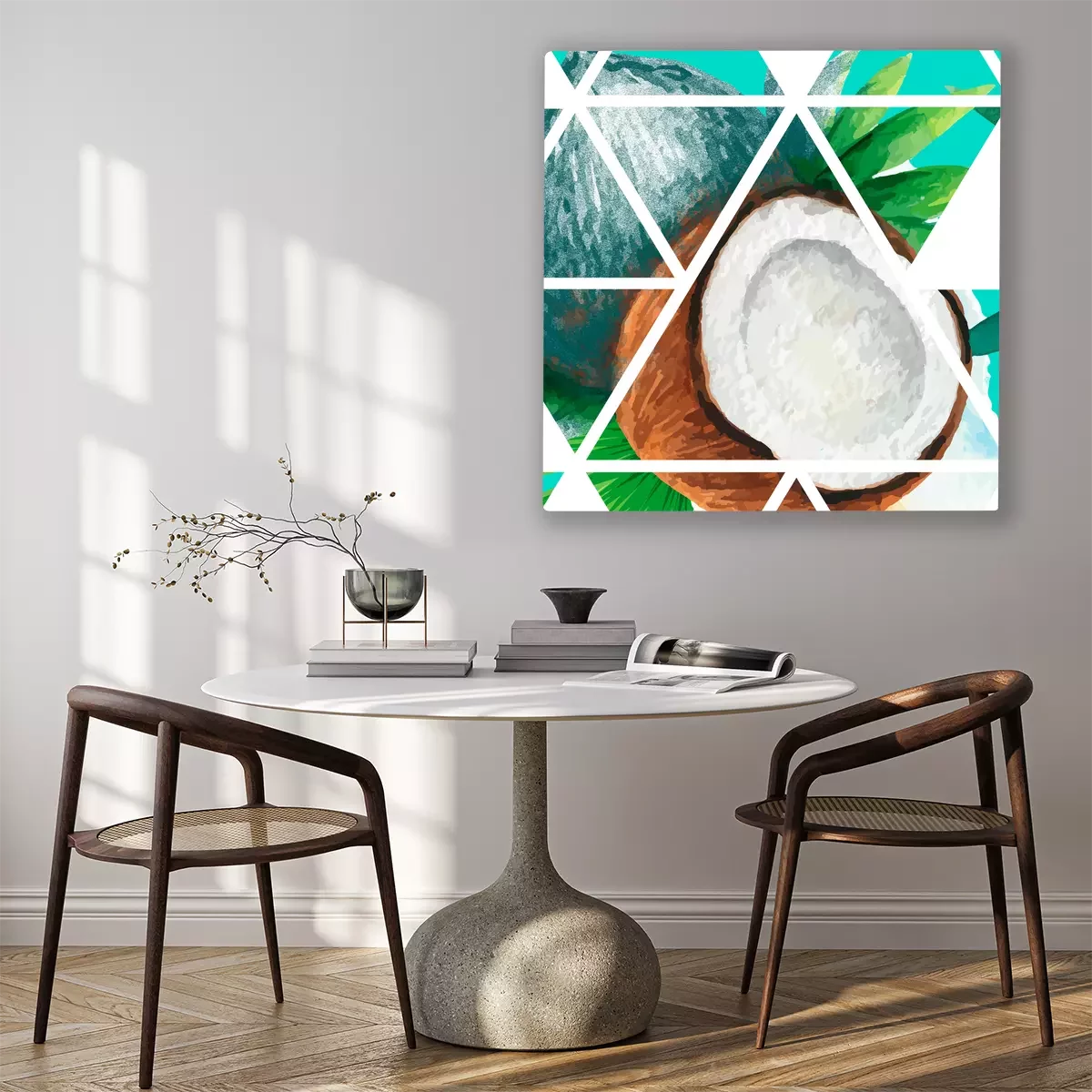 Een gesneden kokosnoot in grafische segmenten