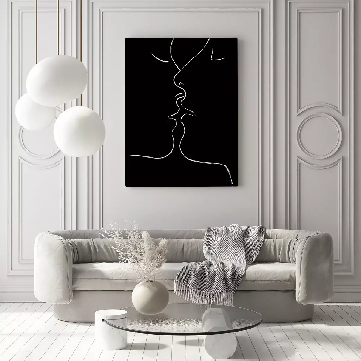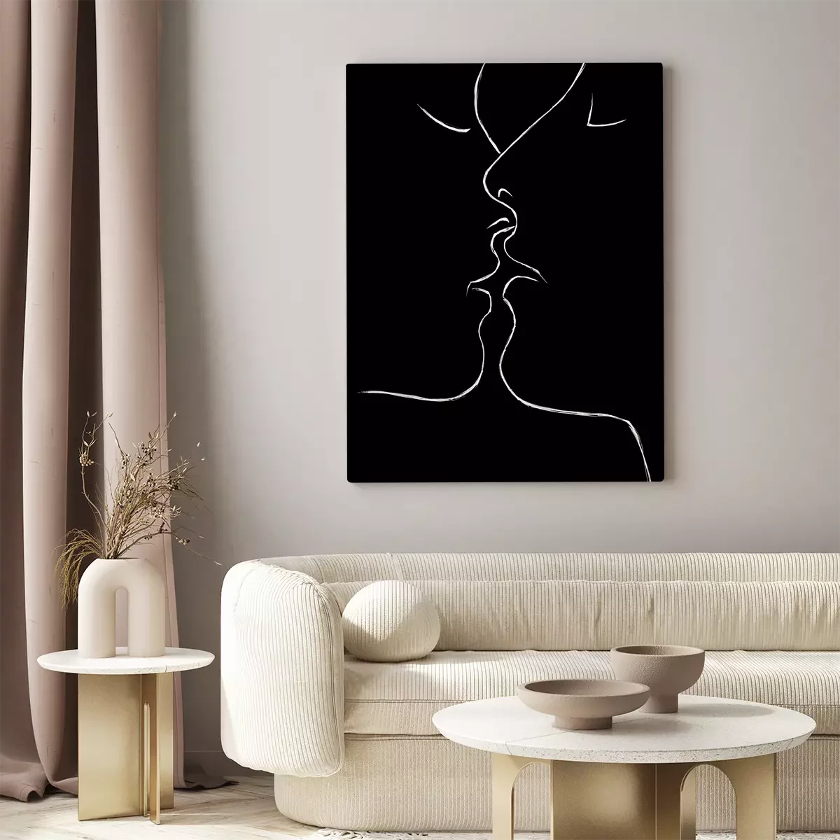 Een heldere omtrek van twee kussende gezichten op een zwarte achtergrond.