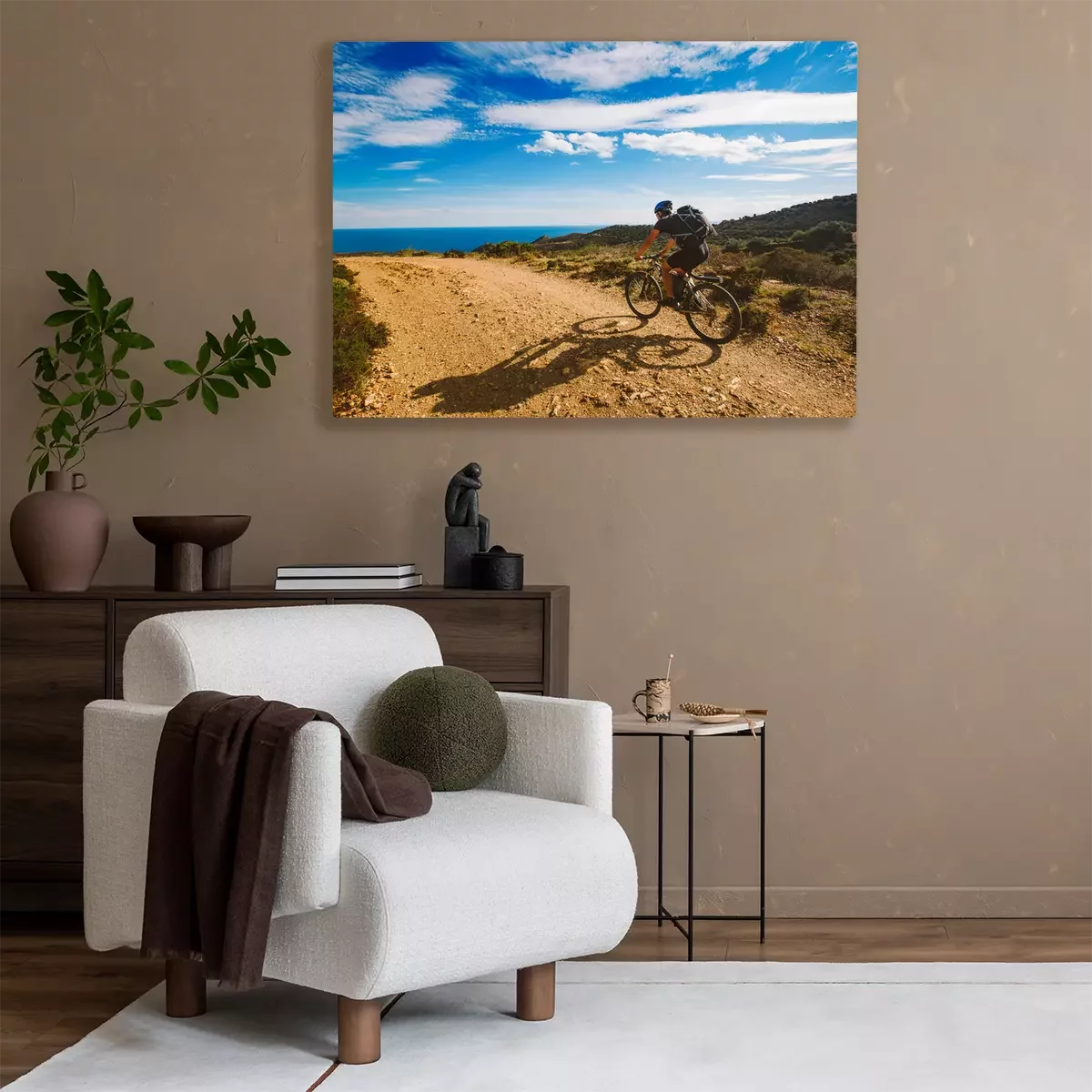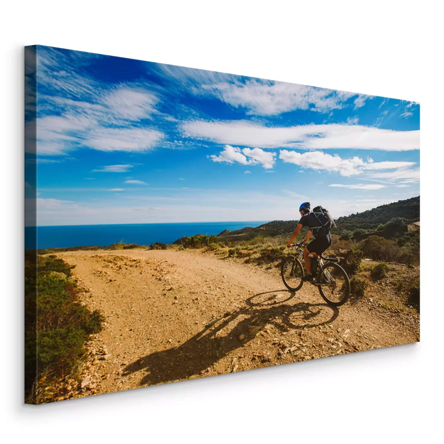 Canvas: een jonge man die op een fietsroute in Spanje op een mountainbike rijdt tegen de achtergrond van de Middellandse Zee. Gekleed in een helm, een donkere en een zwarte rugzak