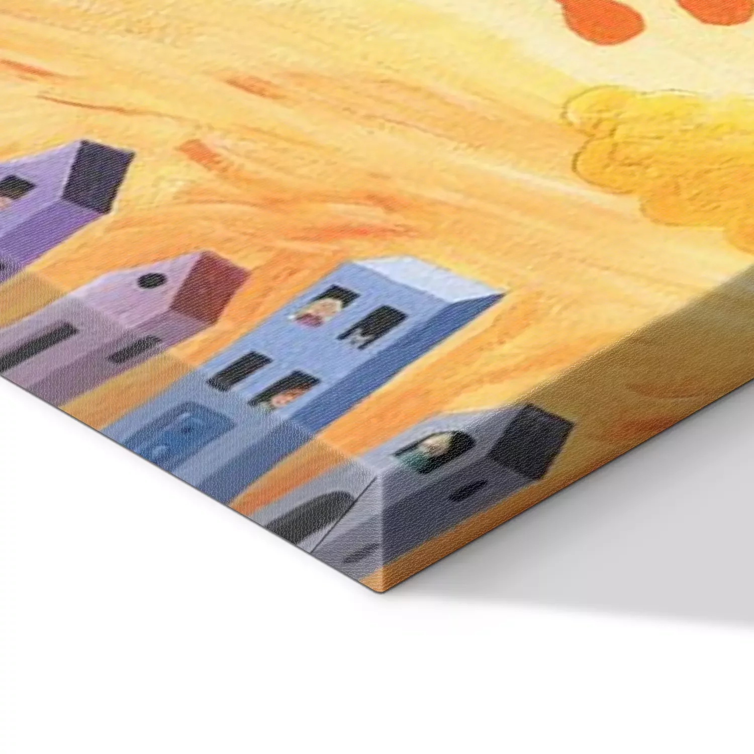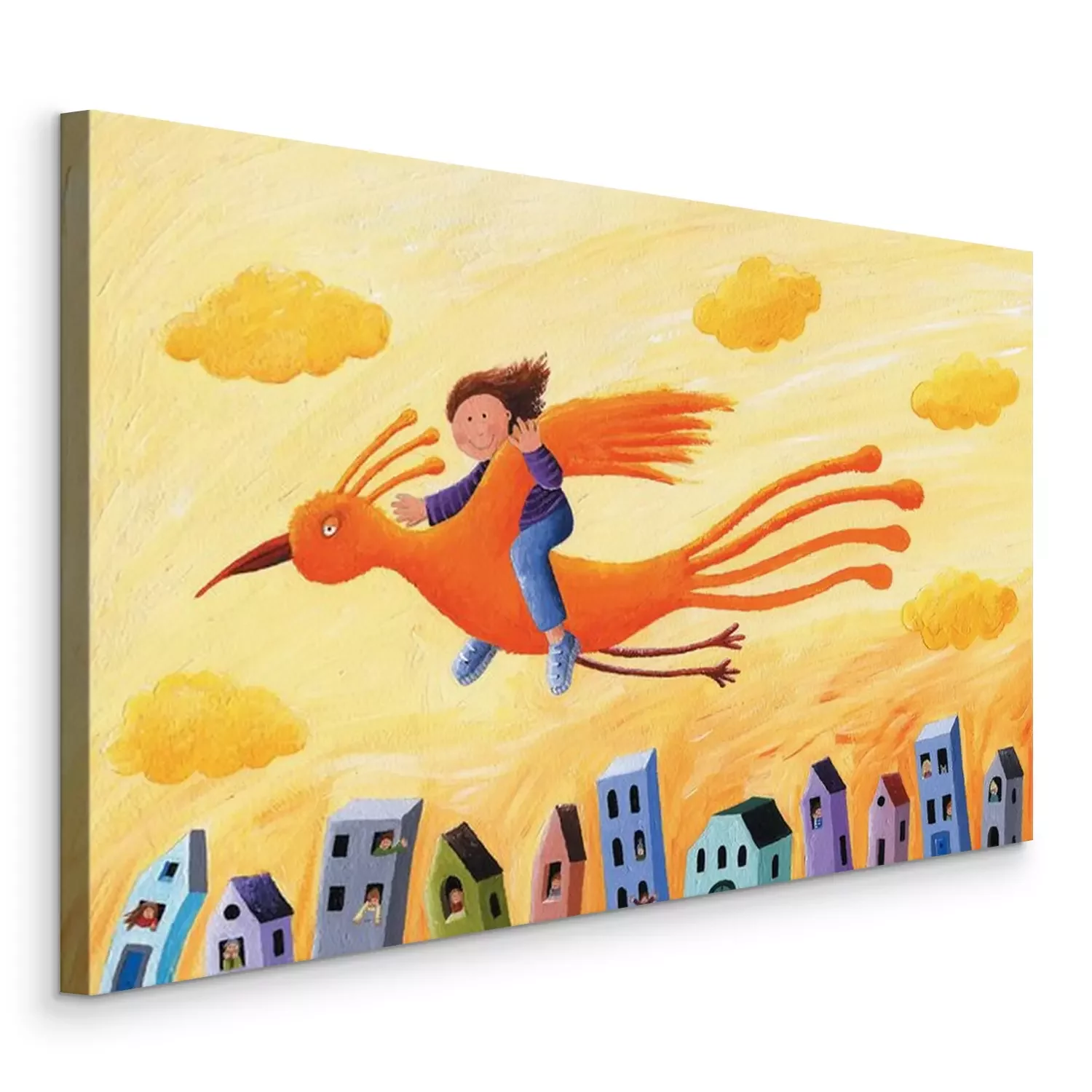 Canvas Een jongen vliegt over een dorp op een oranje vogel