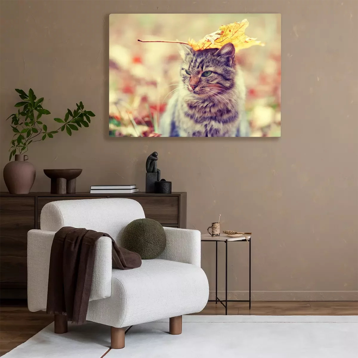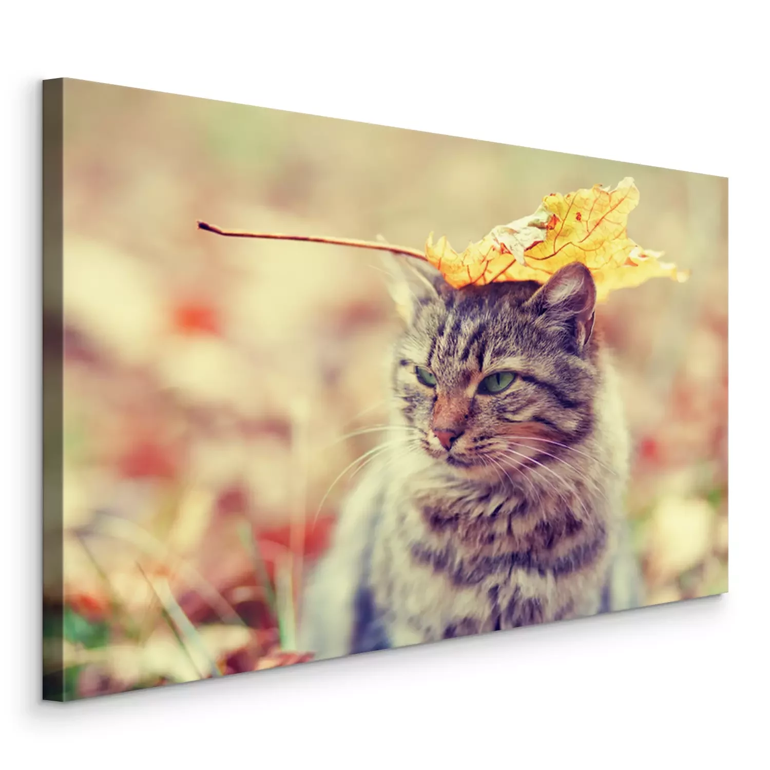 Canvas Een kitten met een blad op zijn kop
