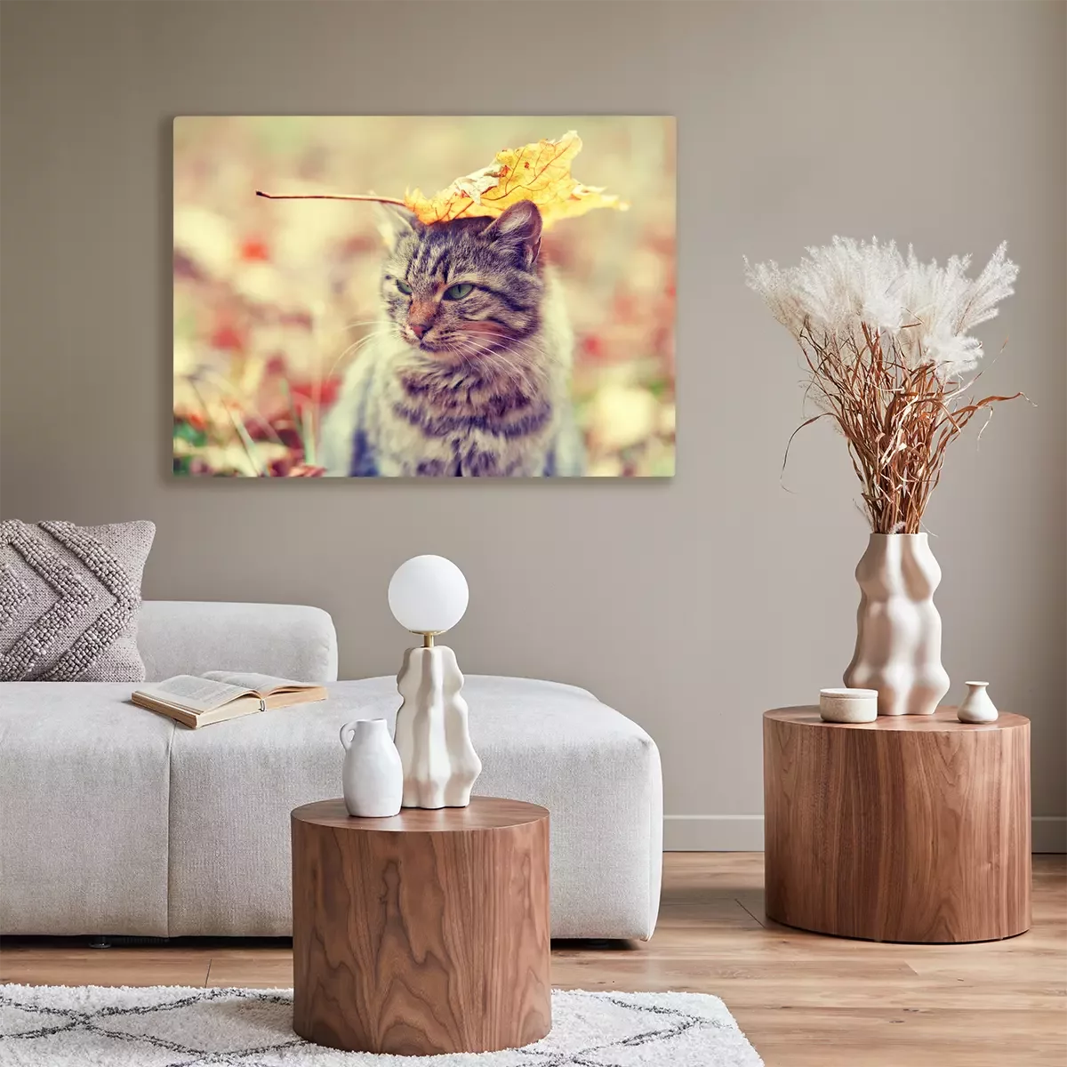 Canvas: Een kitten met een blad op zijn kop
