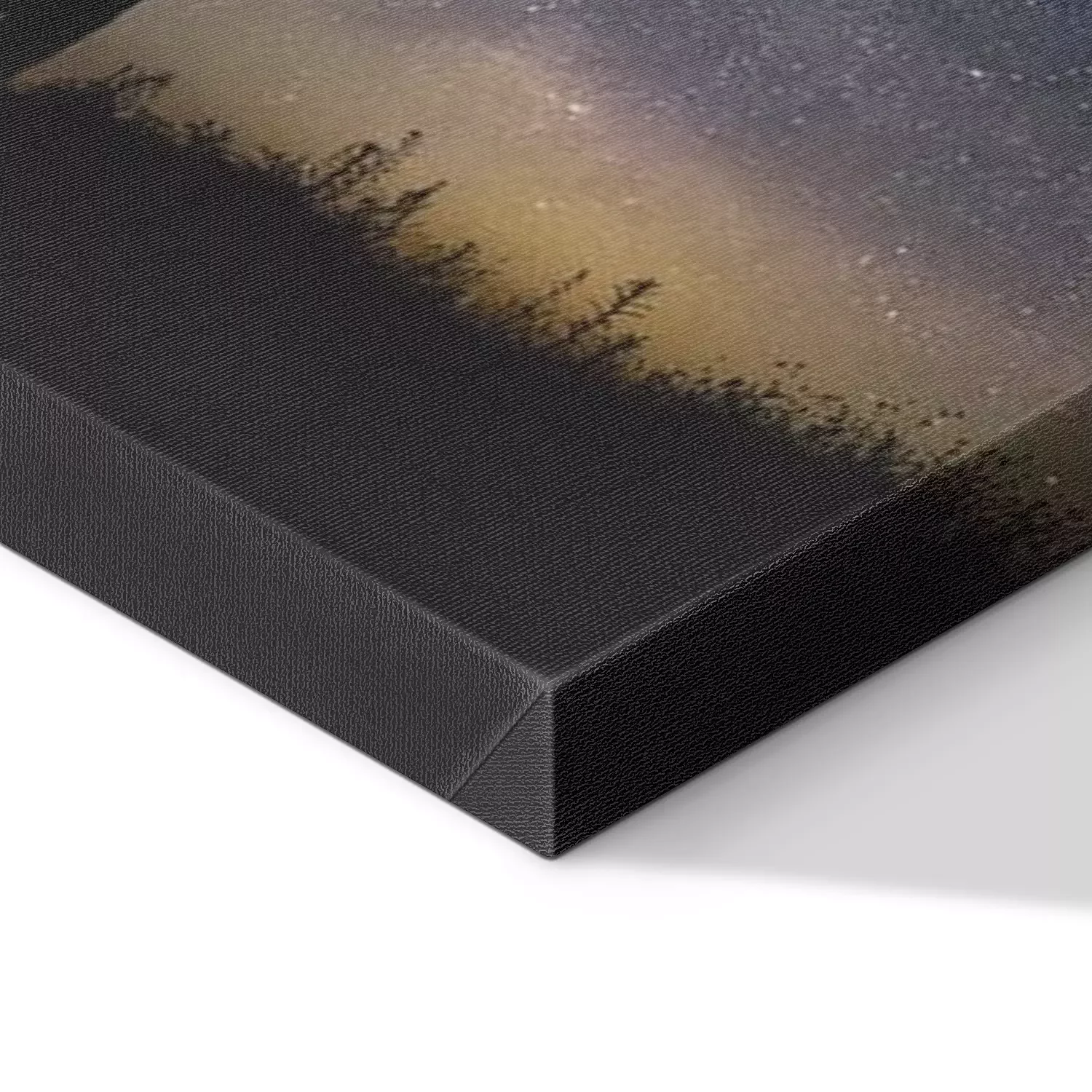 De print wordt aangebracht op hoogwaardig canvas dat op een schildersweefgetouw (spieraam) wordt gespannen. Omdat de print de zijranden bedekt, hoeft het ontwerp niet met een extra kader te worden omlijst. Wij raden ook composities aan die uit meerdere foto's bestaan en zo een coherente compositie vormen.