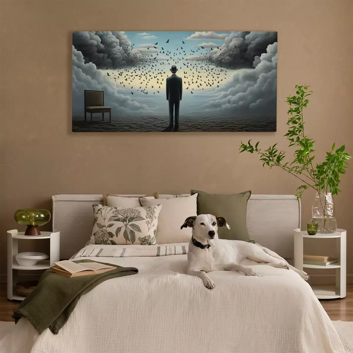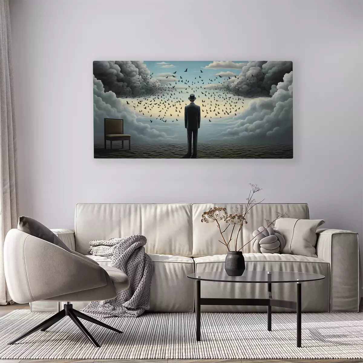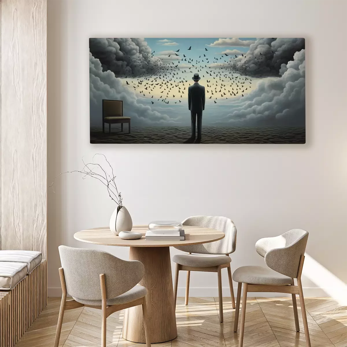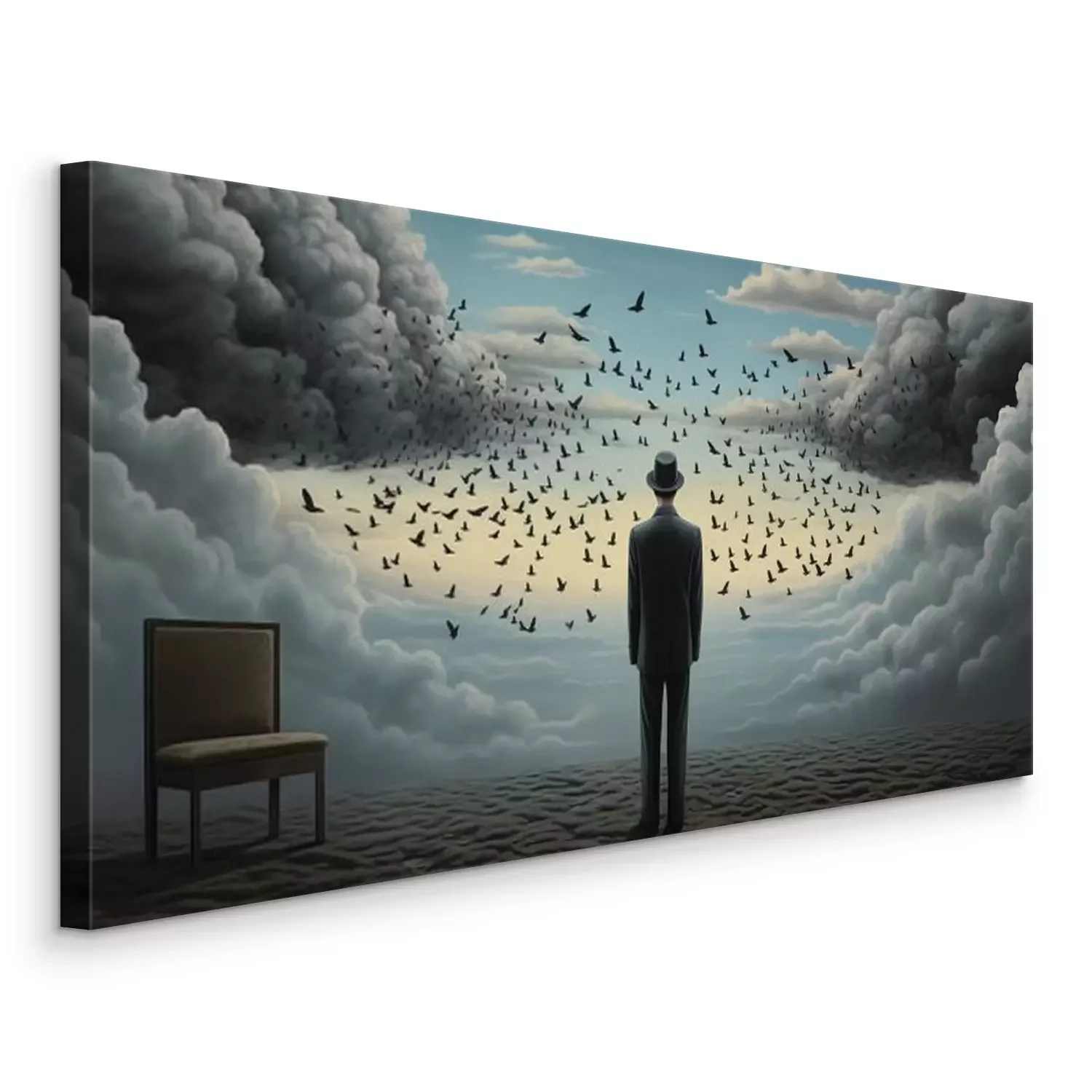 Een man met een zwerm vogels en een stoel op de achtergrond