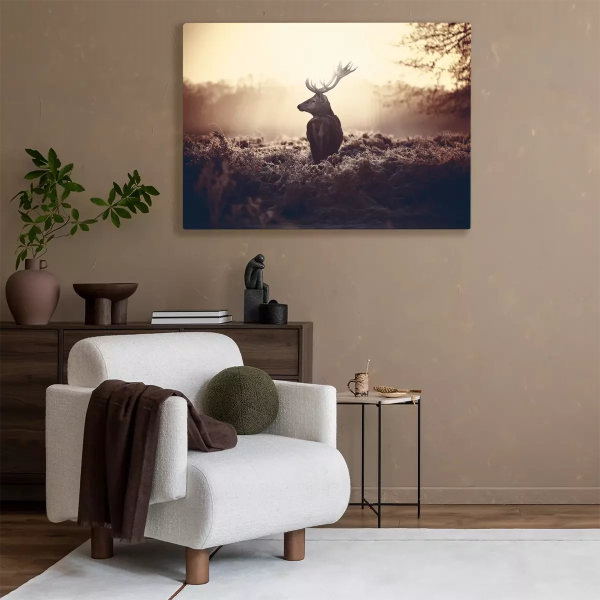 Een mannelijk hert tegen de achtergrond van de dageraad