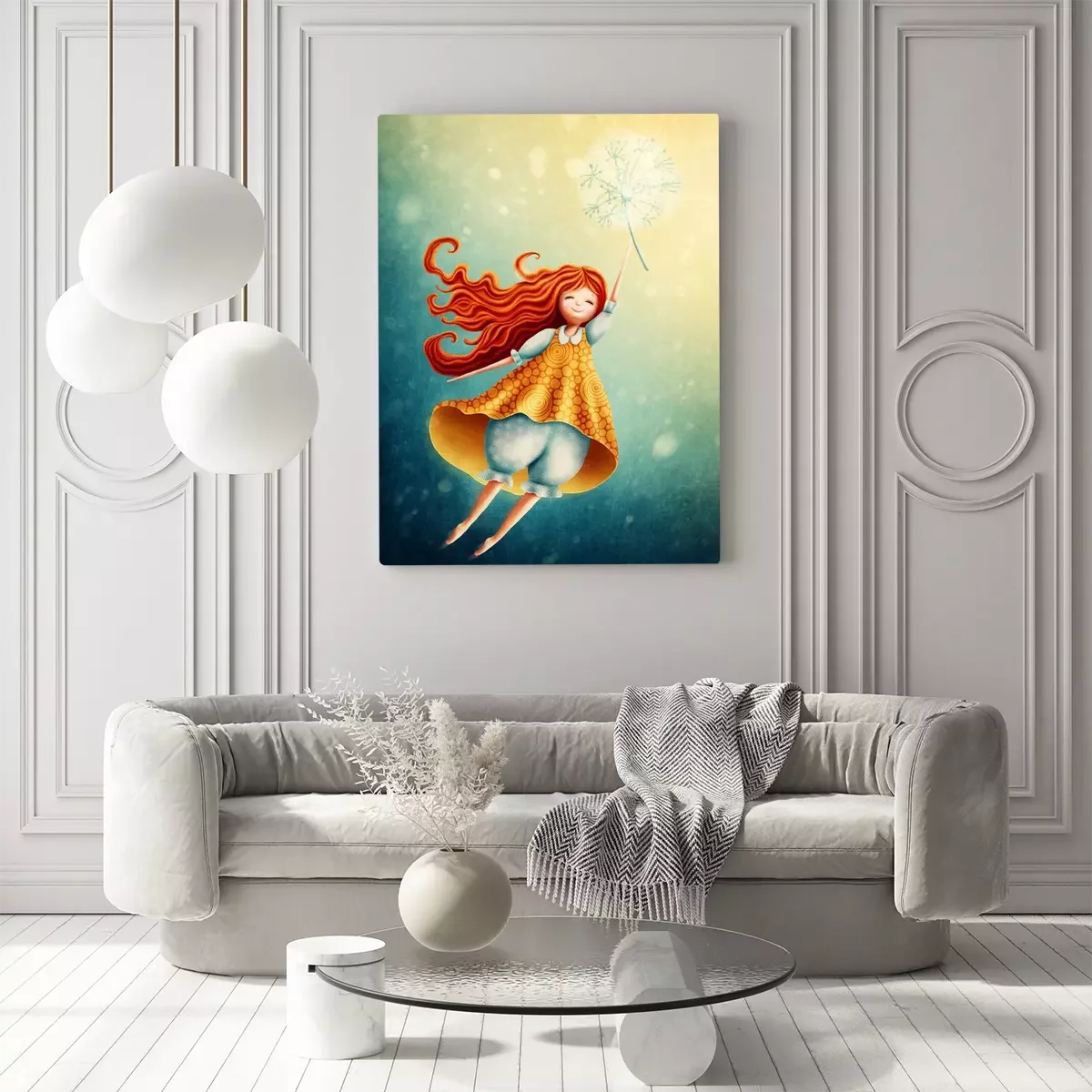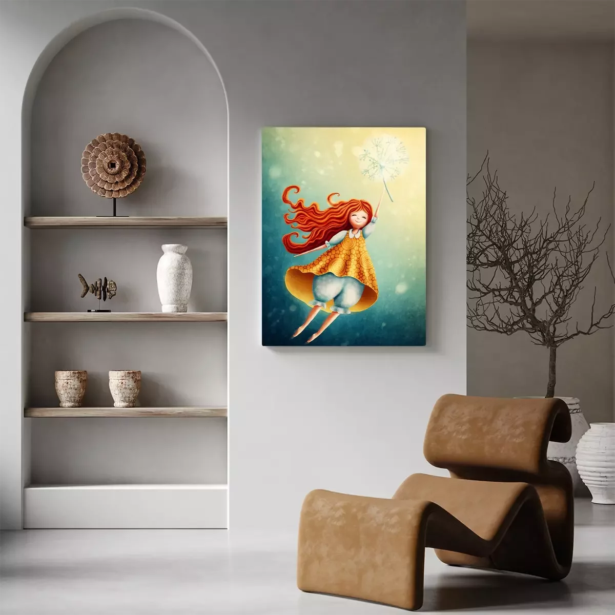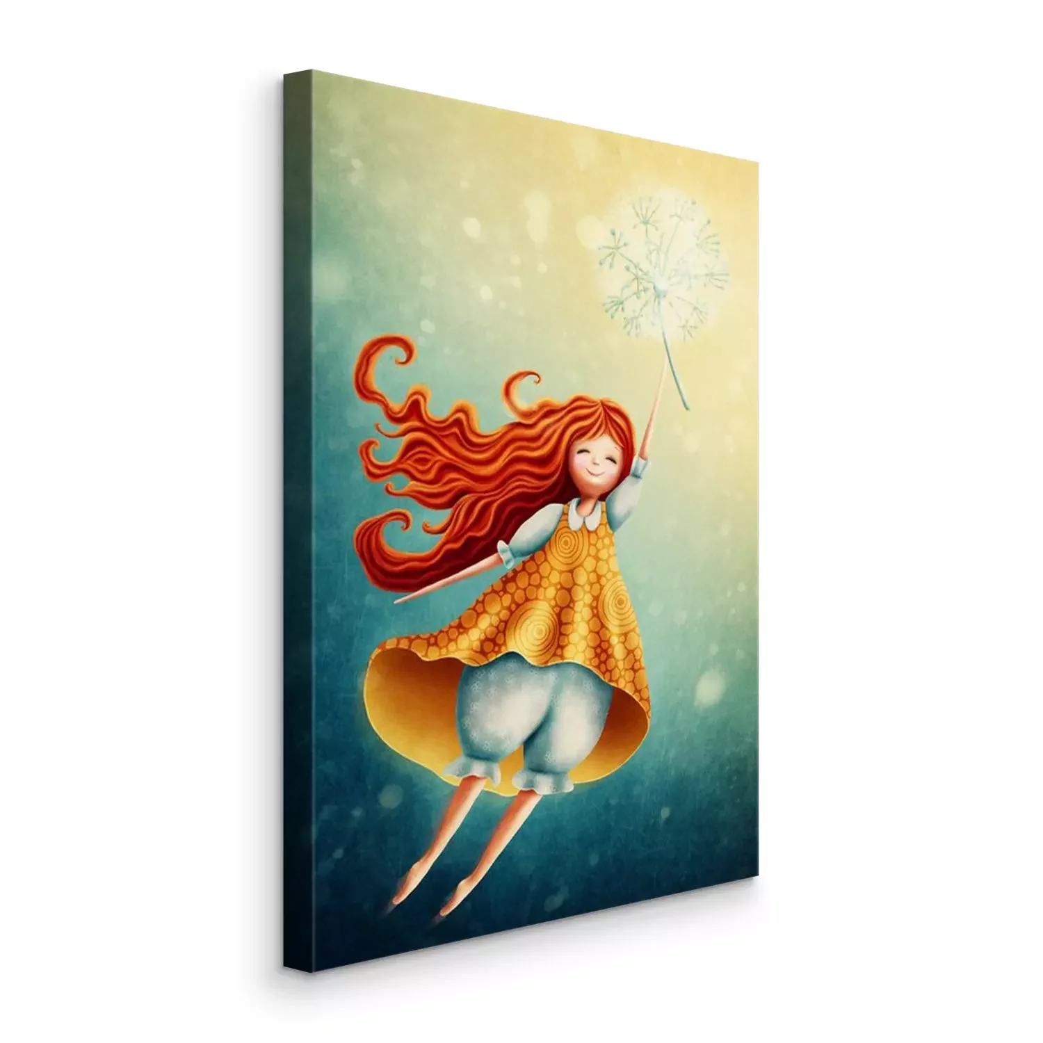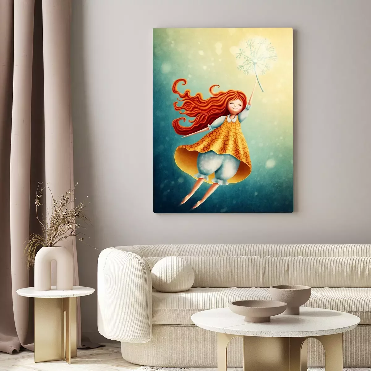 Canvas Een meisje in een jurk met patroon en een paardebloem