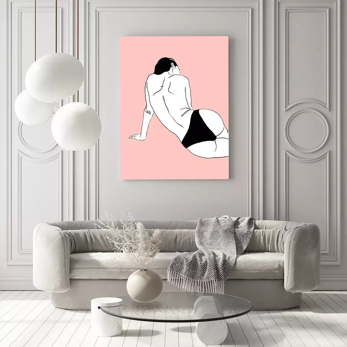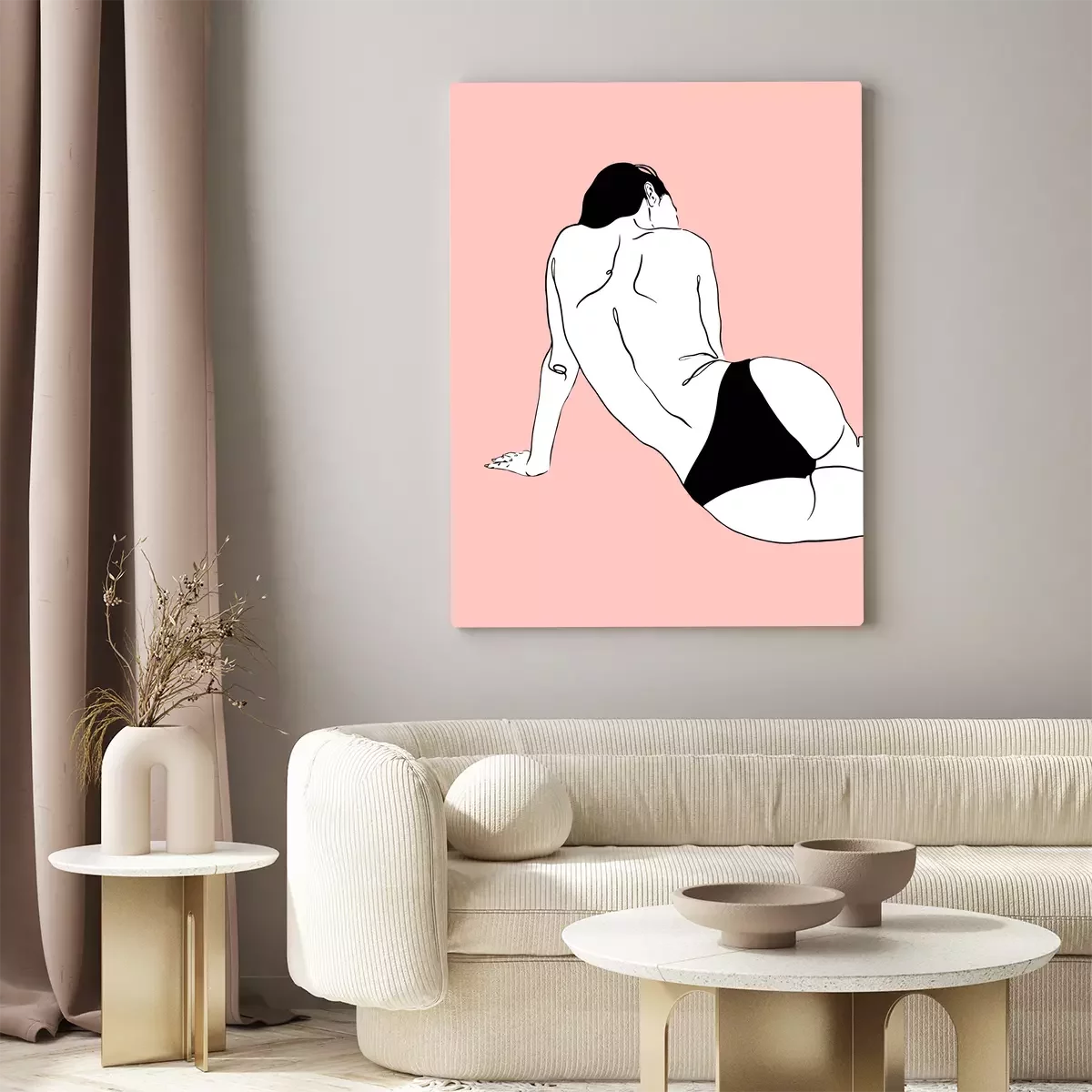 Een minimalistische illustratie van een vrouwelijk silhouet op een roze achtergrond.