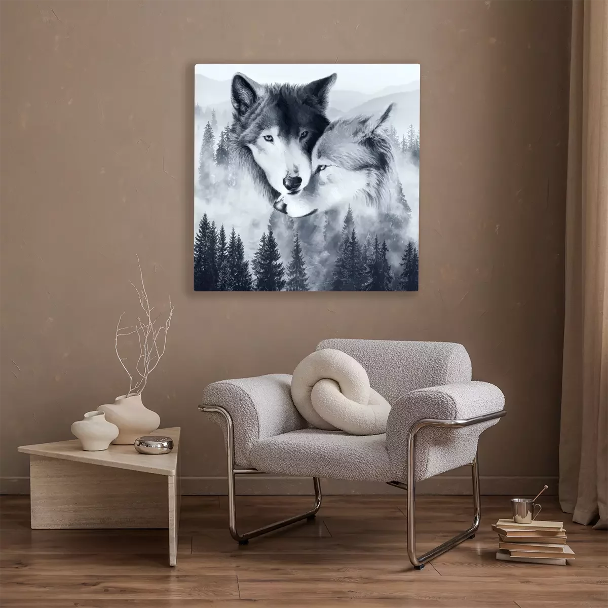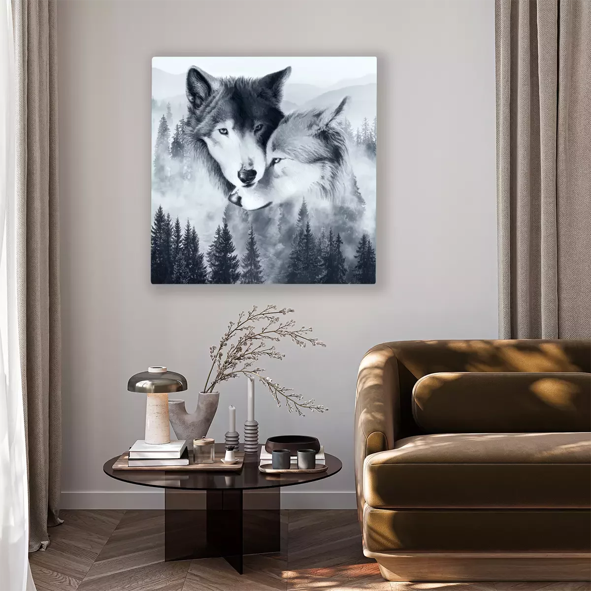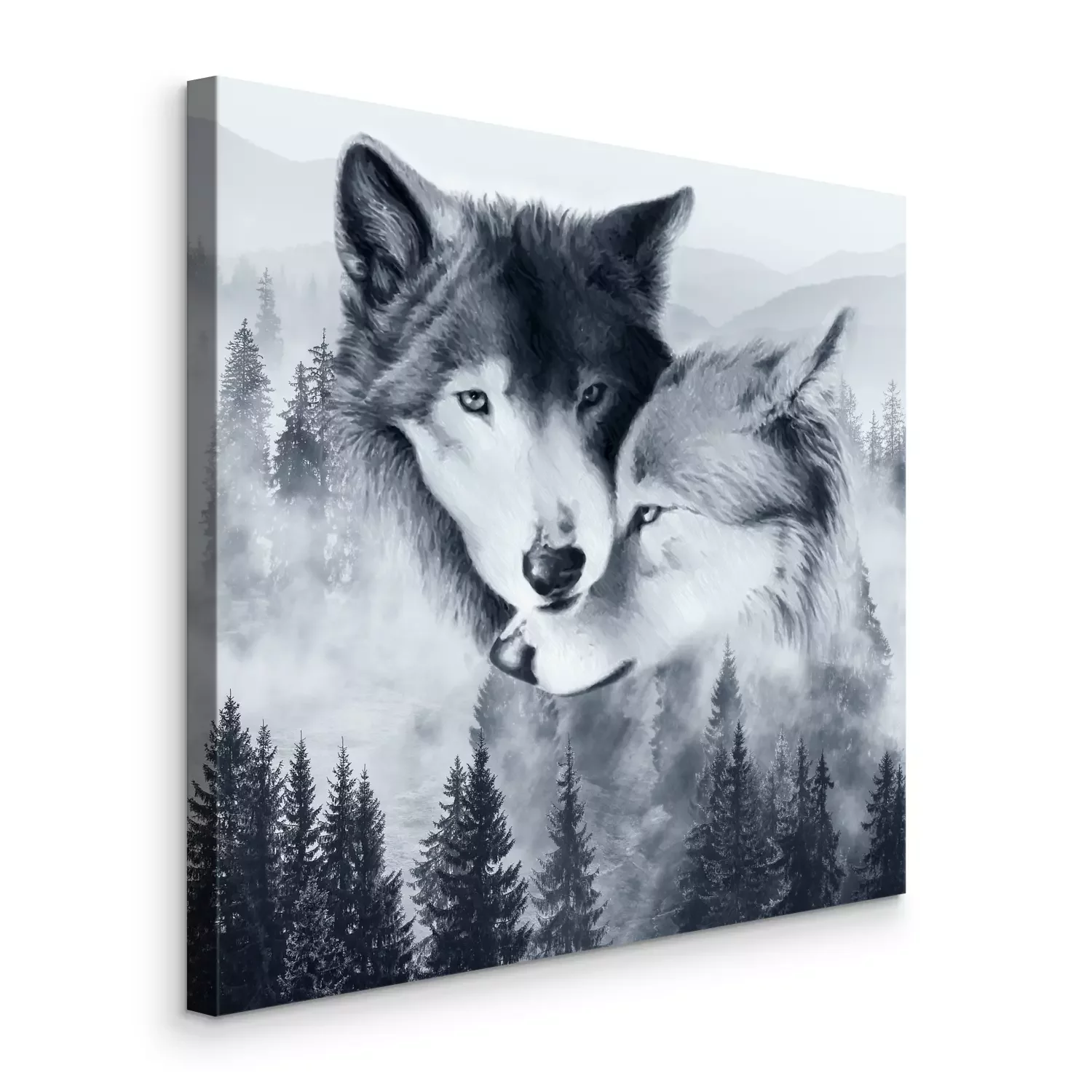 Canvas: Een paar wolven tegen een mistig landschap met bos