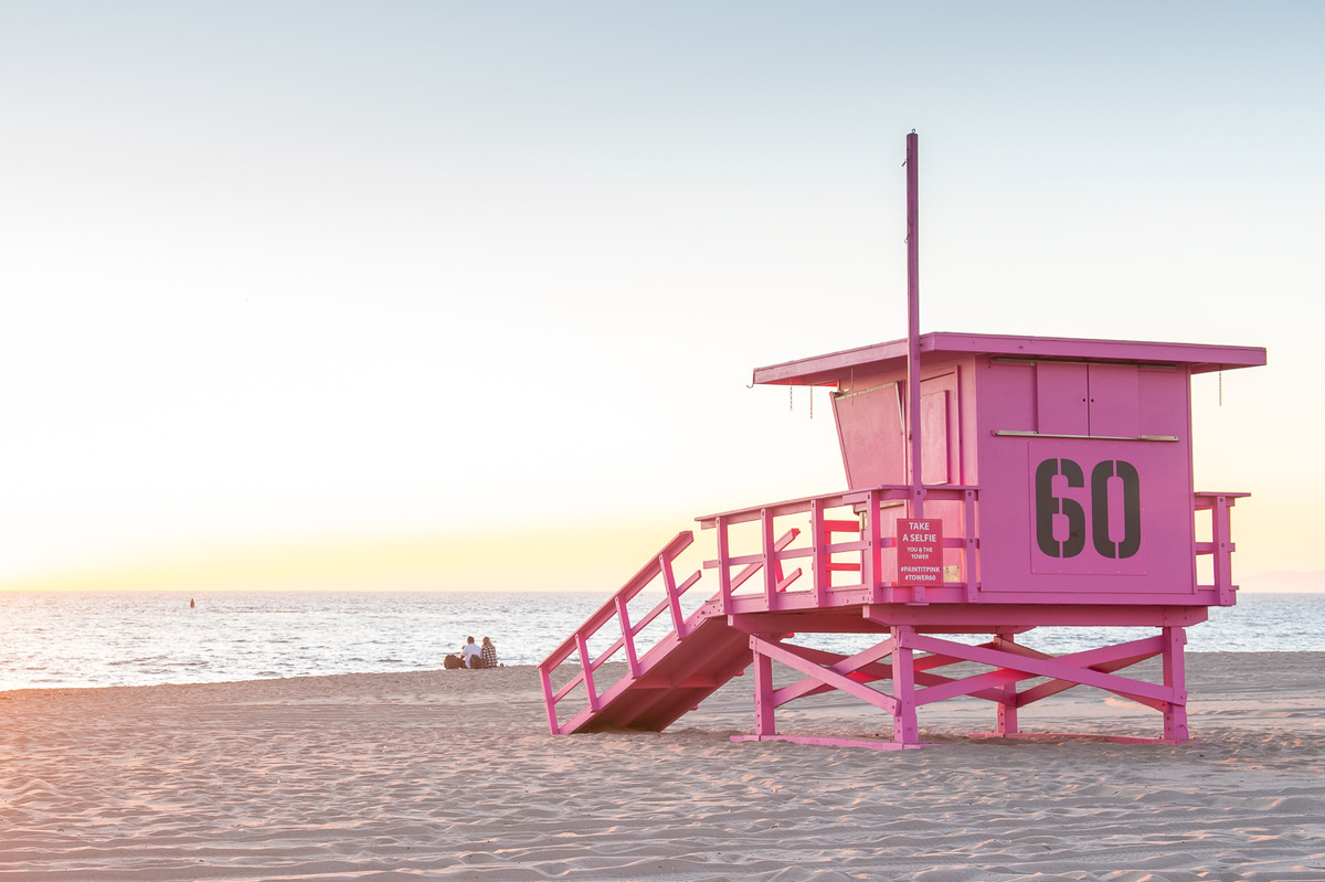 Een pastelkleurige strandwachtpost met uitzicht op de oceaan bij zonsopgang