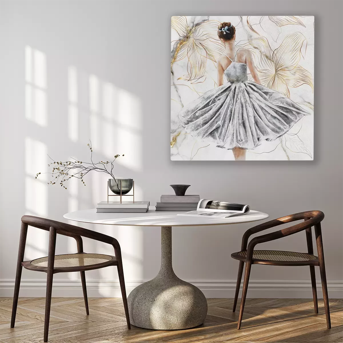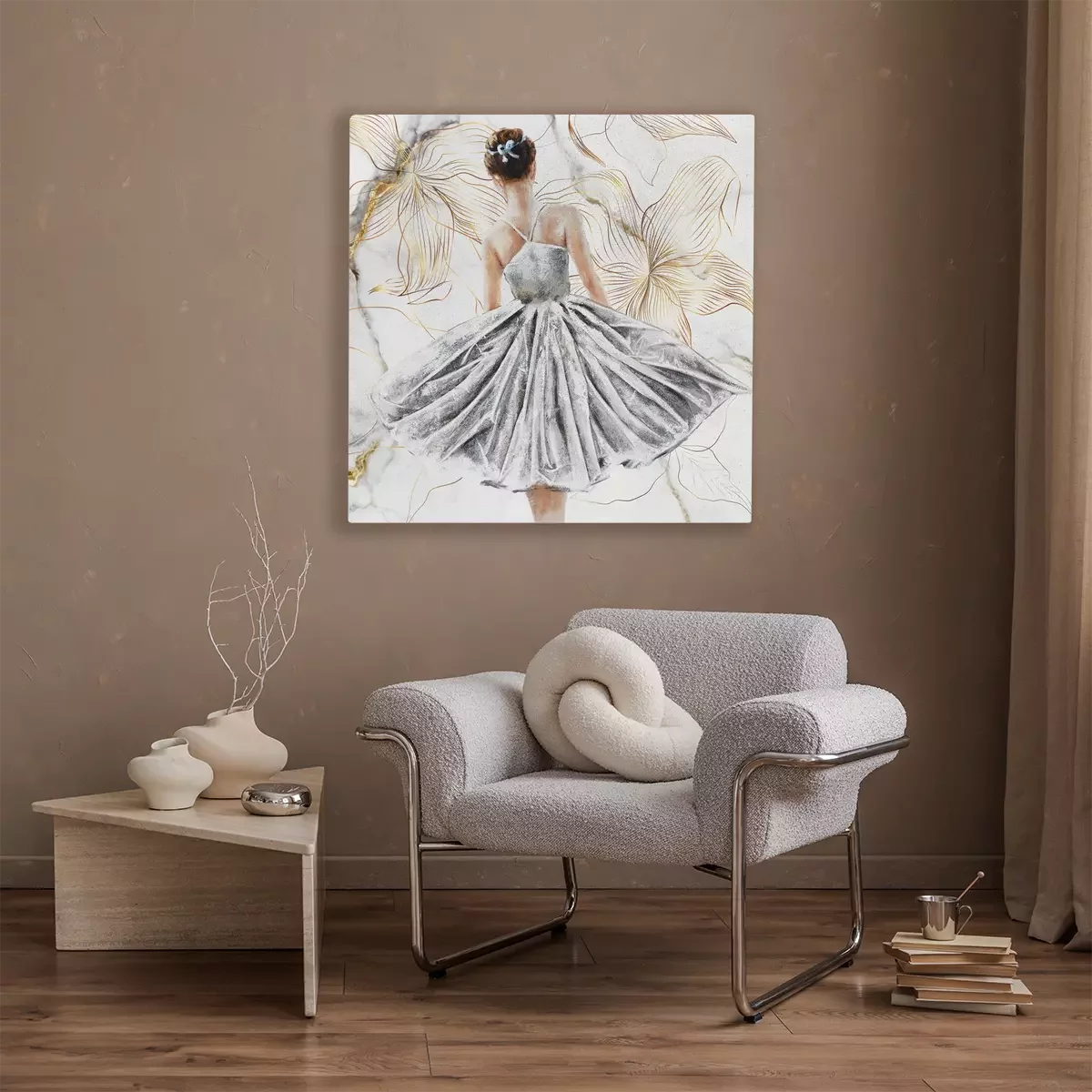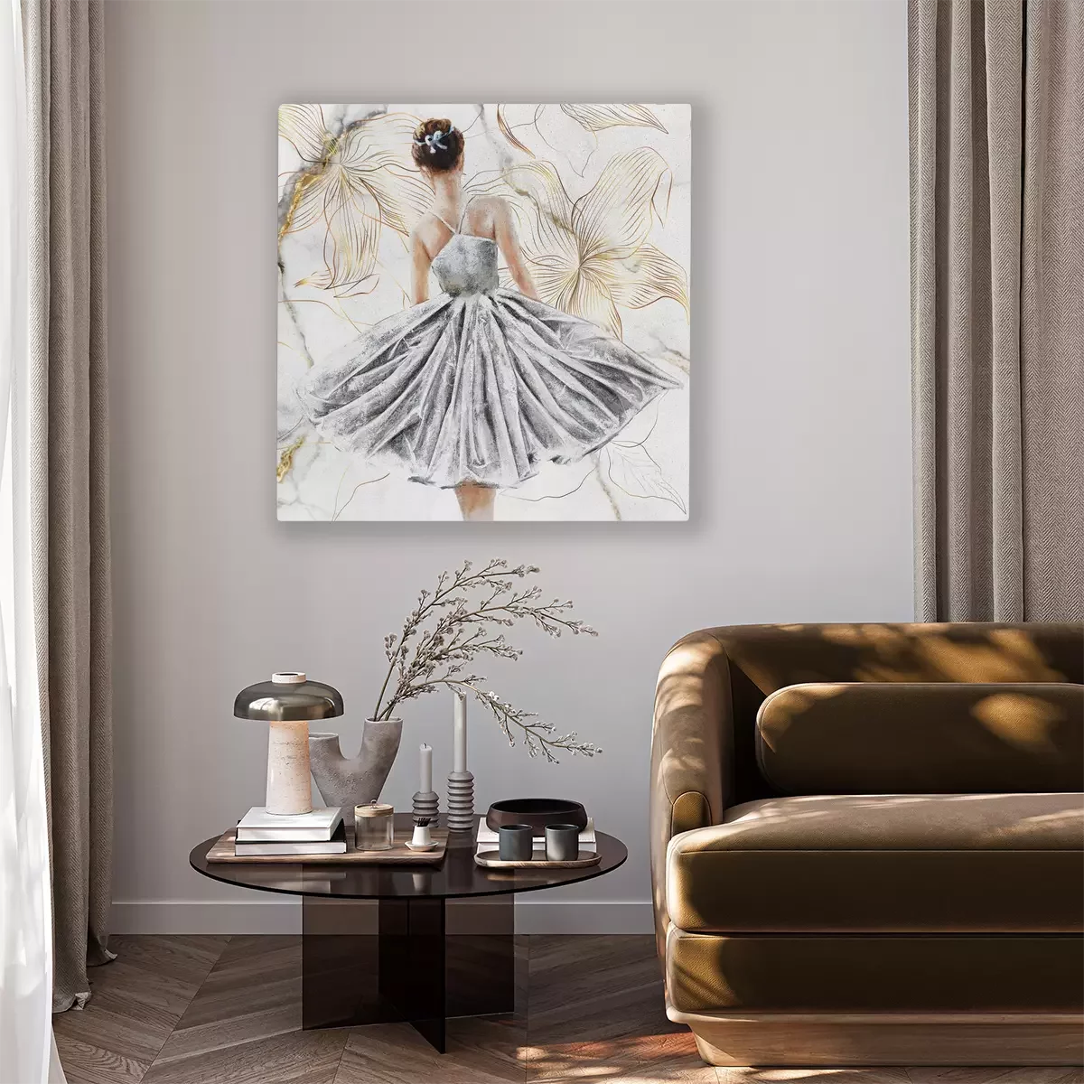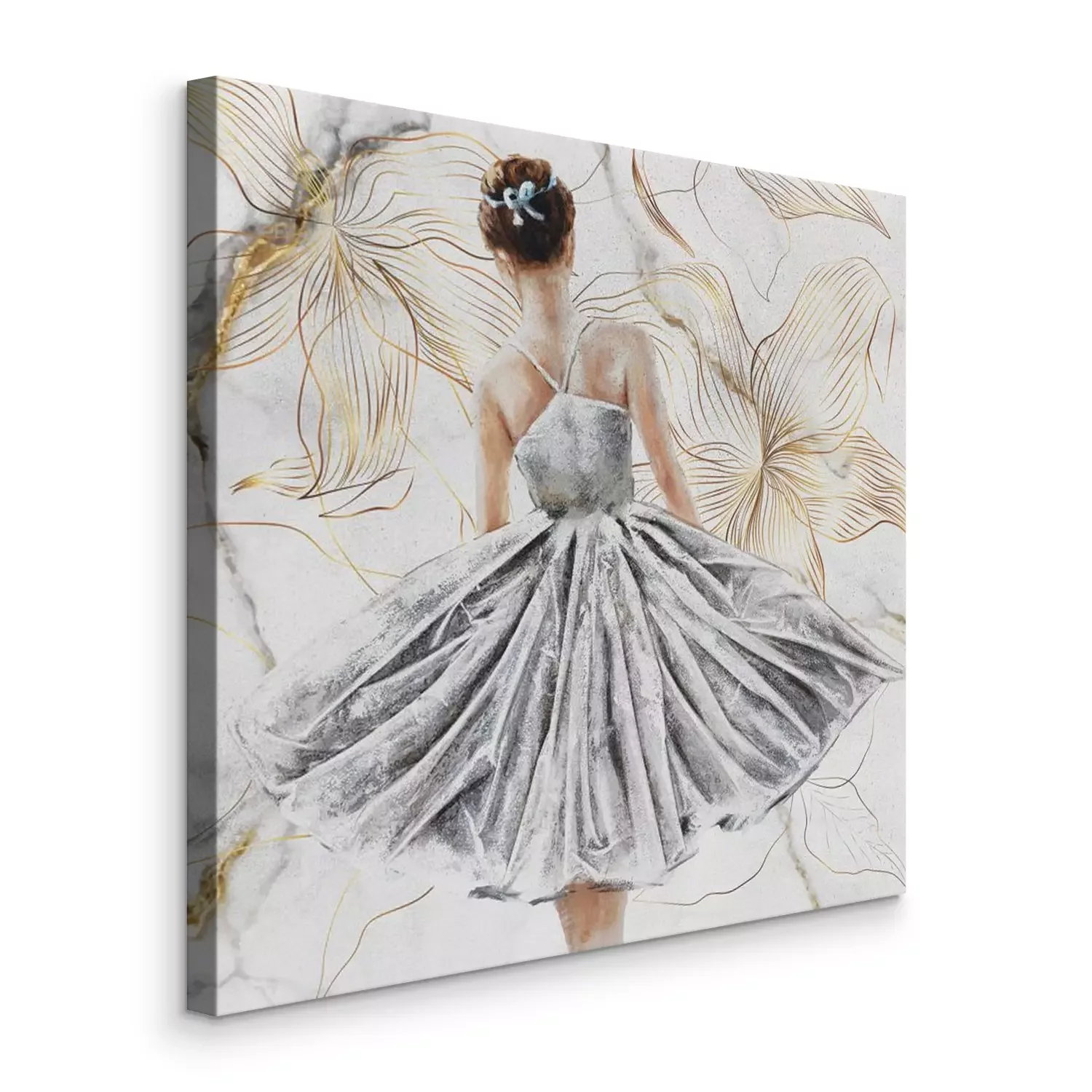 Een portret van een danseres, omringd door gouden bloemen.