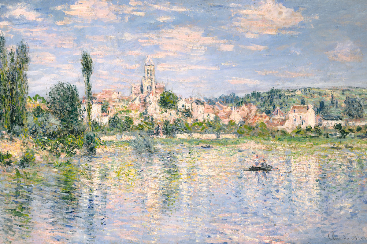 Canvas: Een rustig meer met een boot en een historisch stadje