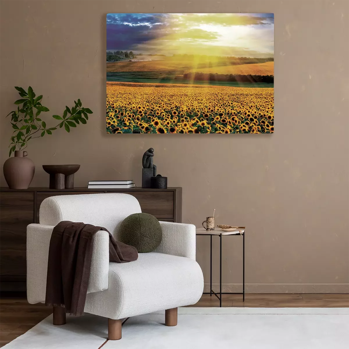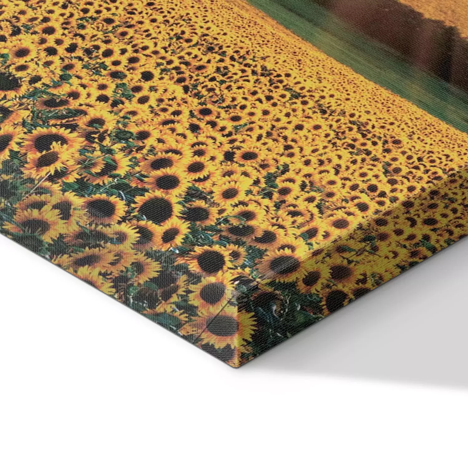 Een schilderachtig zonnebloemlandschap bij warme schemering