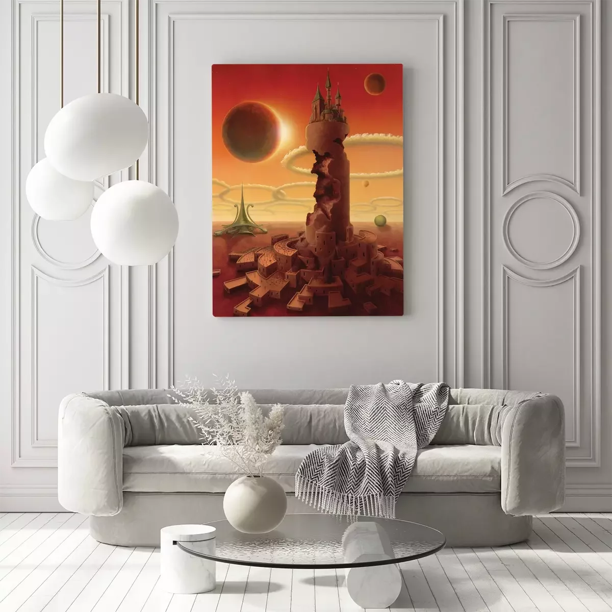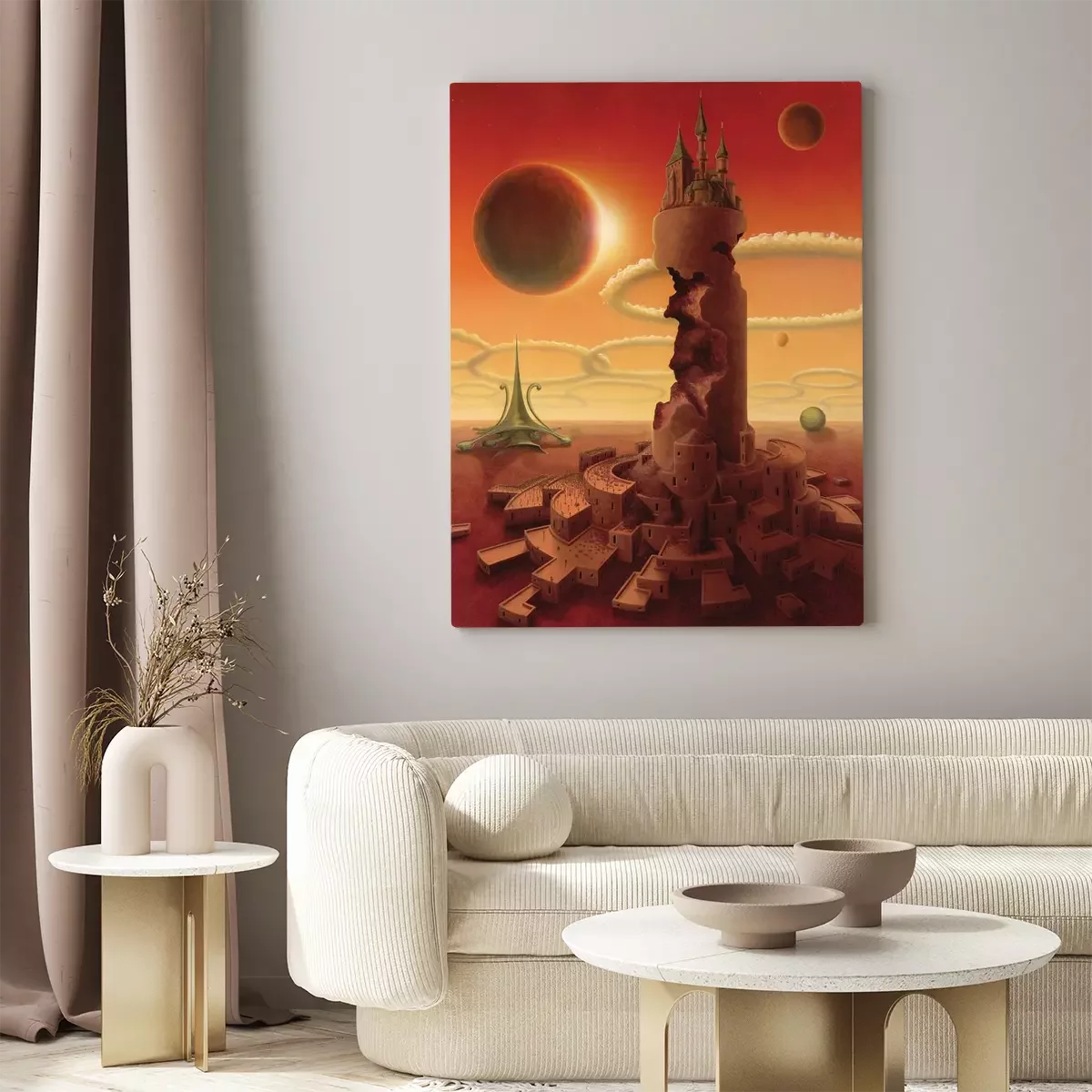 Een stad aan de voet van een toren op een vreemde planeet