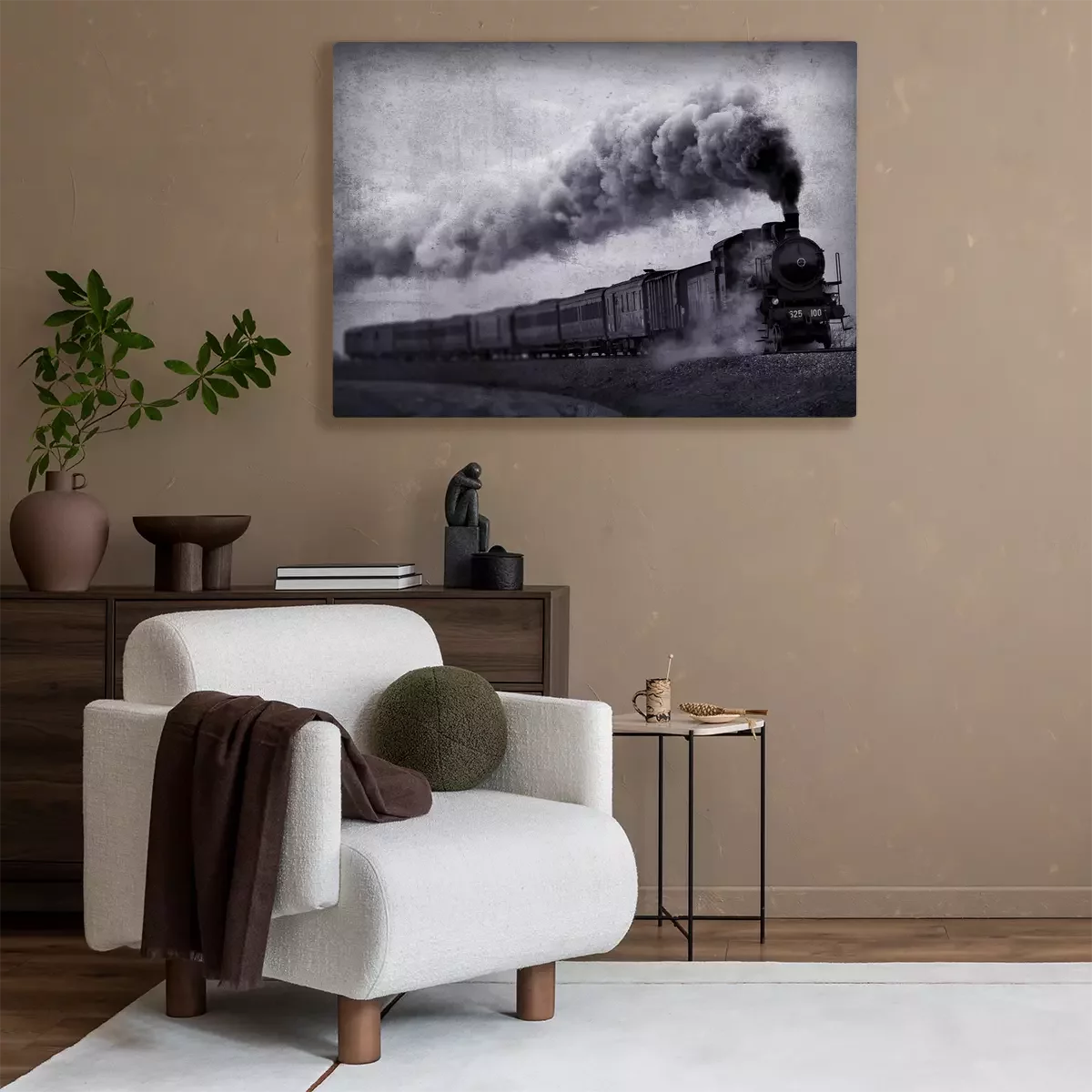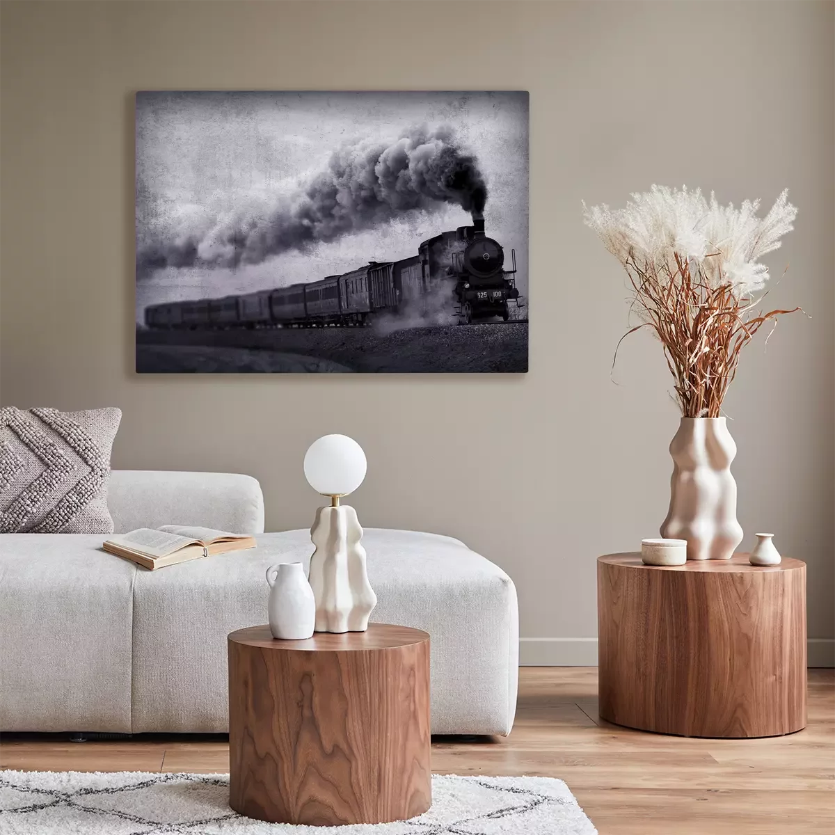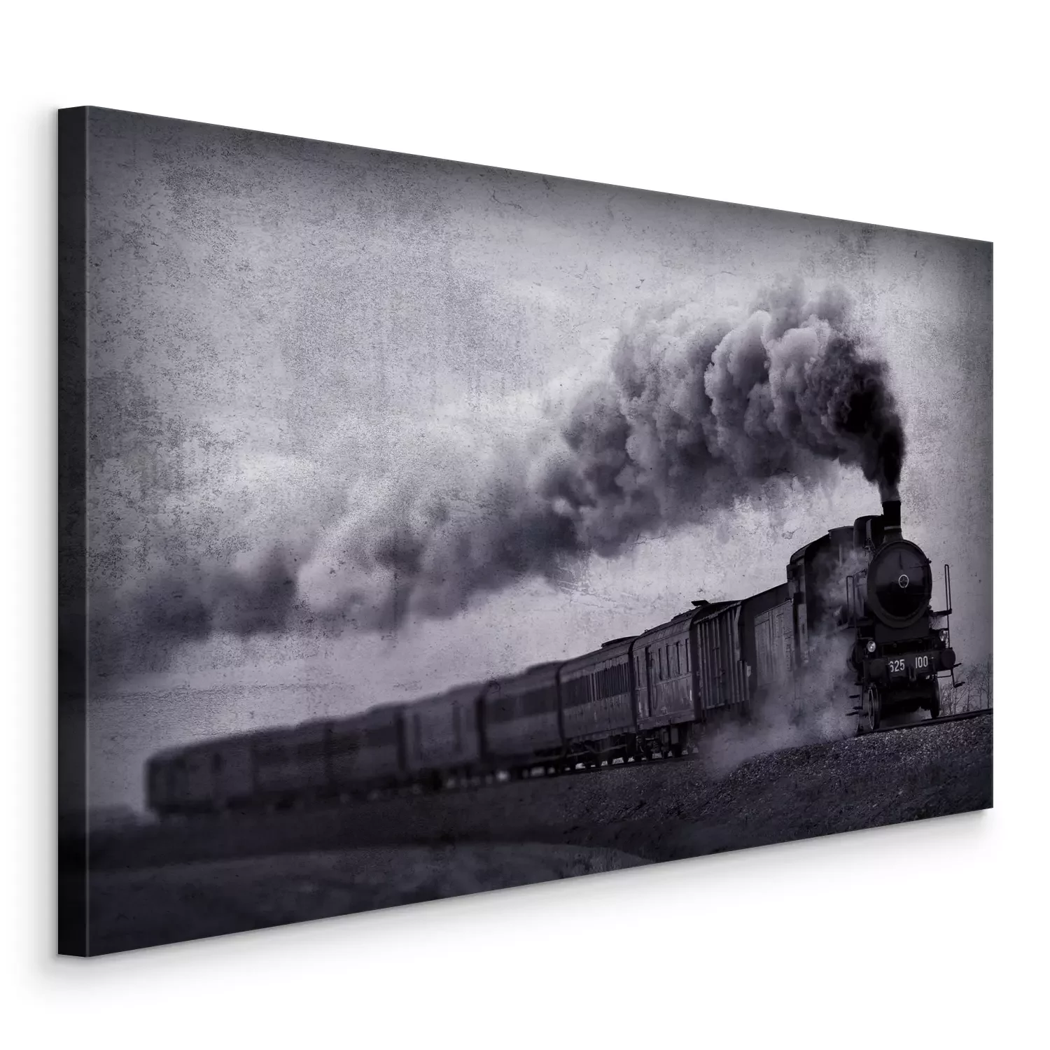 Een stoomlocomotief die door de grijze landschappen snijdt