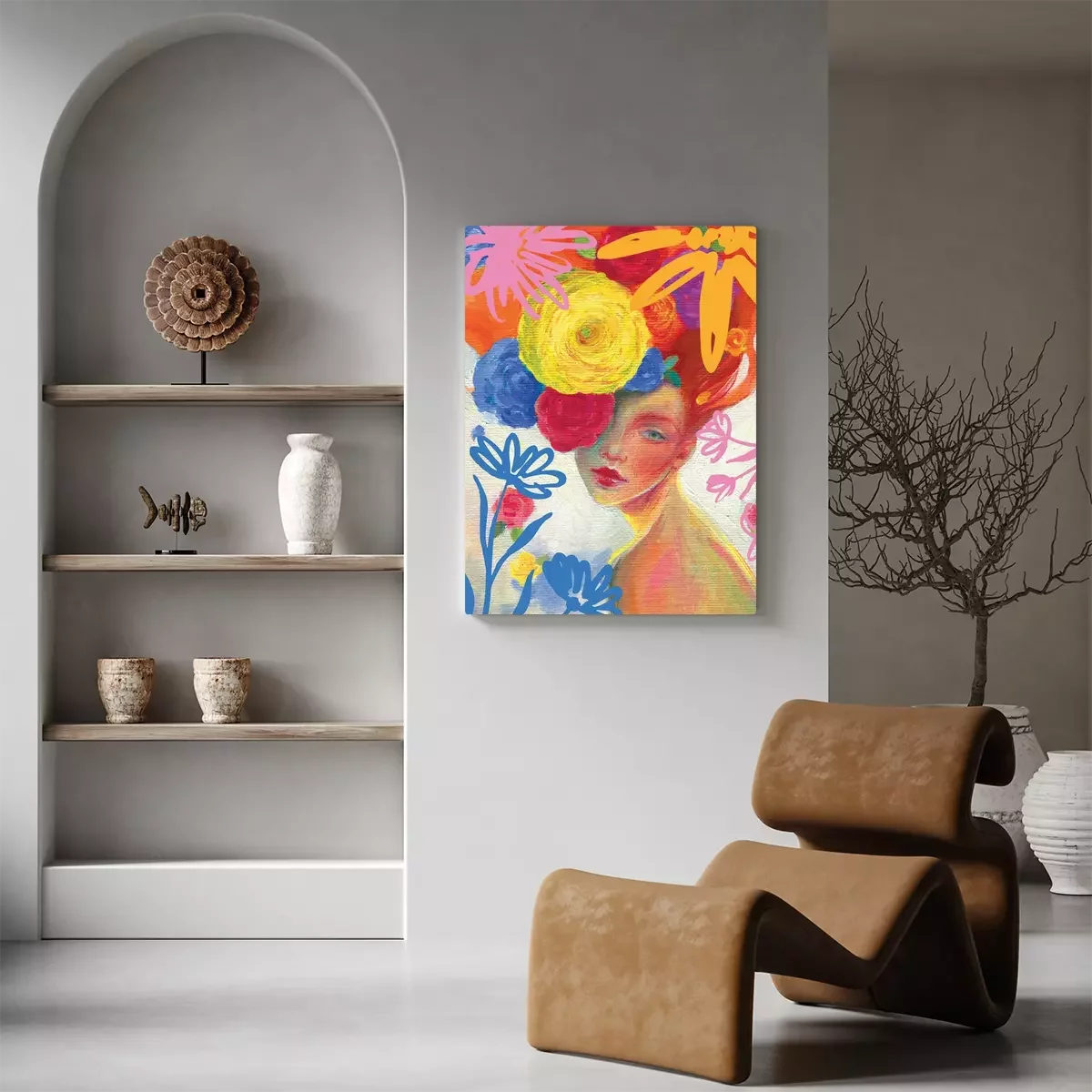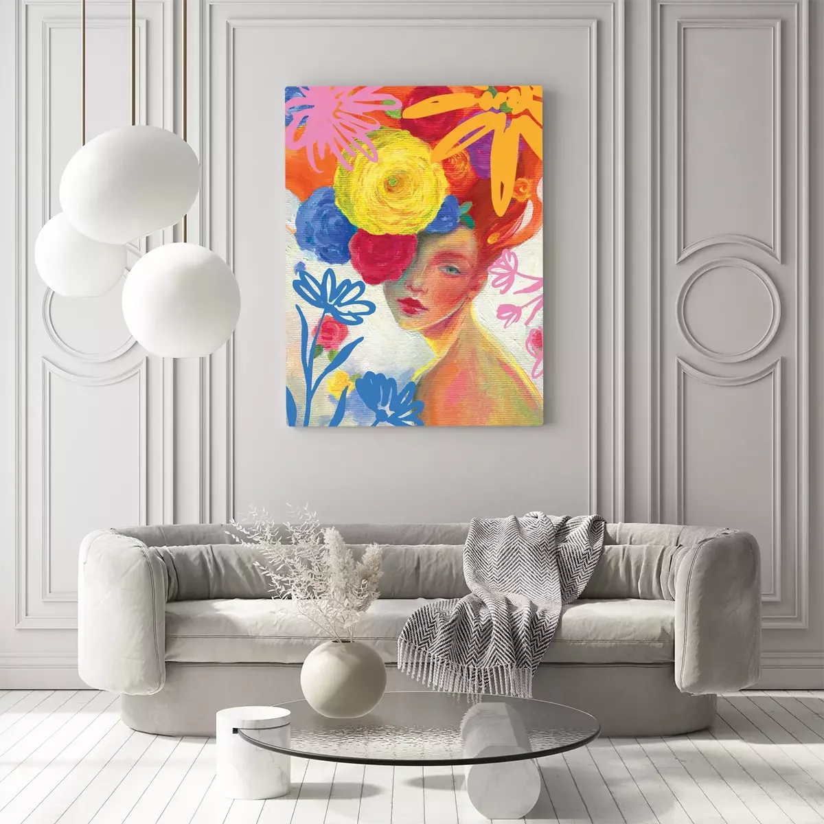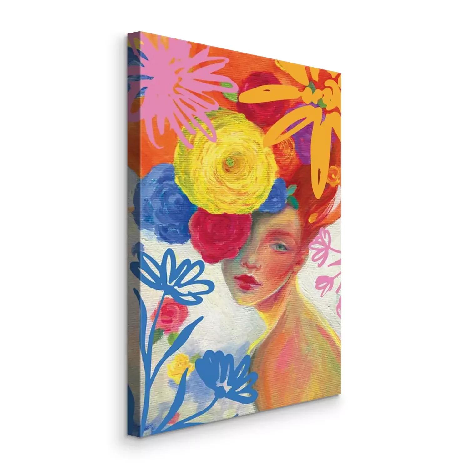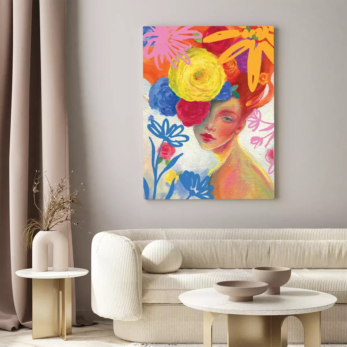 Canvas: Een subtiel portret van een vrouw met kleurrijke bloemen