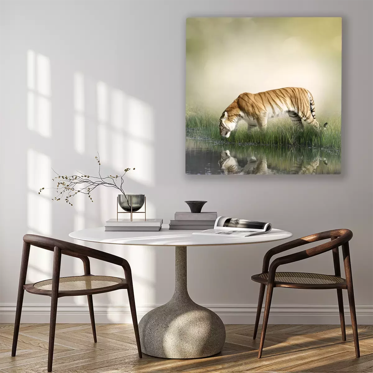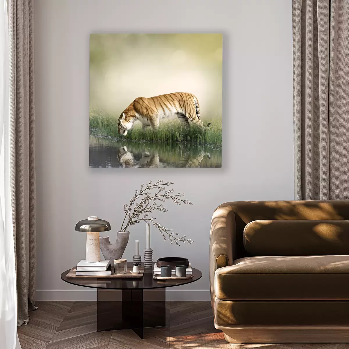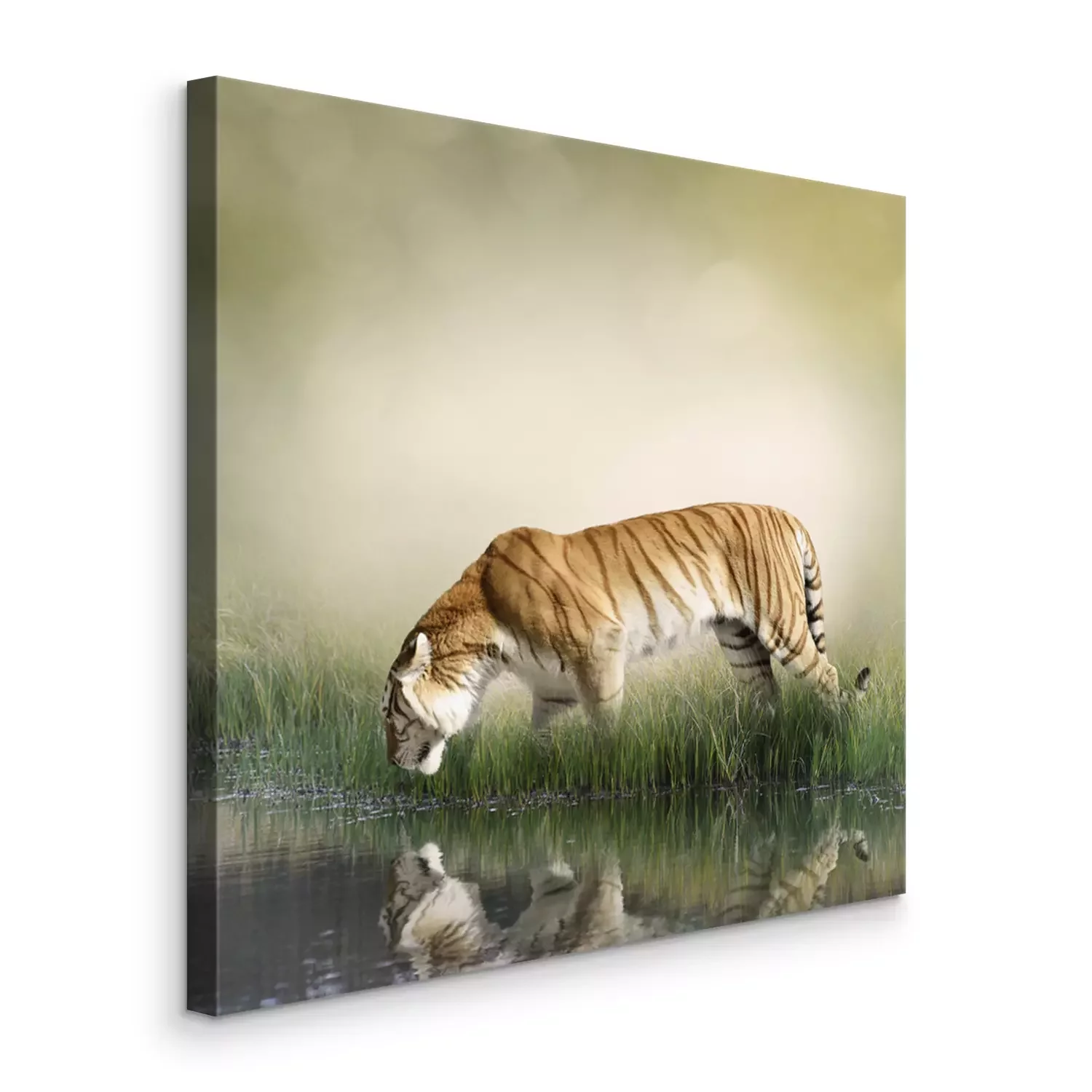 Canvas: Een tijger drinkt water uit een vijver