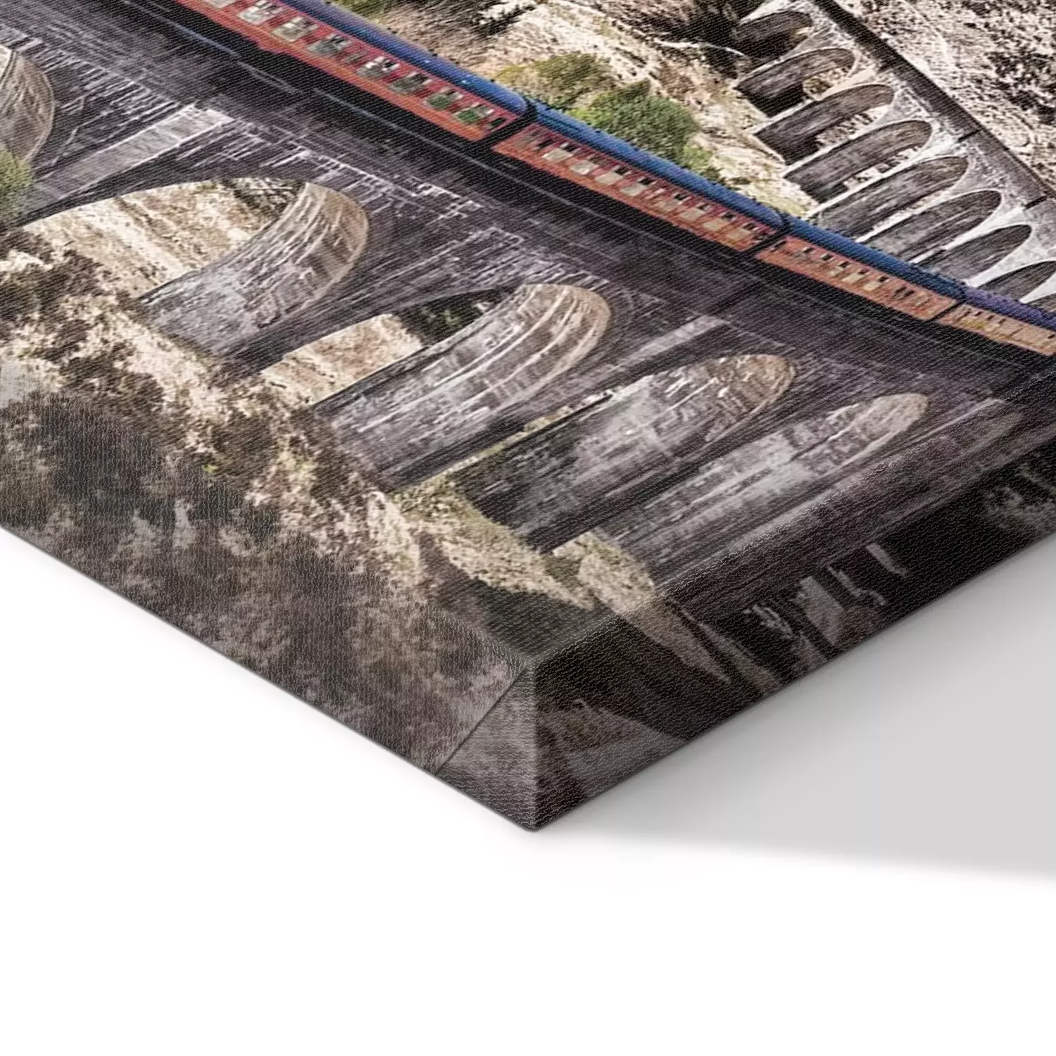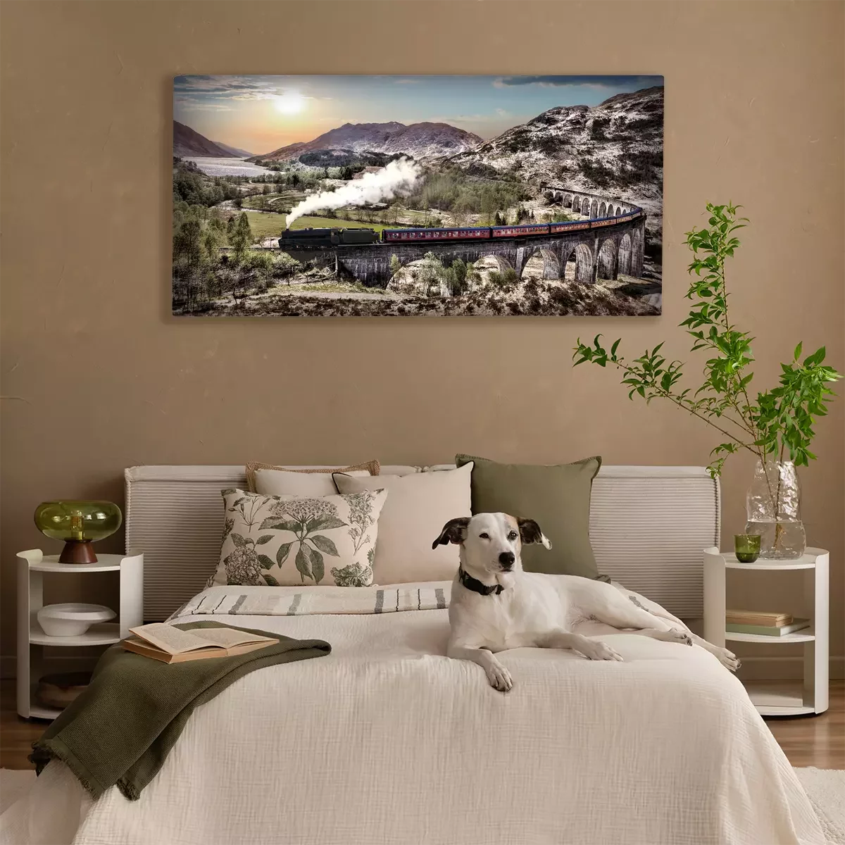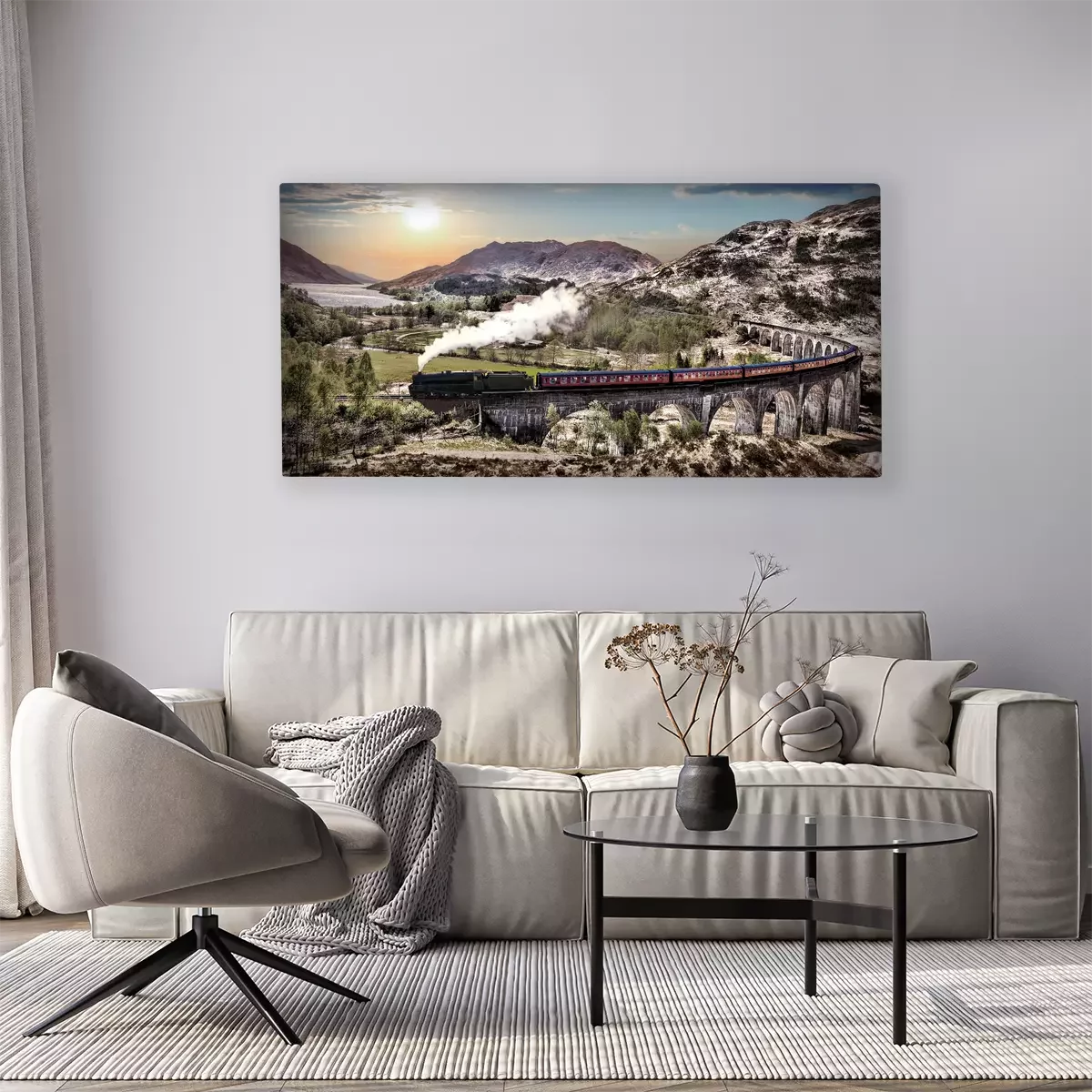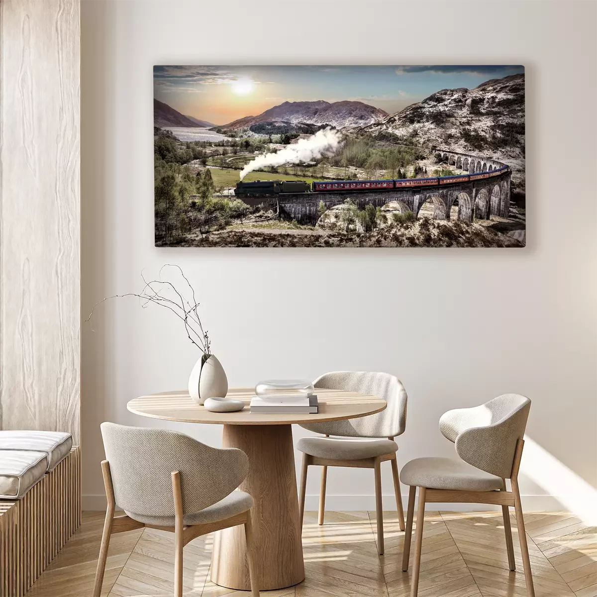 Een trein tussen bergen en meren bij zonsondergang