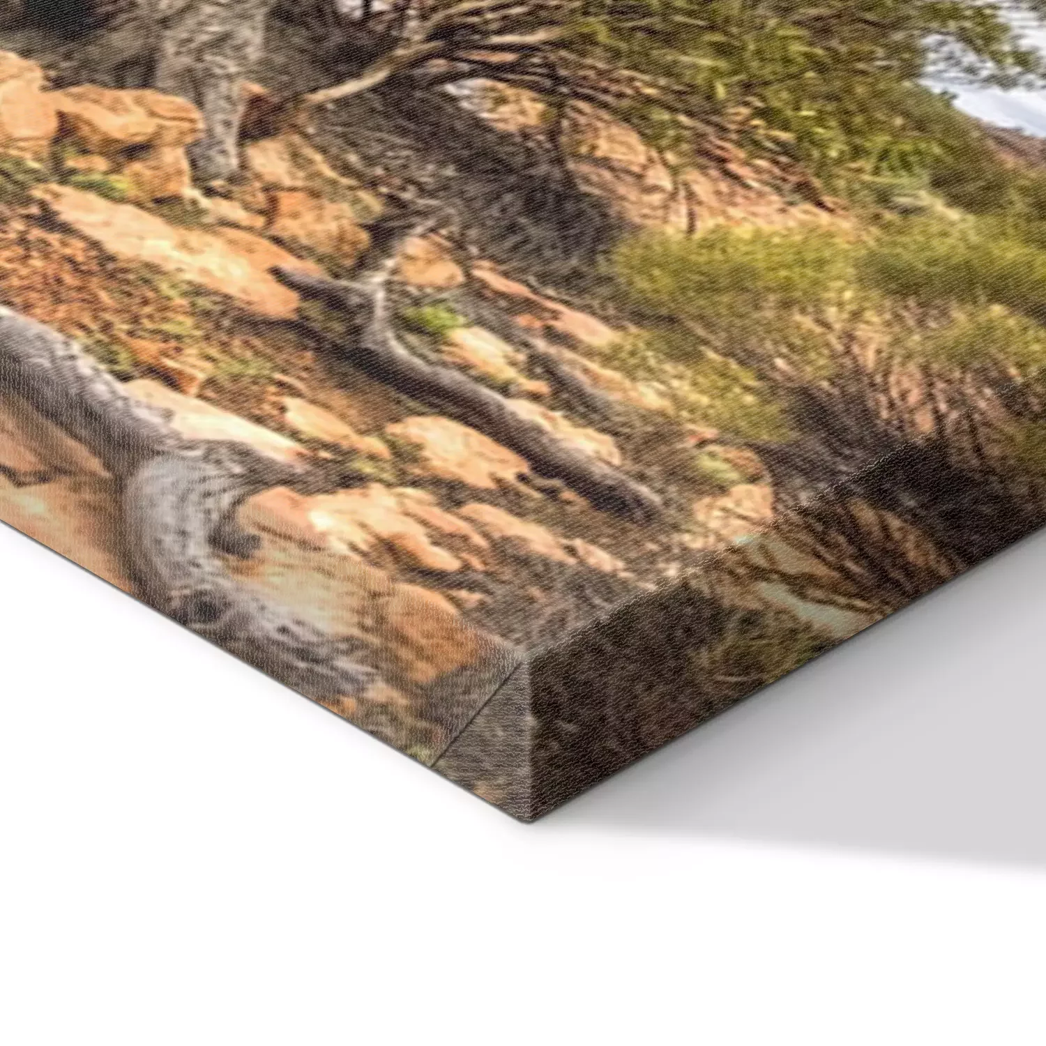 De print wordt aangebracht op hoogwaardig canvas dat op een schildersweefgetouw (spieraam) wordt gespannen. Omdat de print de zijranden bedekt, hoeft het ontwerp niet met een extra kader te worden omlijst. Wij raden ook composities aan die uit meerdere foto's bestaan en zo een coherente compositie vormen.