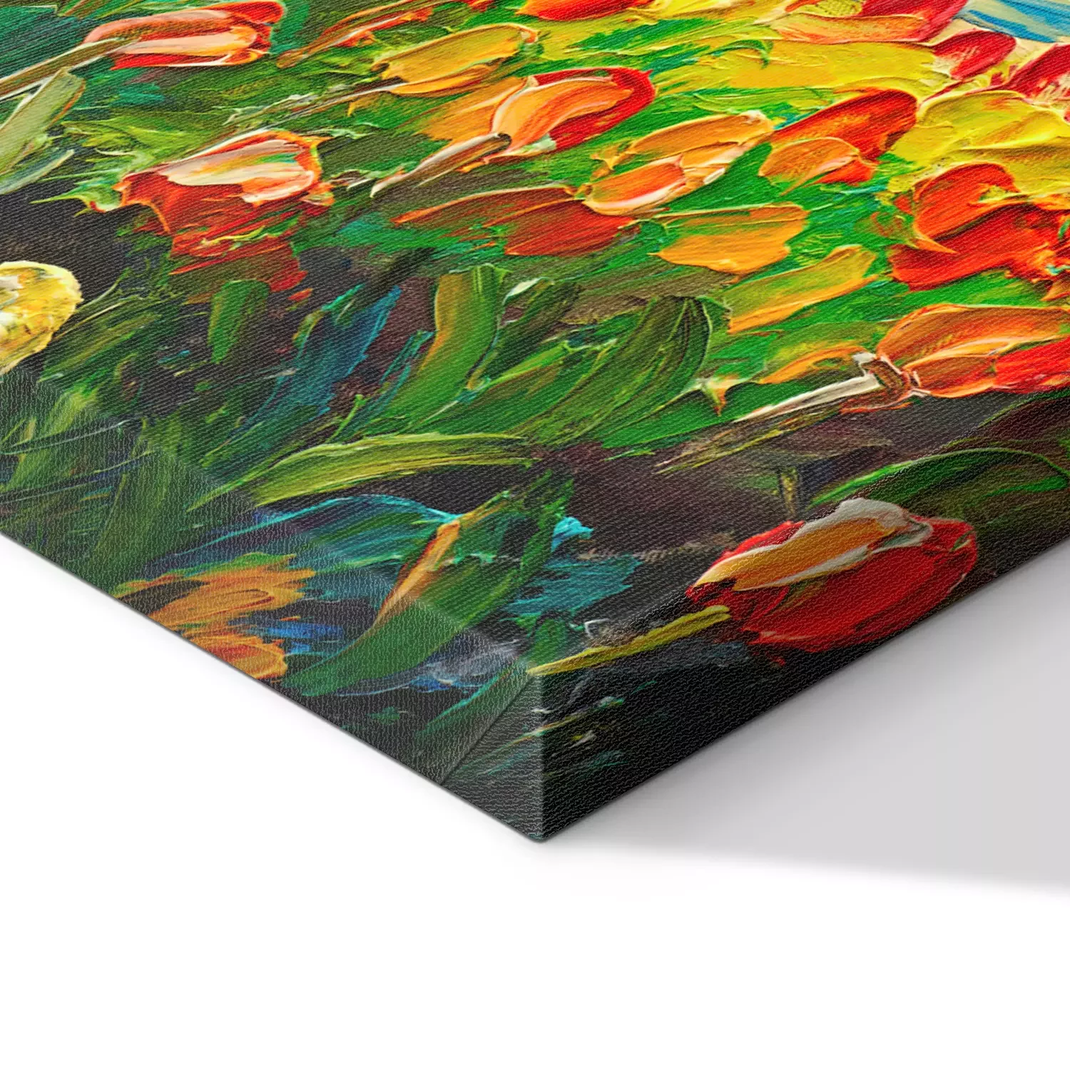 Een veld met rode en gele tulpen in schilderachtige stijl
