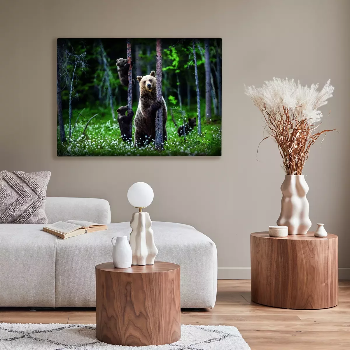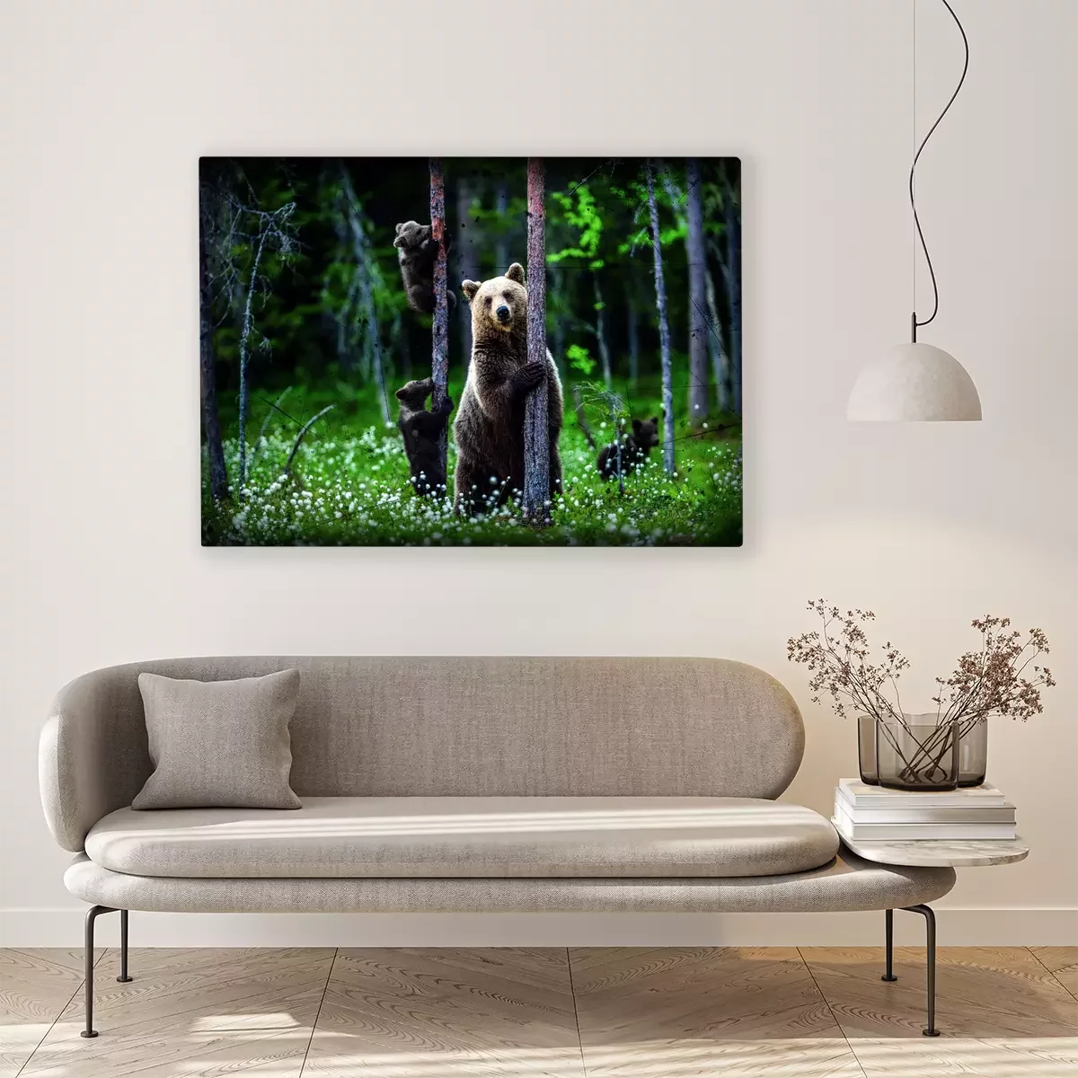 Een volwassen beer loopt met haar jongen tussen de bomen.