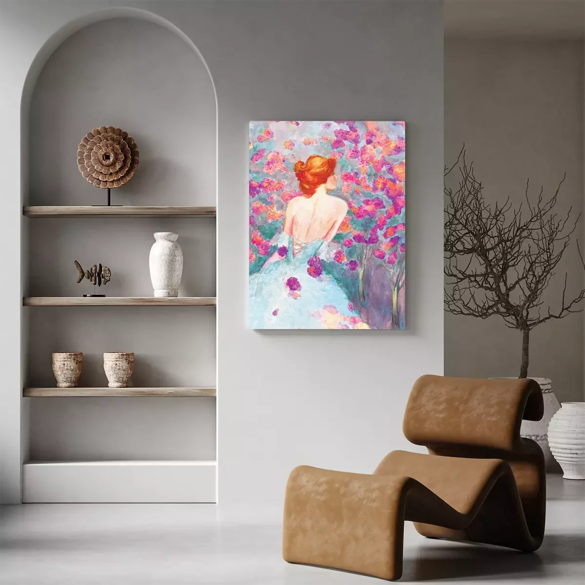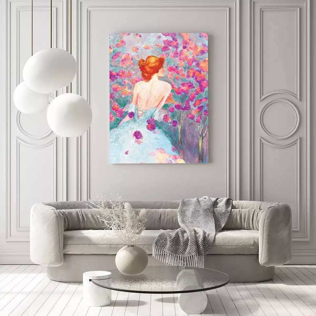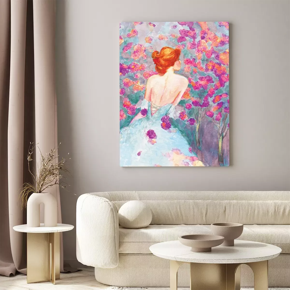 Een vrouw in een delicate aquarel met een bloemenmotief