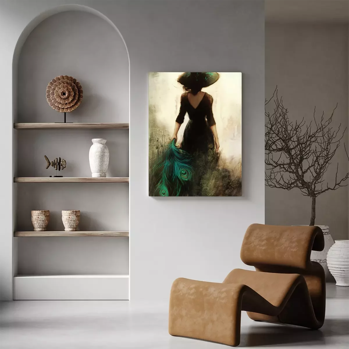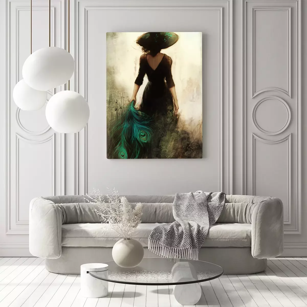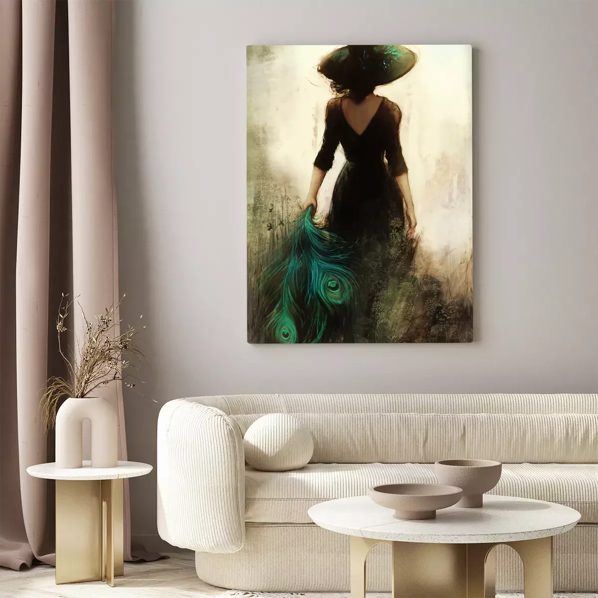 Een vrouw met een hoed met pauwenveren heeft haar rug naar haar toegekeerd
