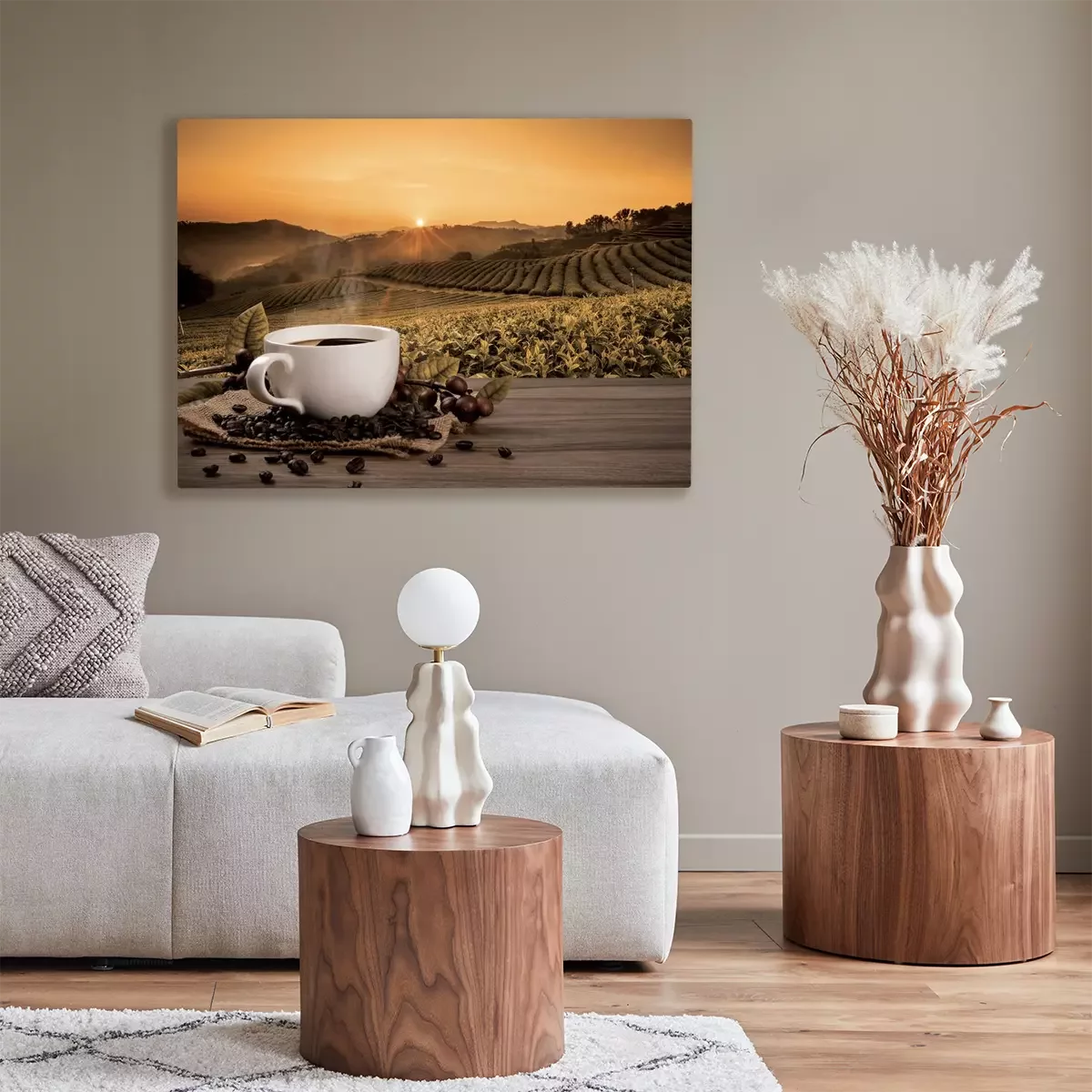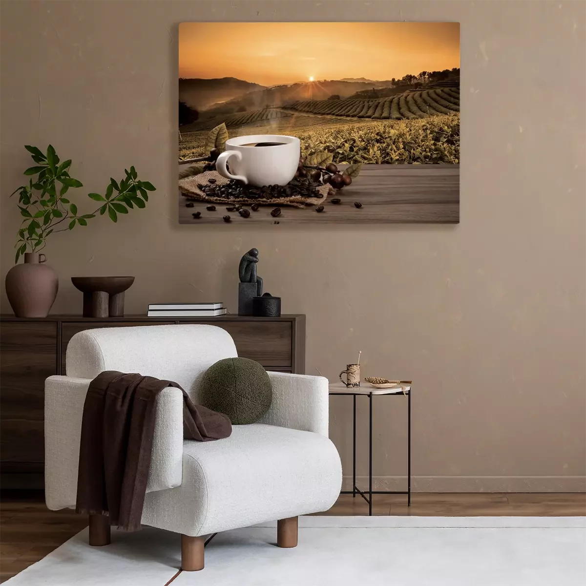 Canvas: Een warme kop koffie tegen de achtergrond van de ondergaande zon
