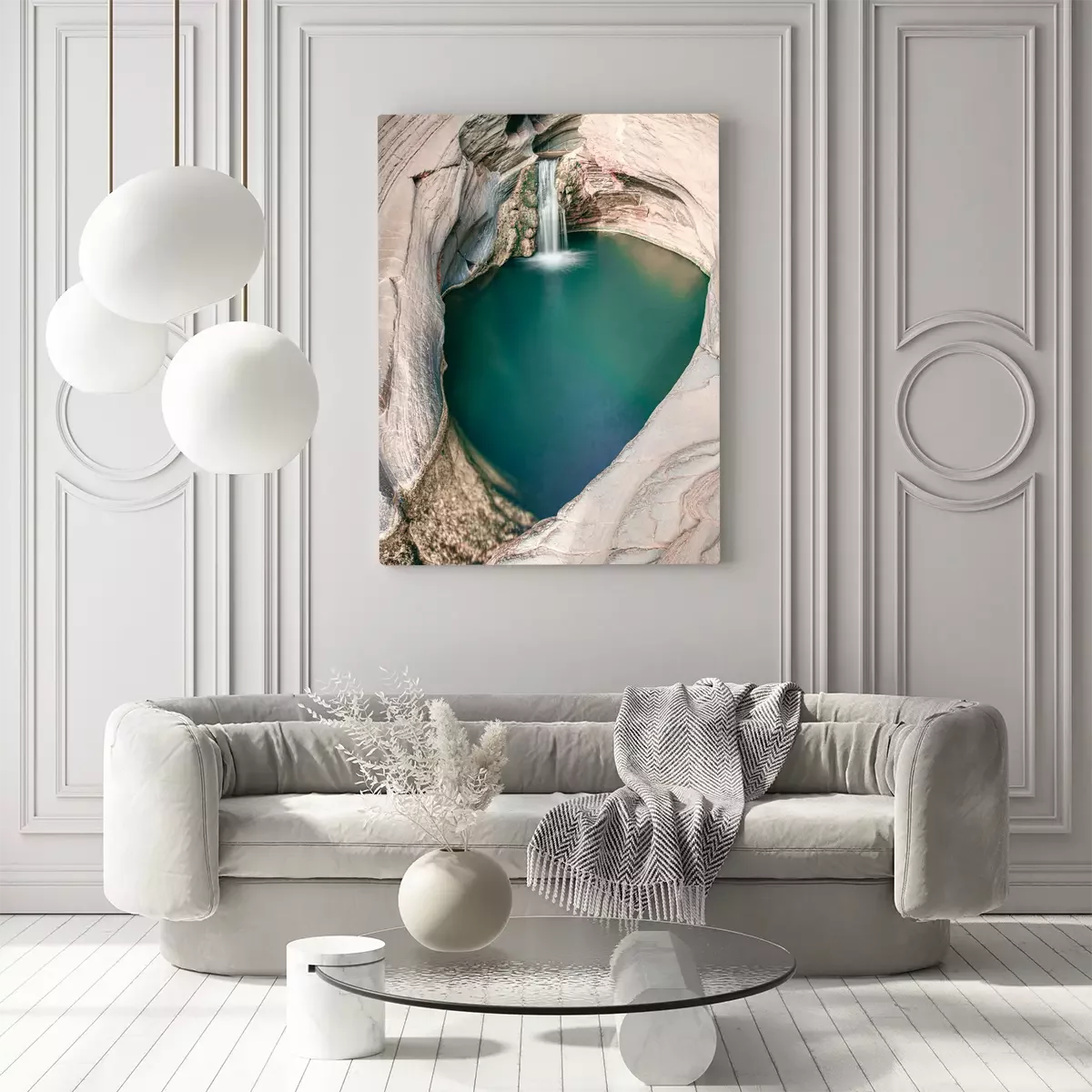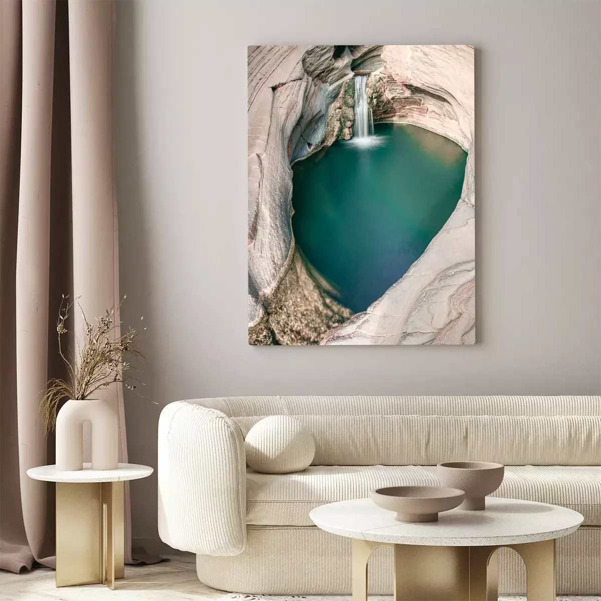 Een waterval die in een turquoise poel in de rotsen stroomt