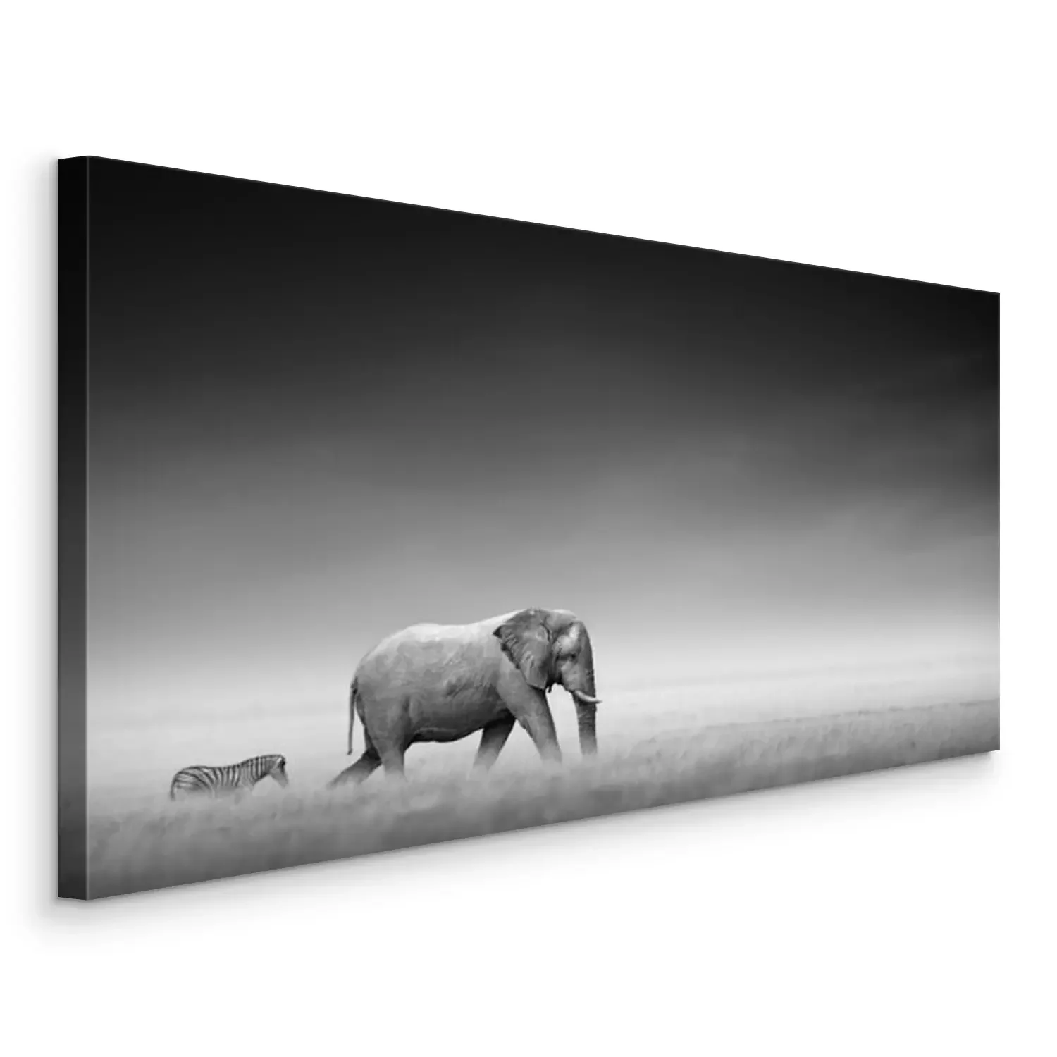 Canvas: Een zebra volgt een olifant in het hoge gras.
