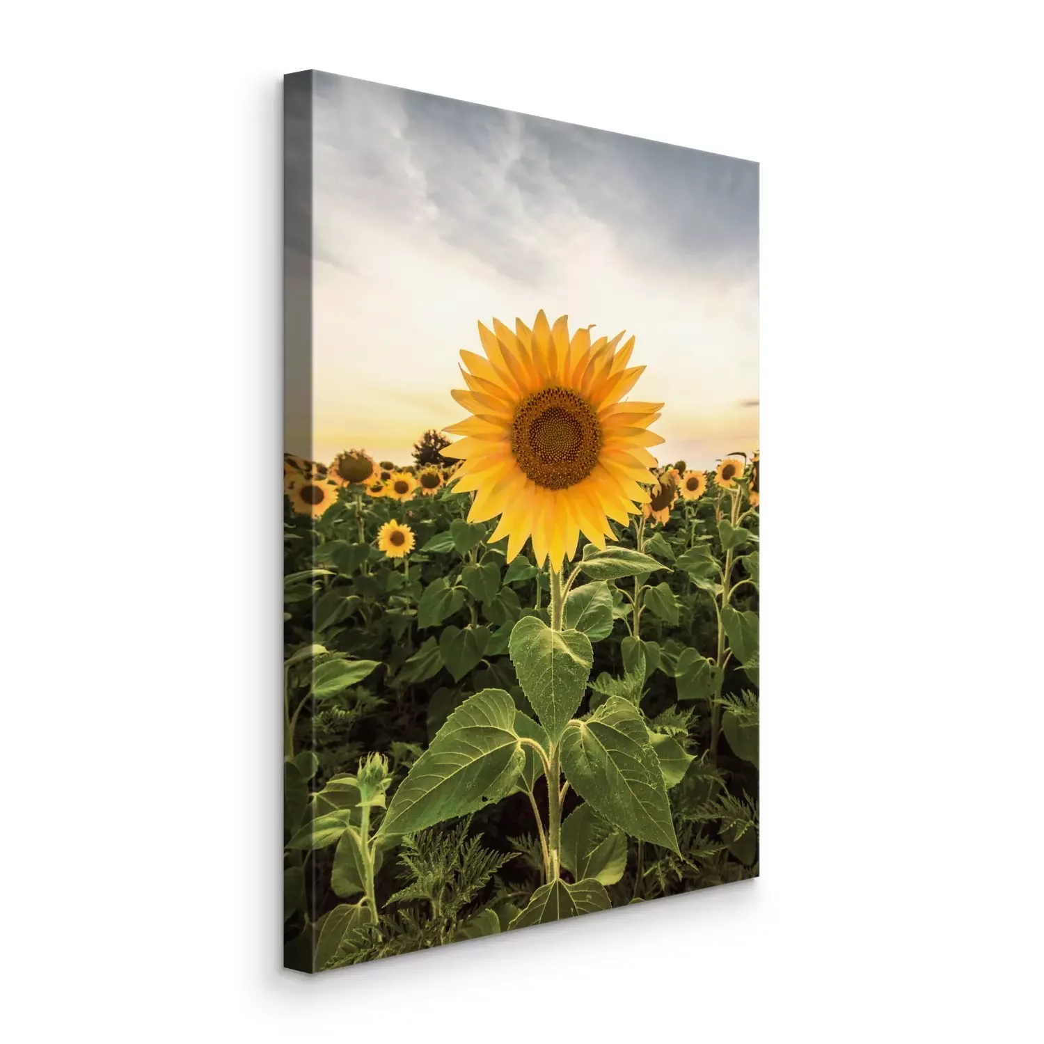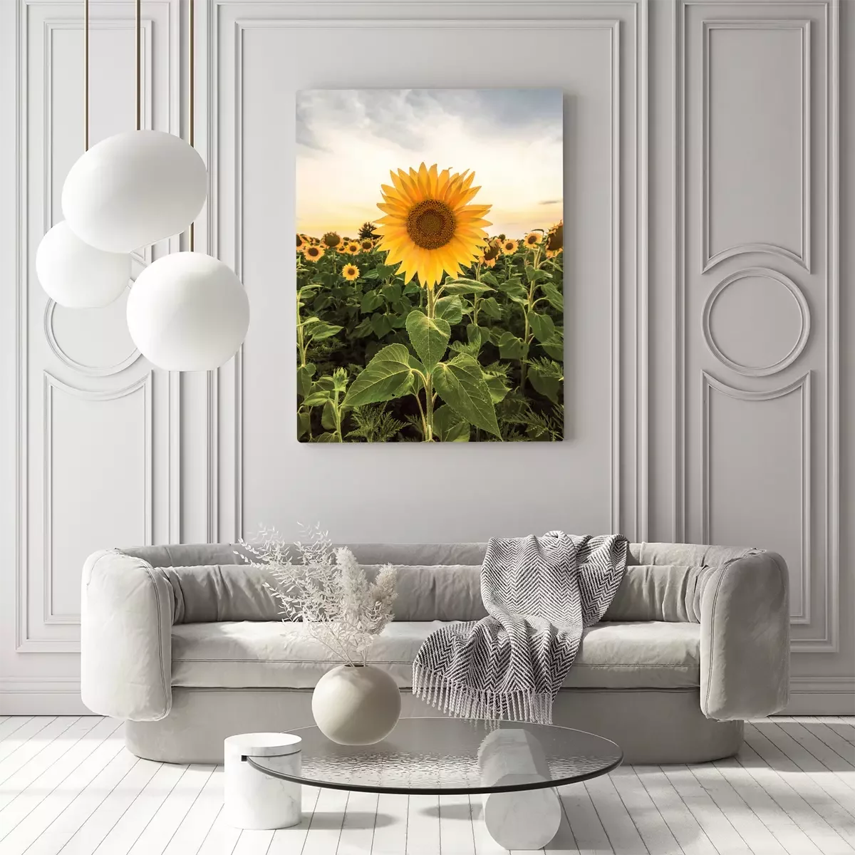 Een zonnebloem op de voorgrond met een veld zonnebloemen op de achtergrond