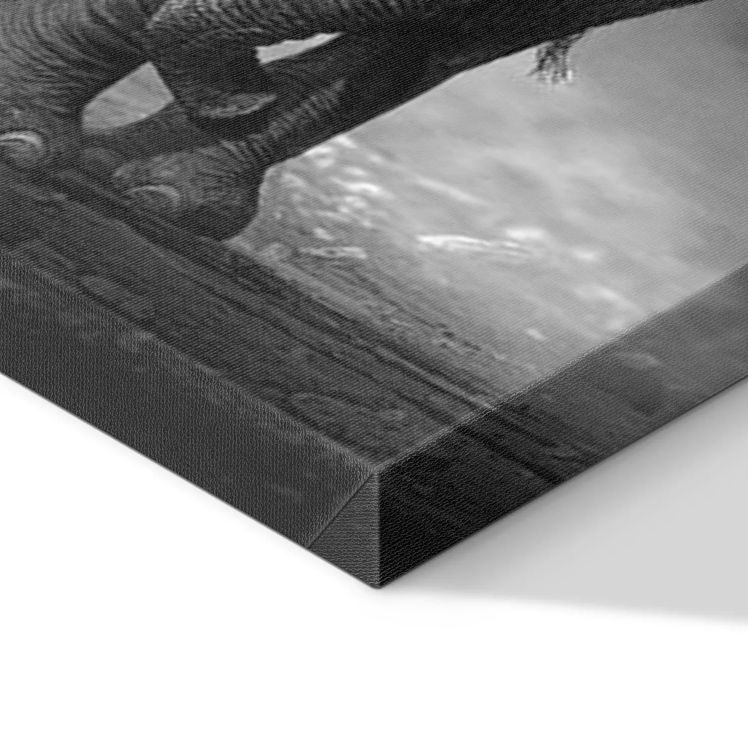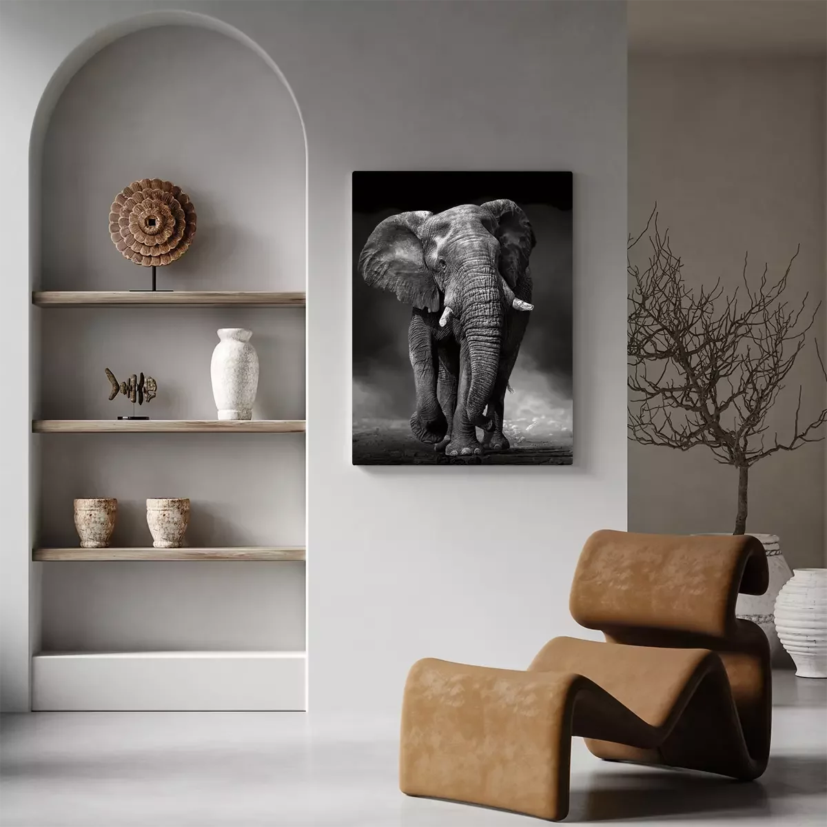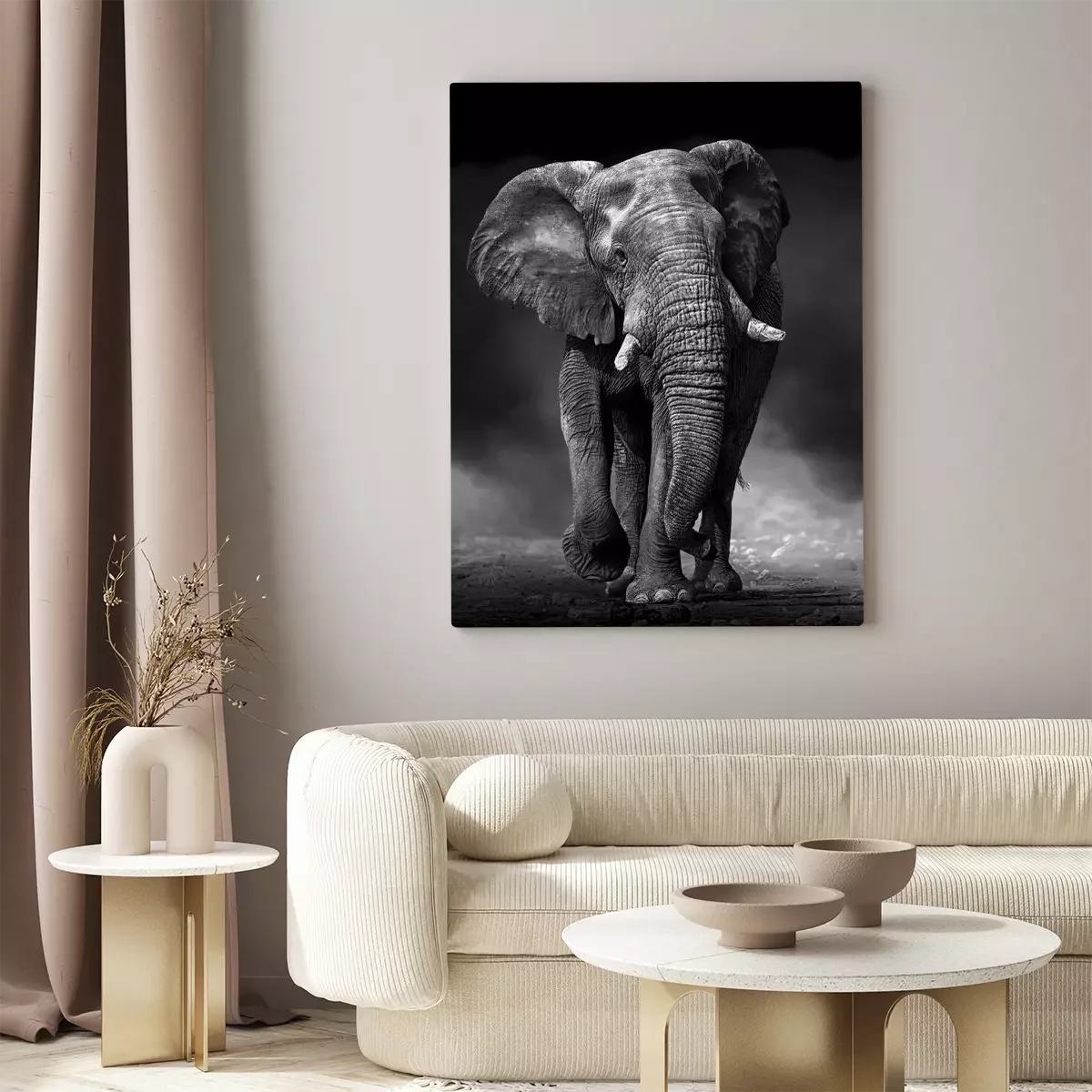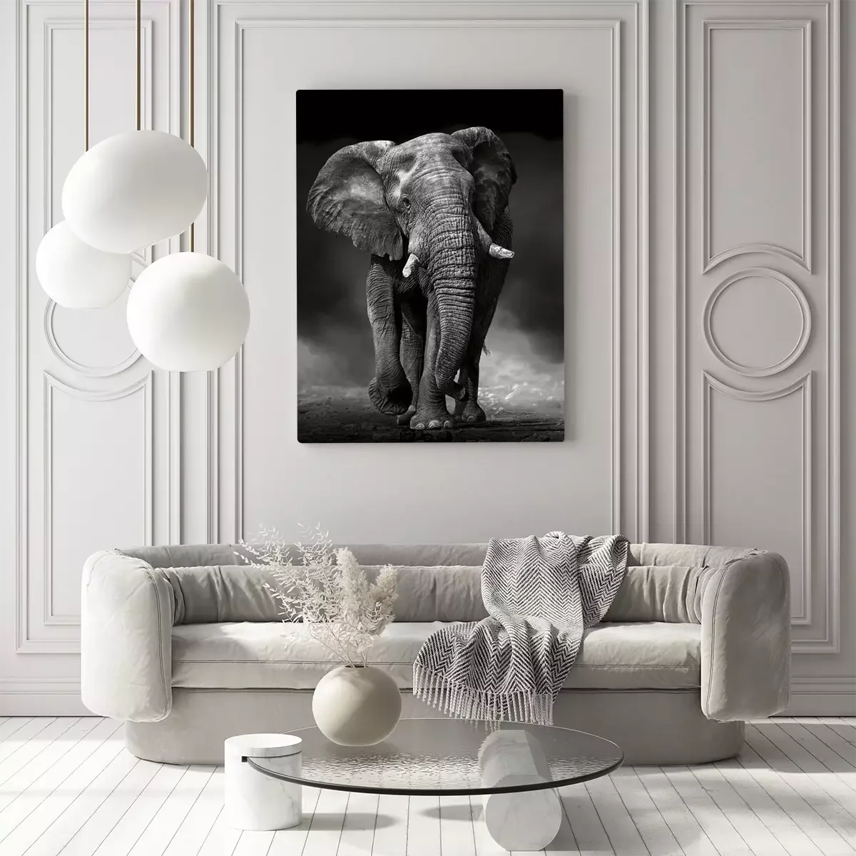 Een zwart-witfoto van een machtige olifant