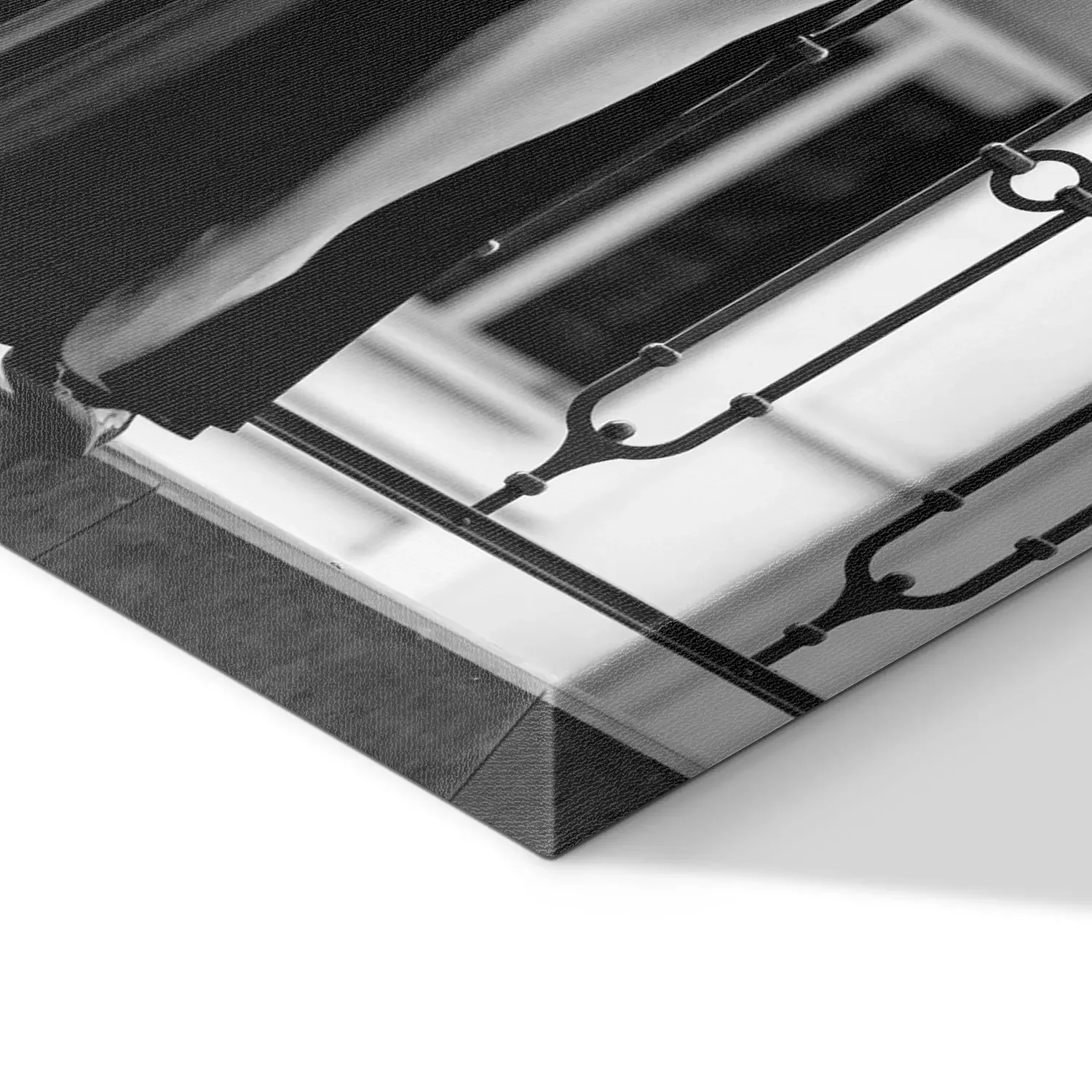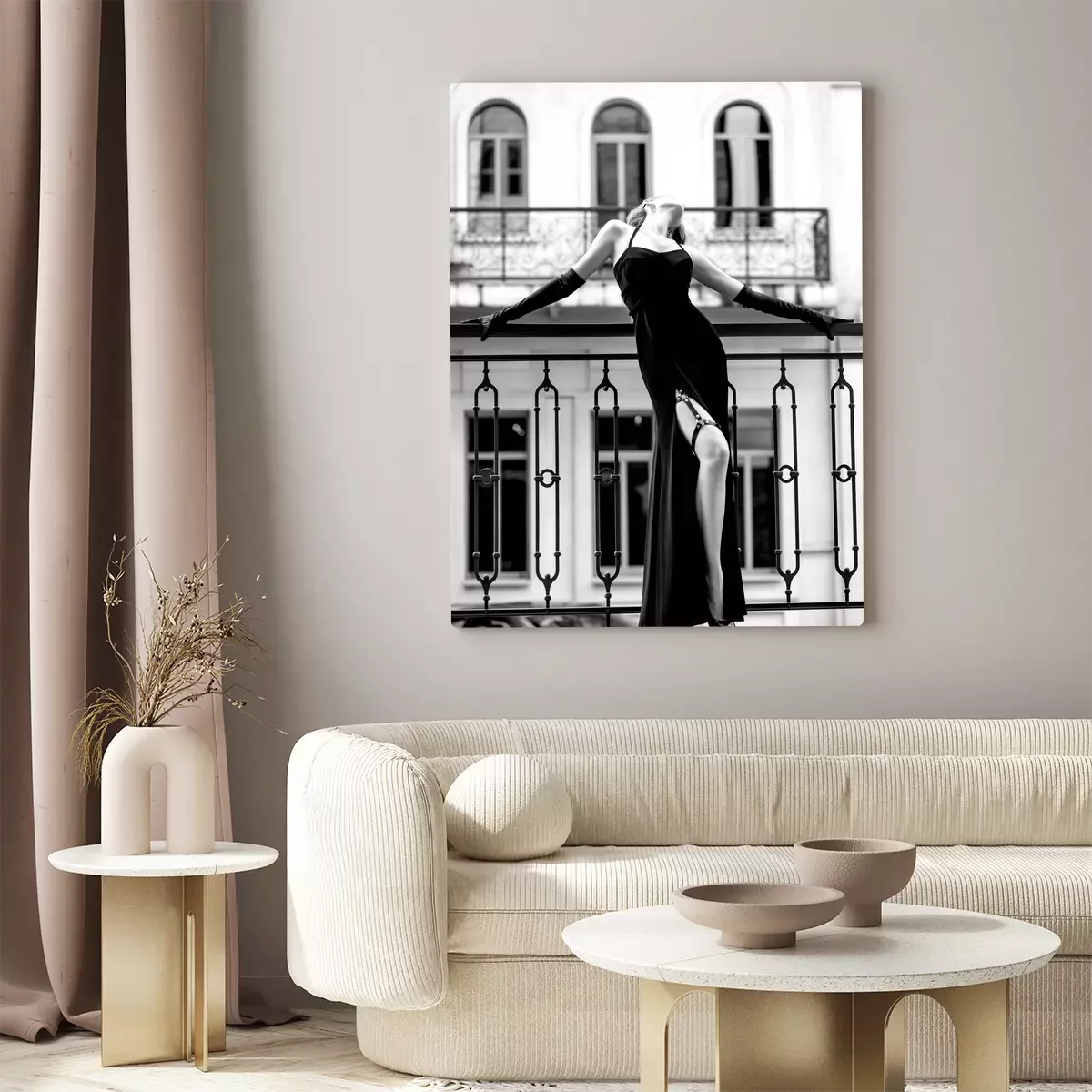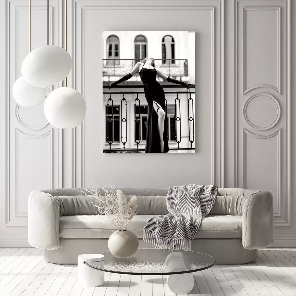 Een zwart-witfoto van een vrouw in een avondjurk op een balkon.