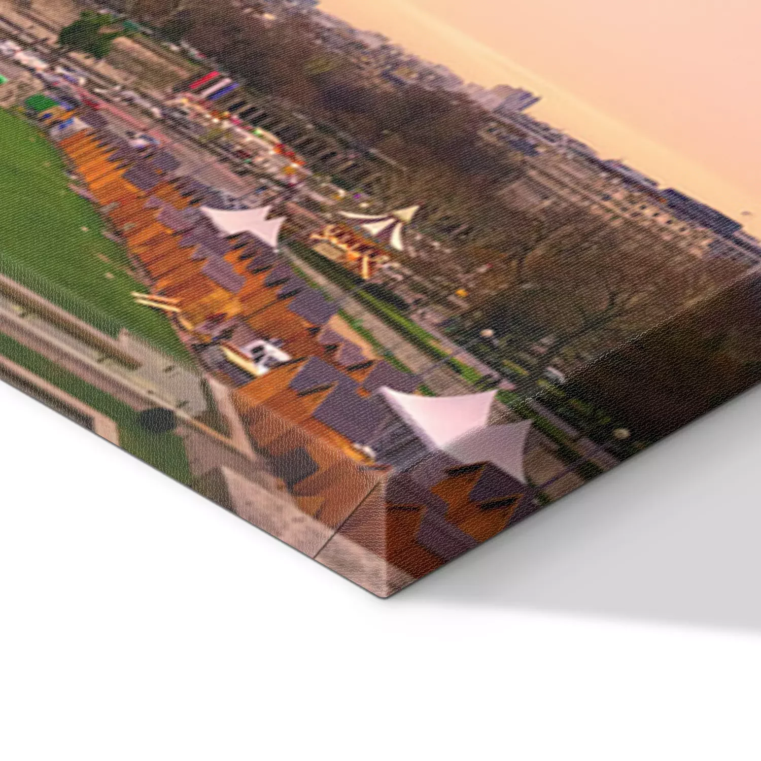 De print wordt aangebracht op hoogwaardig canvas dat op een schildersweefgetouw (spieraam) wordt gespannen. Omdat de print de zijranden bedekt, hoeft het ontwerp niet met een extra kader te worden omlijst. Wij raden ook composities aan die uit meerdere foto's bestaan en zo een coherente compositie vormen.
