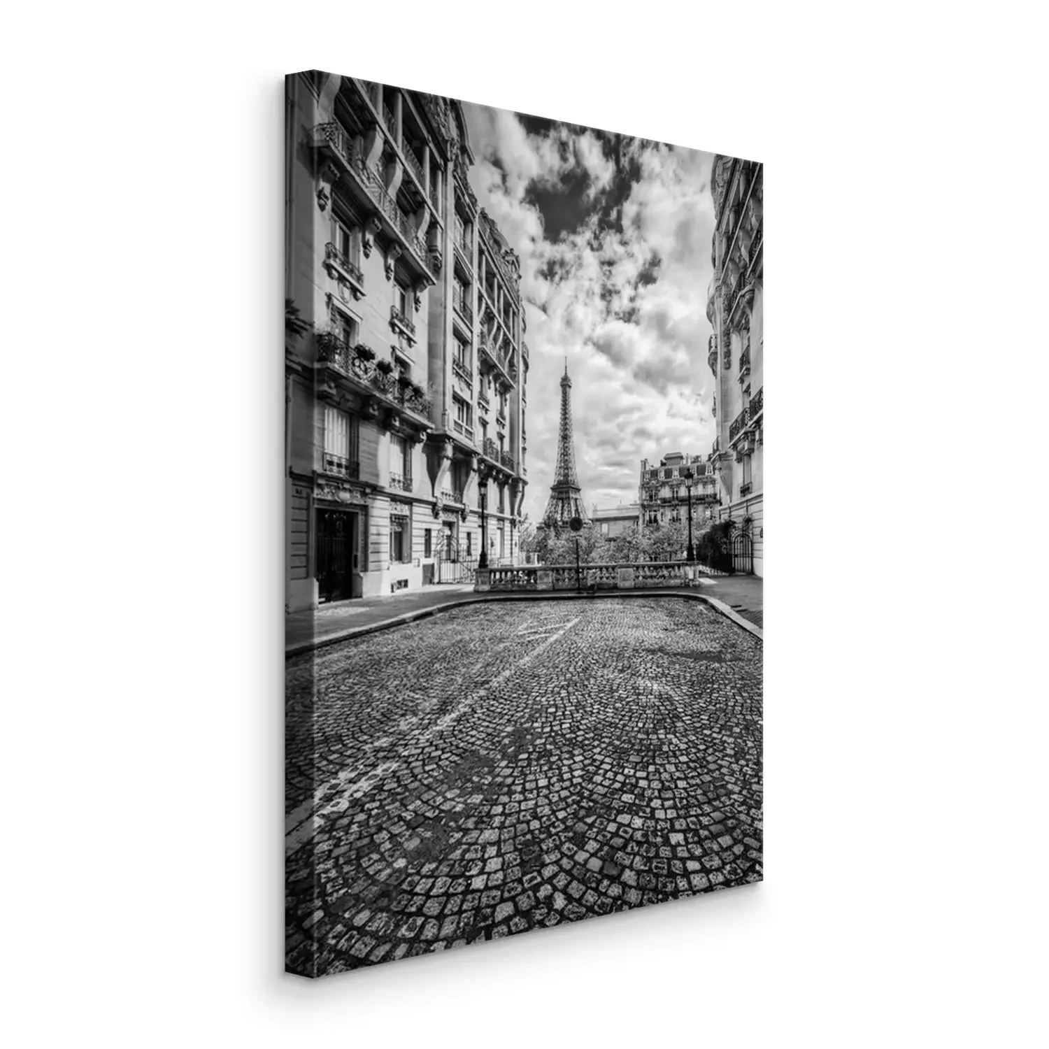 Canvas: Eiffeltoren gezien vanaf de straat in Parijs, Frankrijk. Zwart en wit