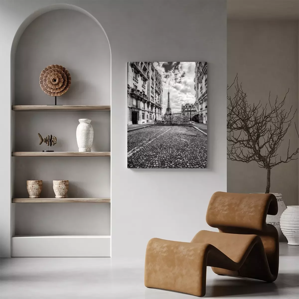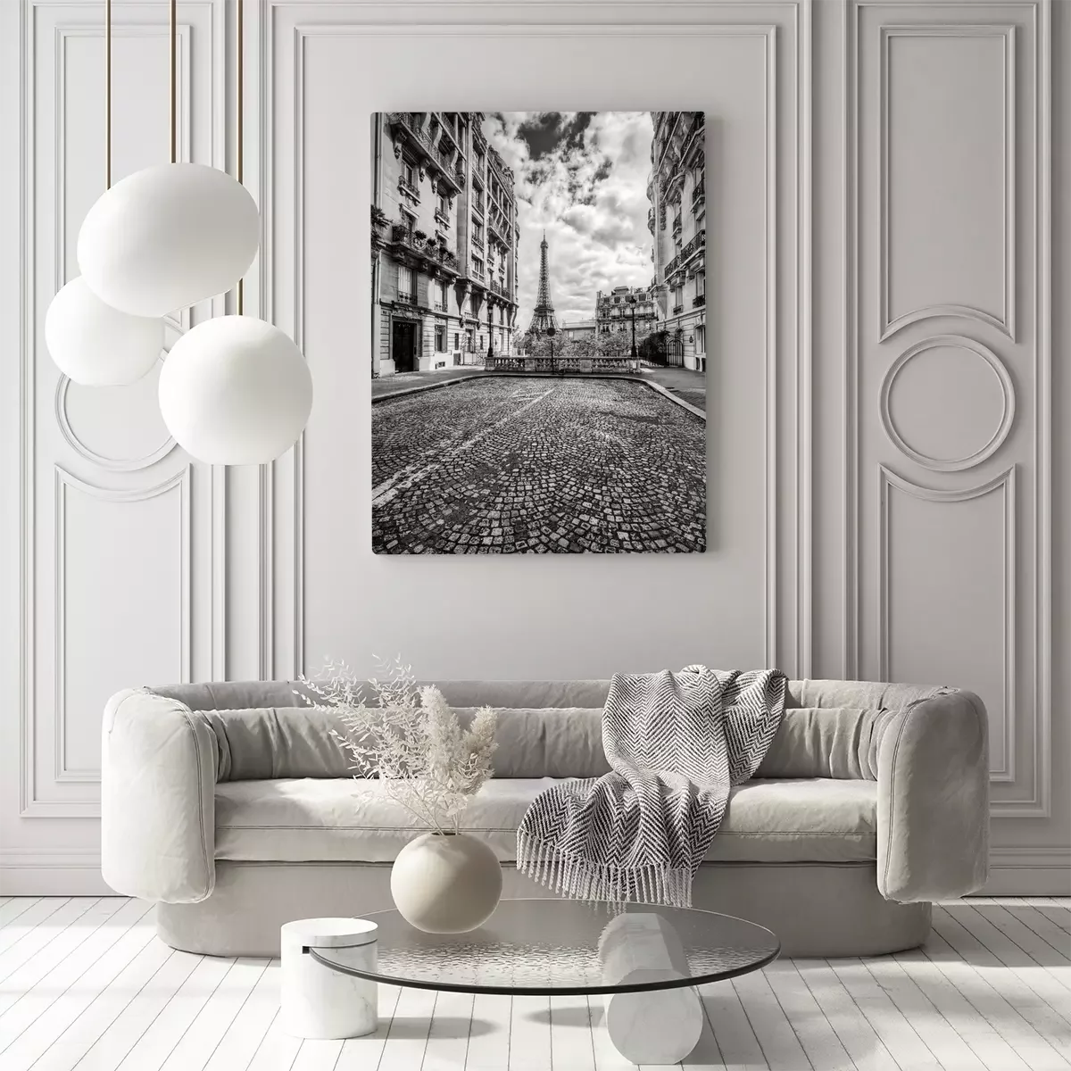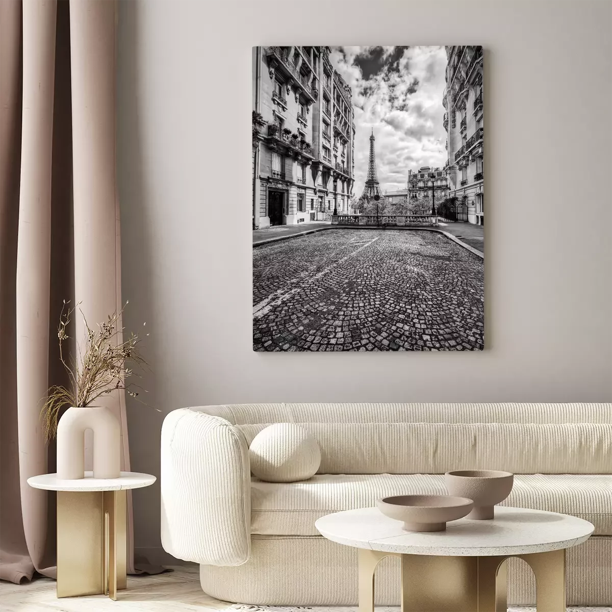 Canvas Eiffeltoren gezien vanaf de straat in Parijs, Frankrijk. Zwart en wit