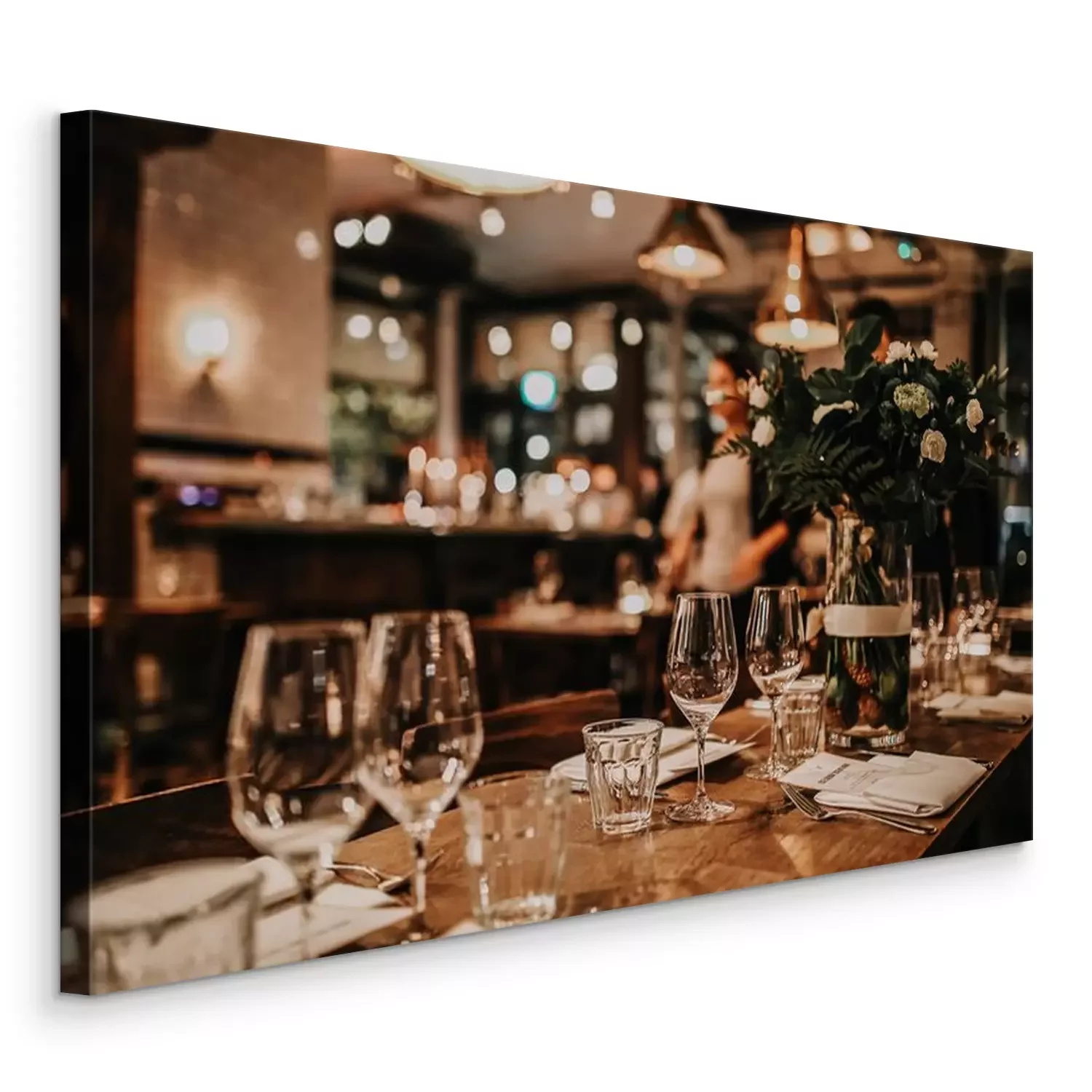 Canvas Elegant table set up for a romantic dinner. Concept of catering, hospitality and private dining. Selective focus on the glassware.
