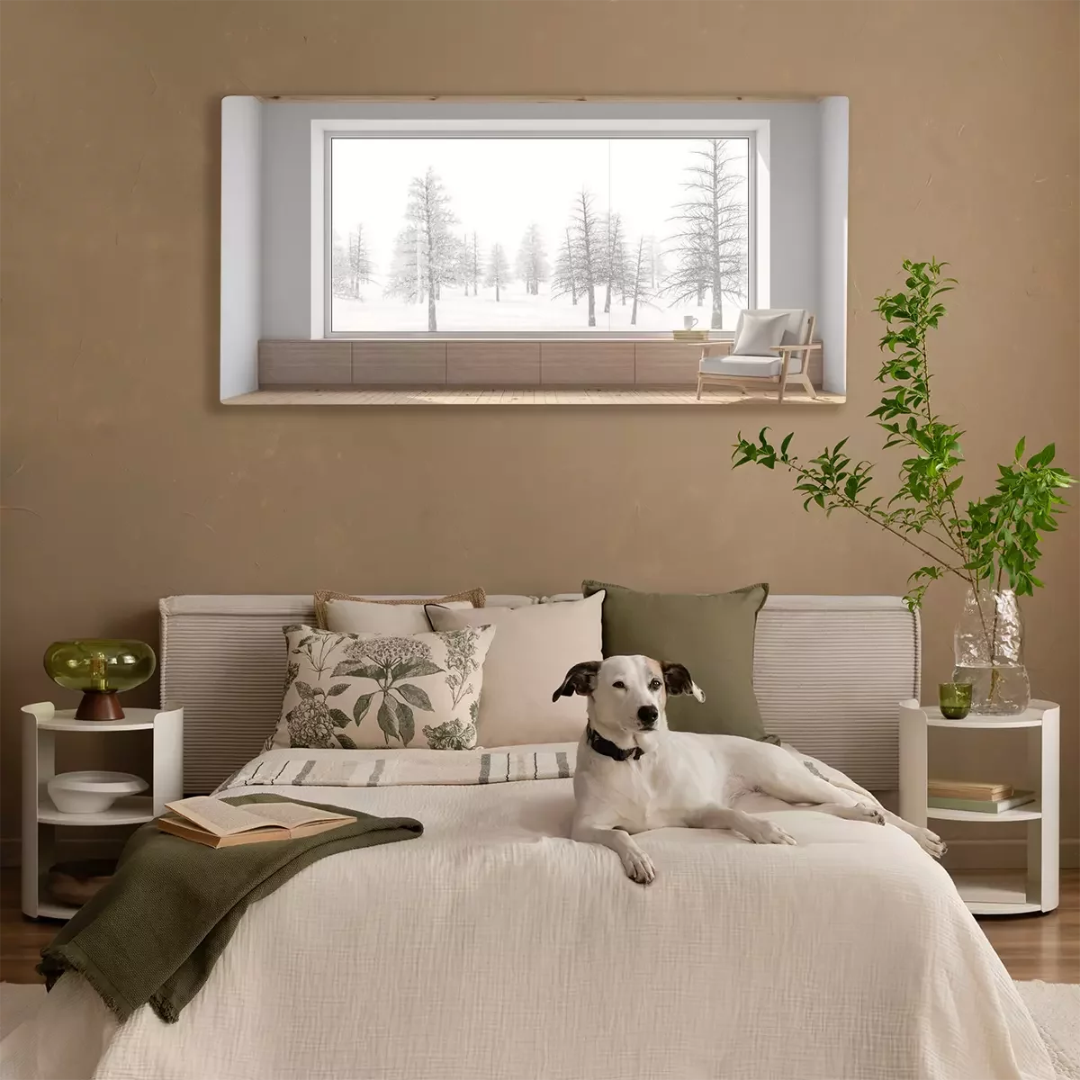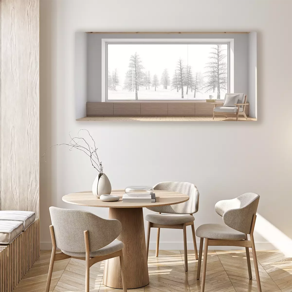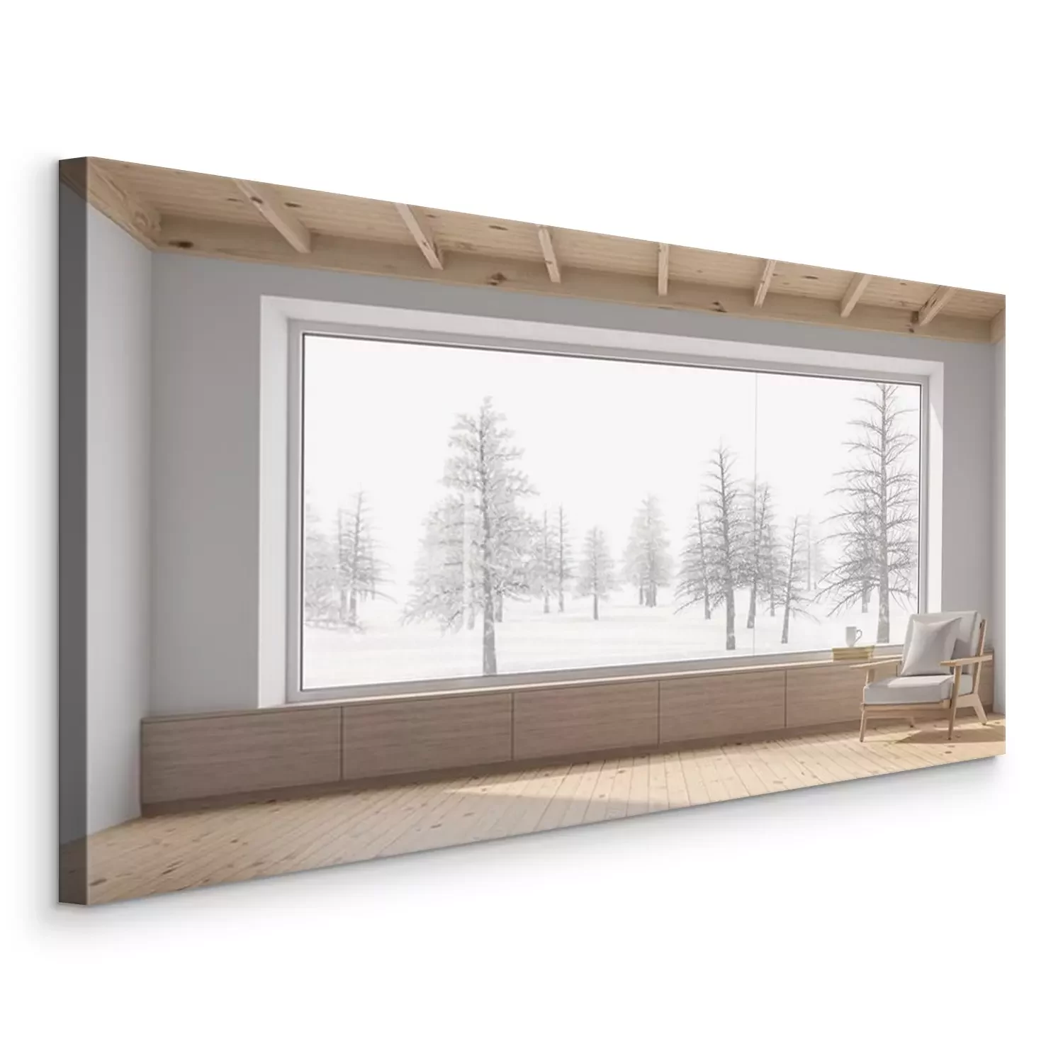 Canvas Empty room with snow scene background 3d render,There are white wall,wooden floor and ceiling,wood seat,decorate with fabric chair.There are big  windows look out to see nature view.