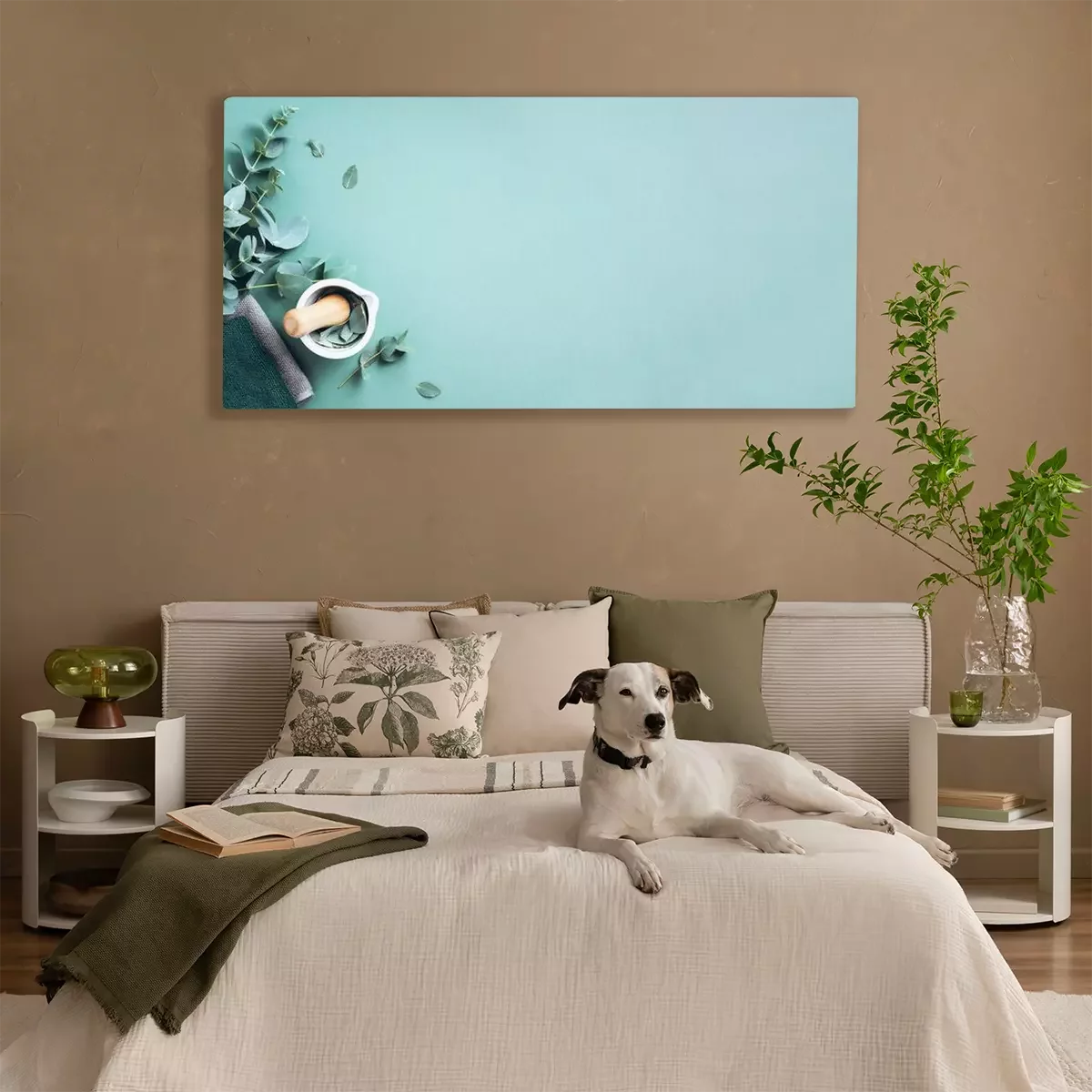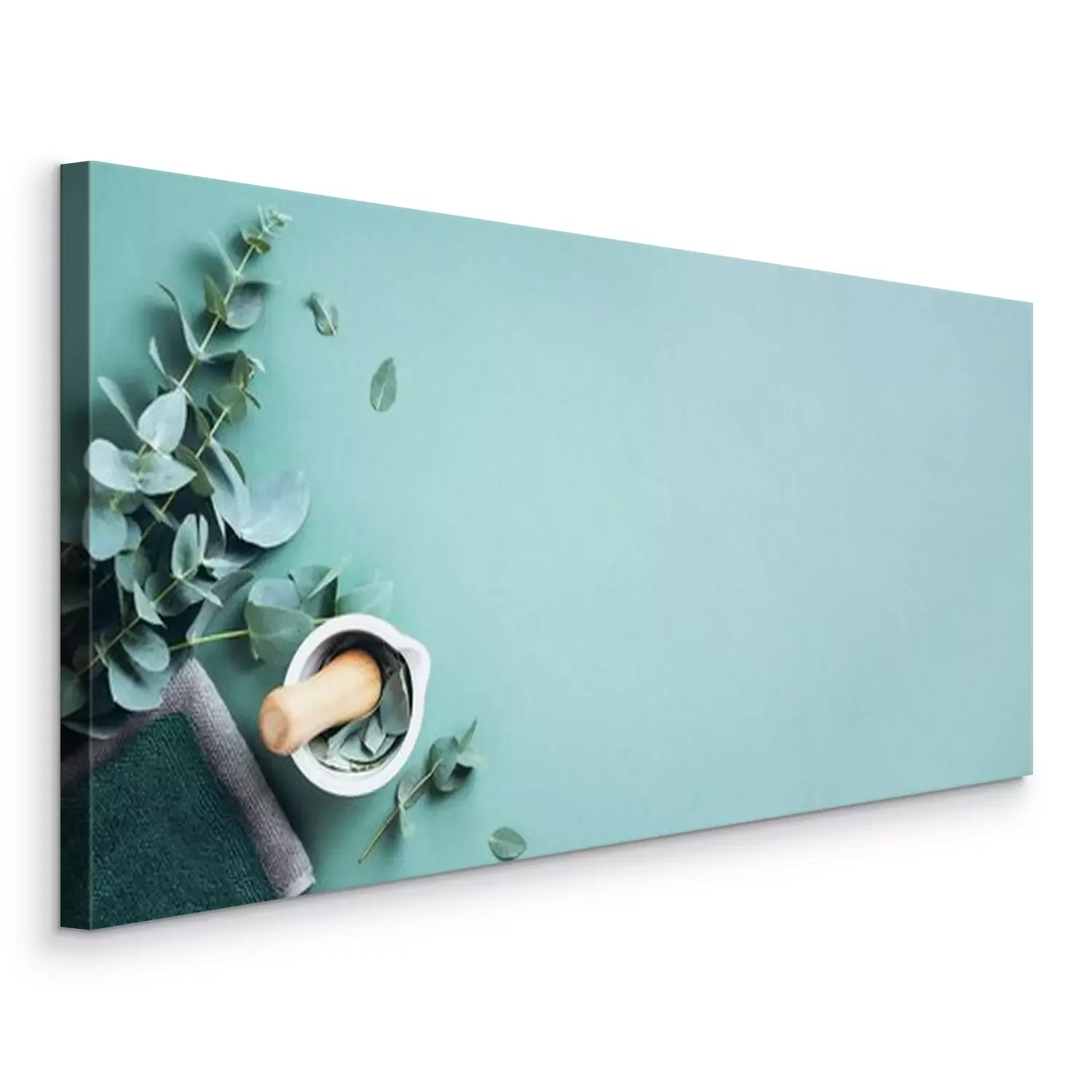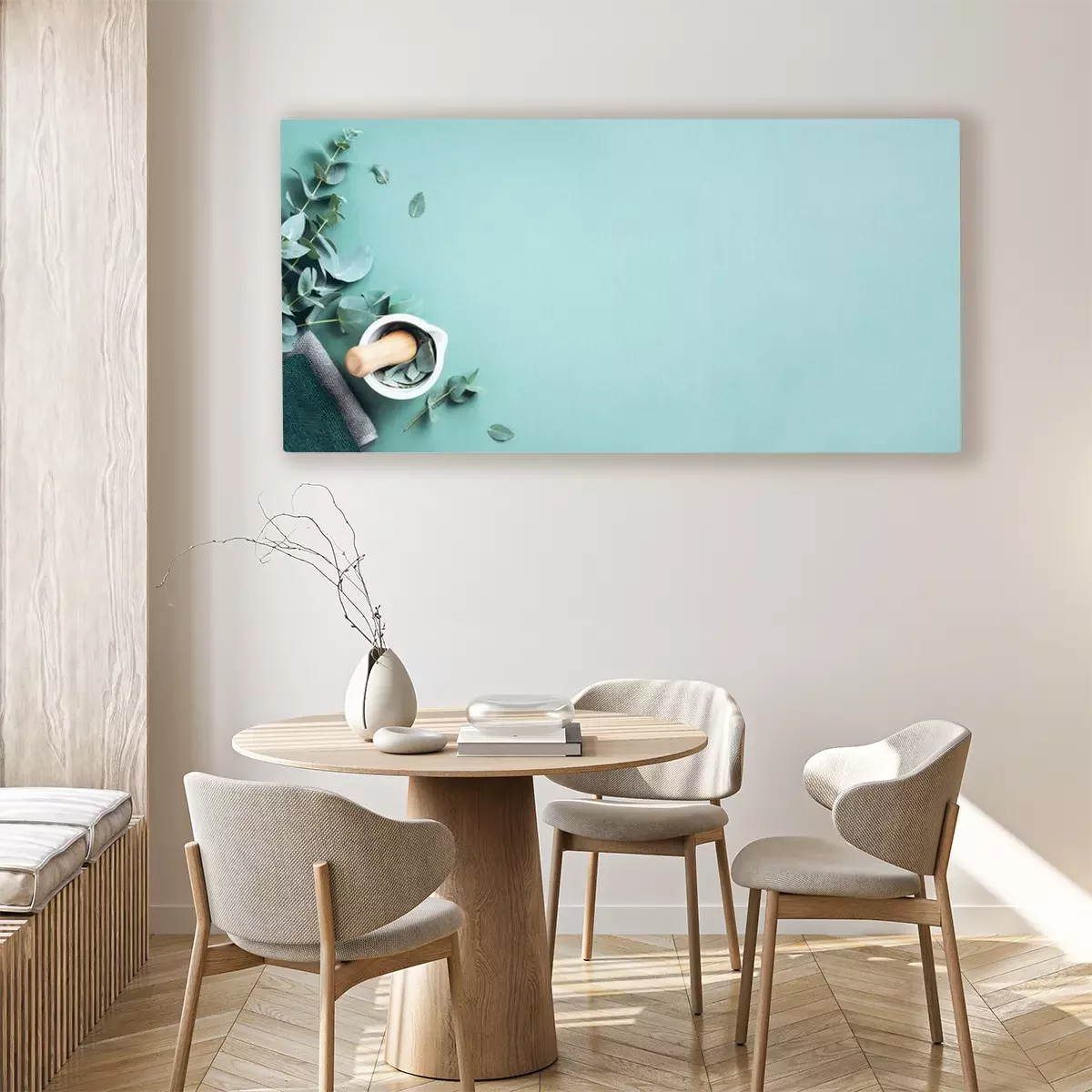 Canvas: Eucalyptus leaves and white mortar, pestle. Ingredients for alternative medicine and natural cosmetics. Beauty, spa concept